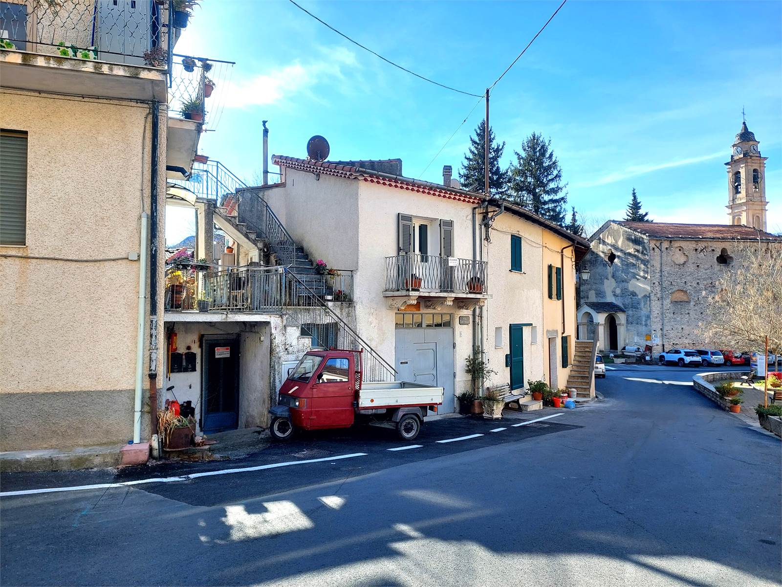 The apartment is on the first and last floor of a small house composed of three units, located in the village's central square and therefore adjacent to the public parking lot and the village's shops and services.
