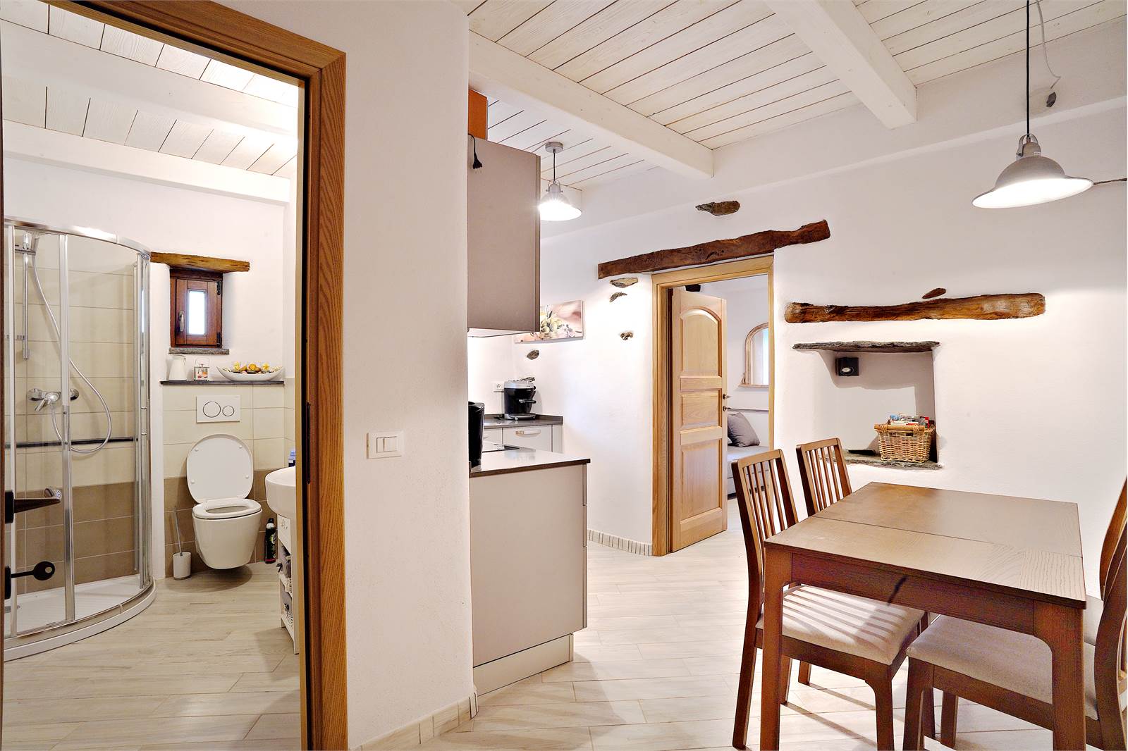 On the ground floor of the main accommodation, there are two double bedrooms, a spacious open-plan kitchen with high ceilings of five meters, where a skylight has been created to allow natural light to illuminate everything, a very large living room, a livable terrace of about 25 square meters, a bathroom with a whirlpool tub and a shower, and a laundry room, all furnished with high-quality furniture and respecting the historical nature of the farmhouse with restored reclaimed beams and exposed stone.