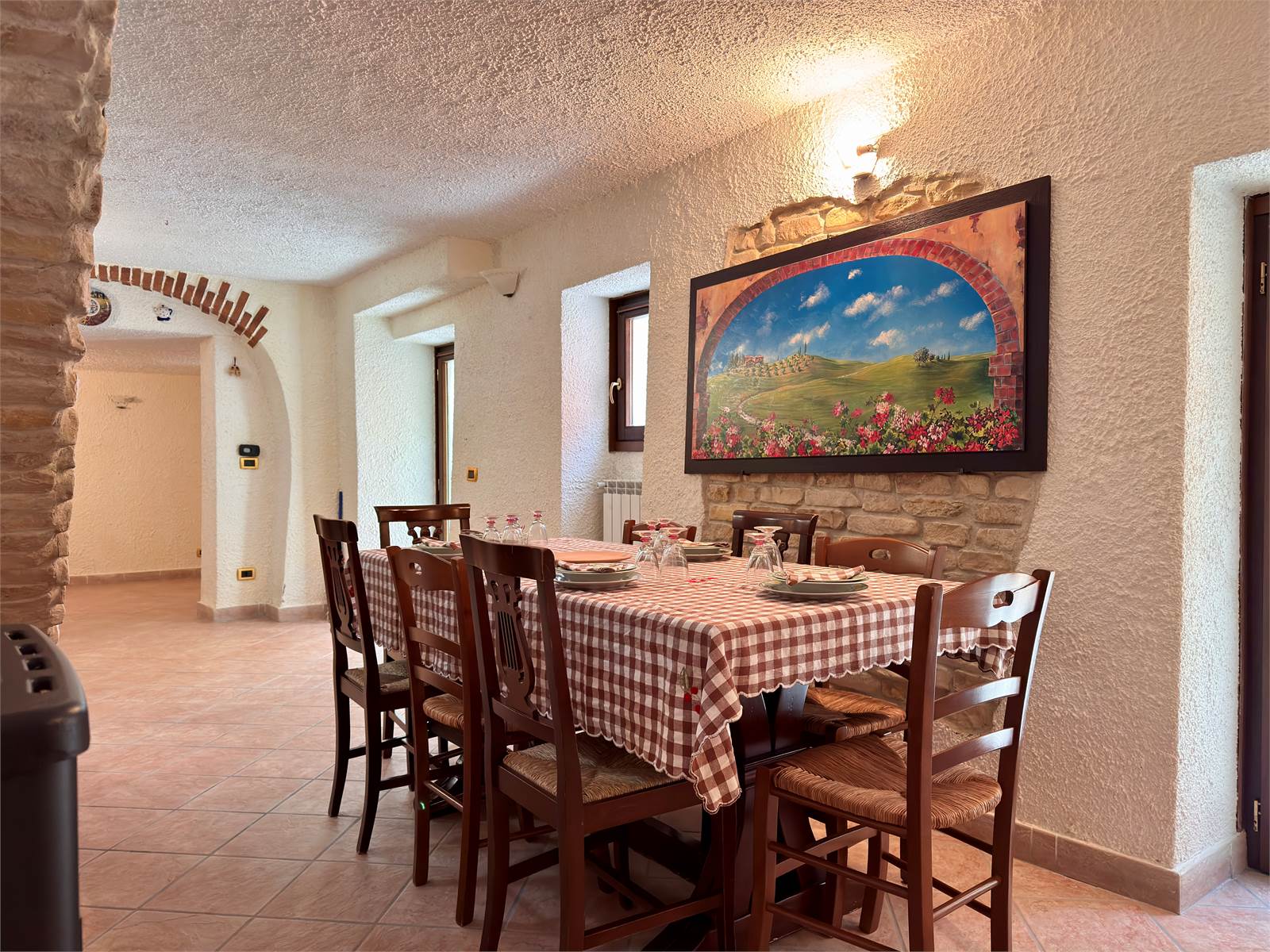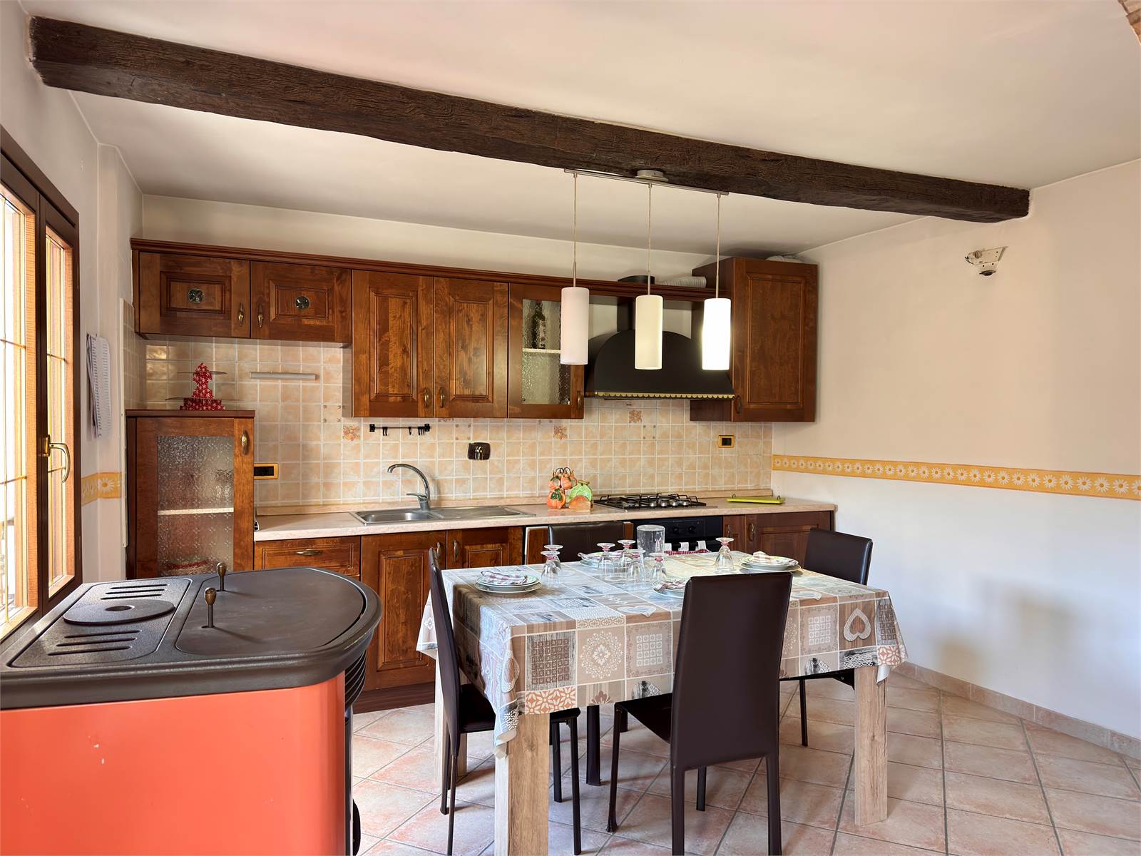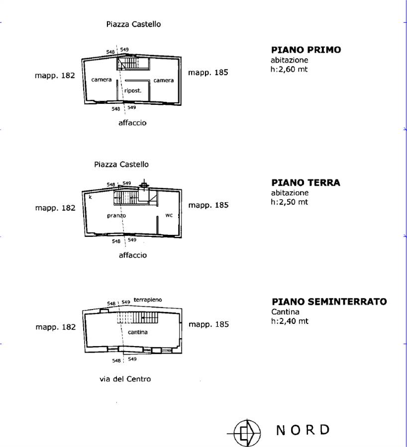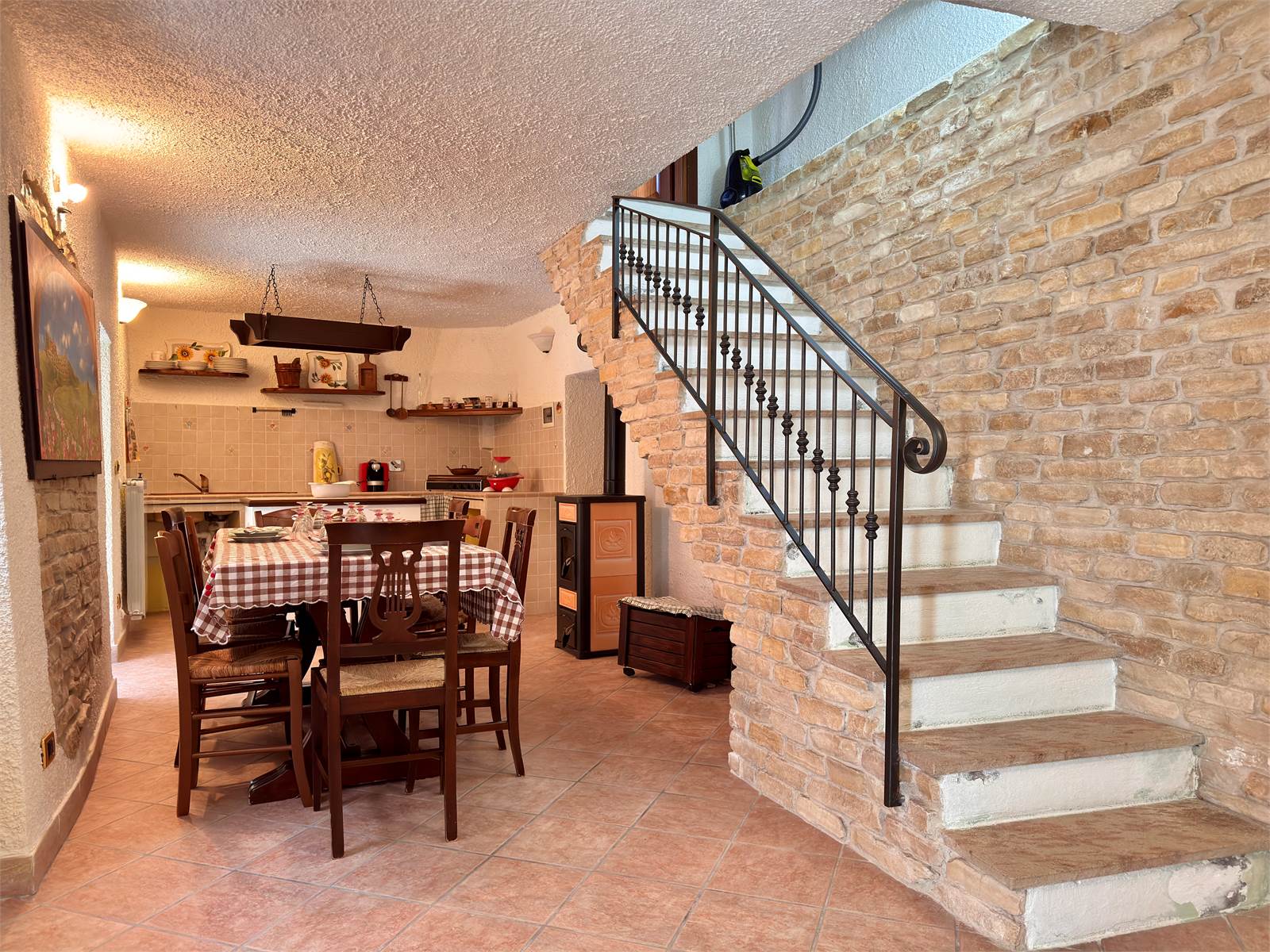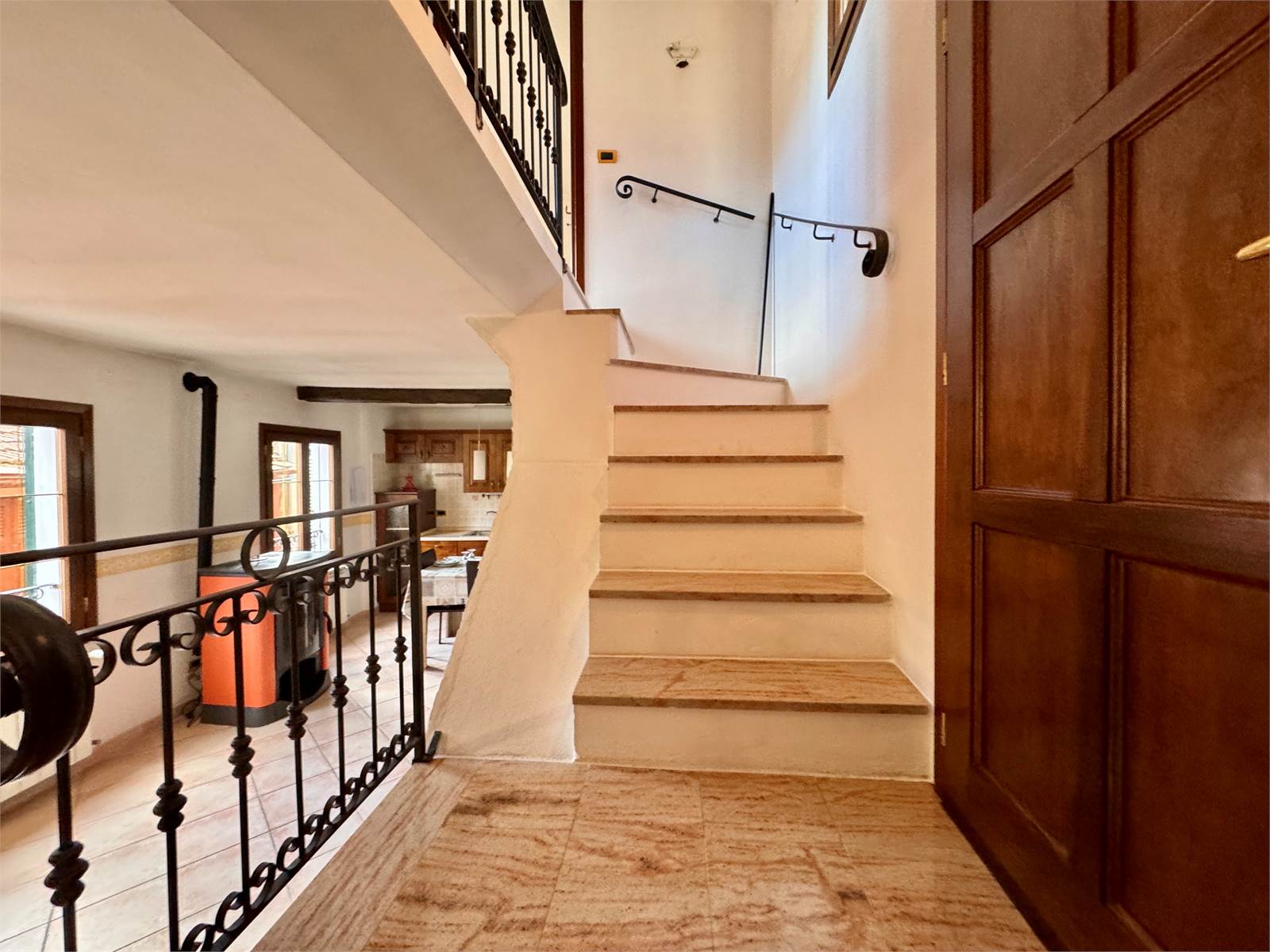 The house is situated on the main square, providing easy access, with public parking directly in front. It is a semi-detached home, free on two sides, arranged over three levels and featuring two independent entrances.