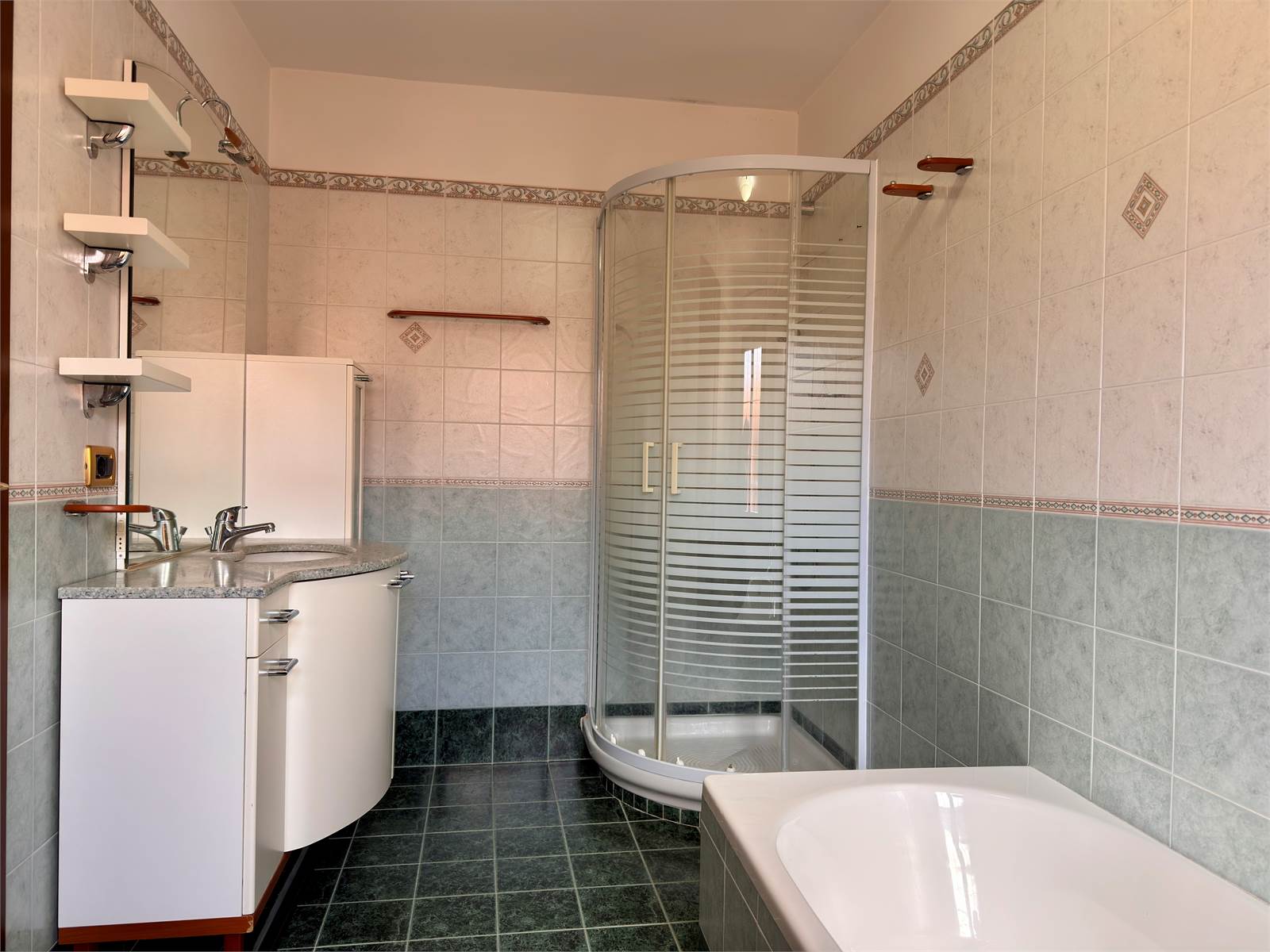 On the ground floor, there is a spacious living area with an open-plan kitchen and the main bathroom, equipped with both a shower and a bathtub. The kitchen includes all major appliances (oven, dishwasher, refrigerator, etc.).