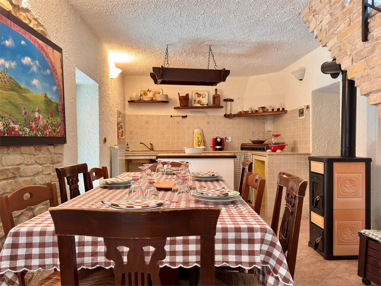 The lower-ground floor, connected internally via a masonry staircase, features a large tavern-style room complete with kitchen, wood-burning stove and a table that can accommodate up to 10 people. This level has two French doors providing access from the alley beneath the square, and it also includes a bathroom and a storage room.