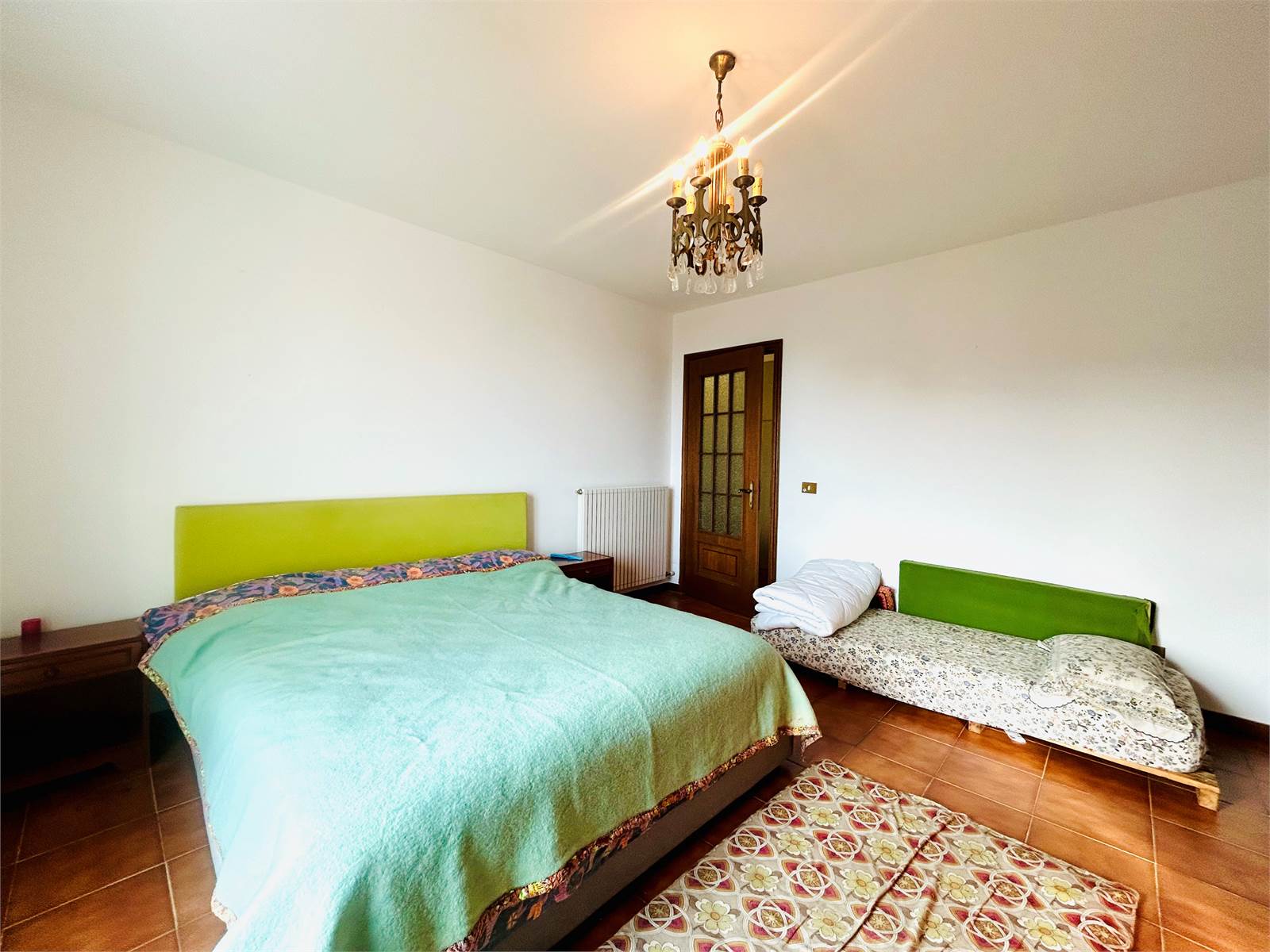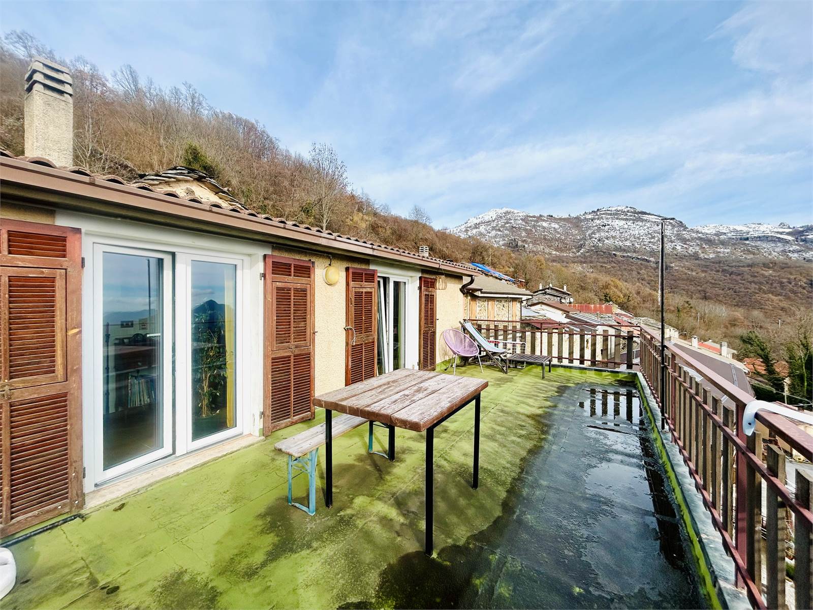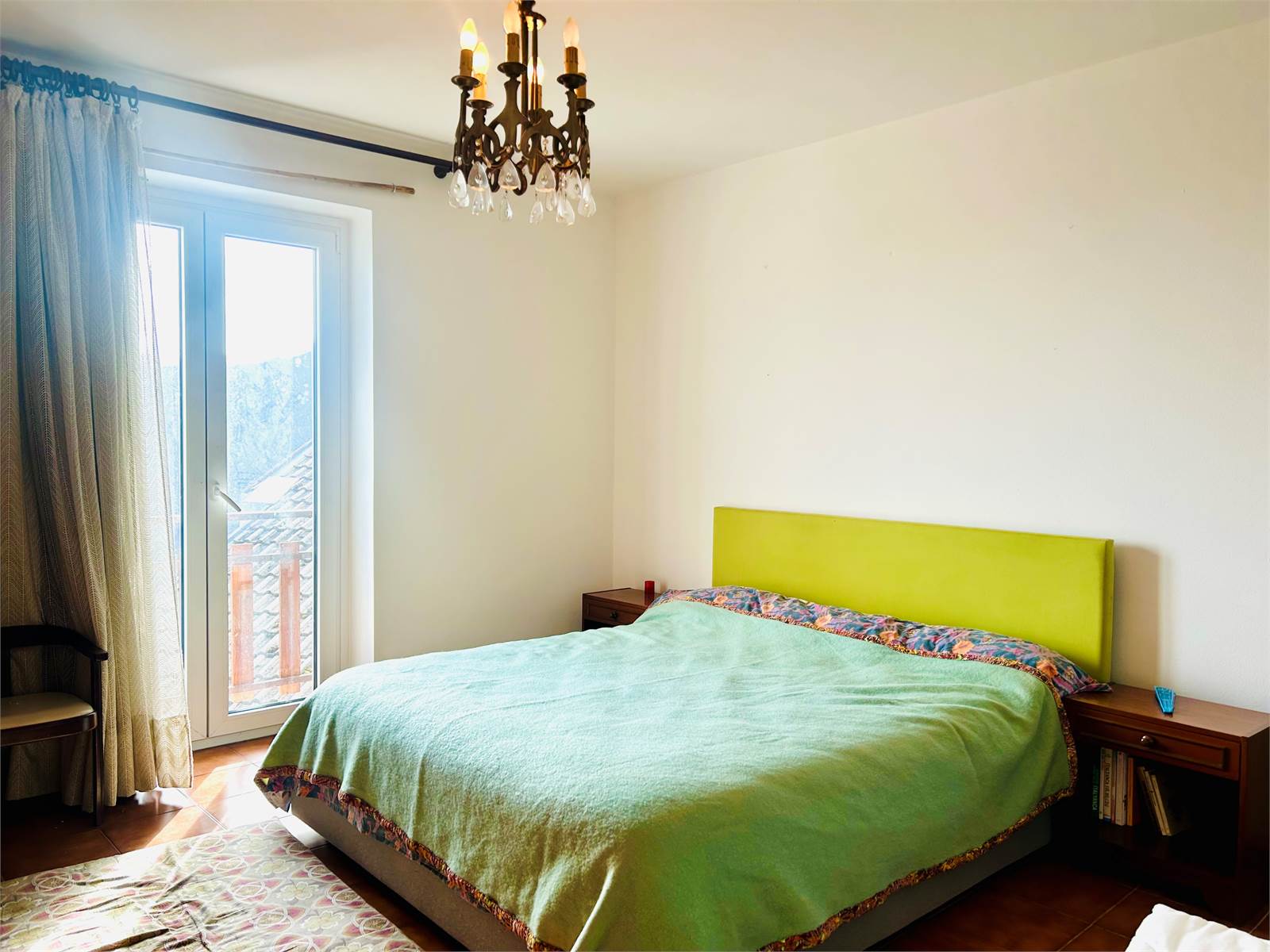 Two French windows lead to the approximately 35-square-meter habitable terrace, which enhances the property with its splendid panoramic views of the sea and mountains.