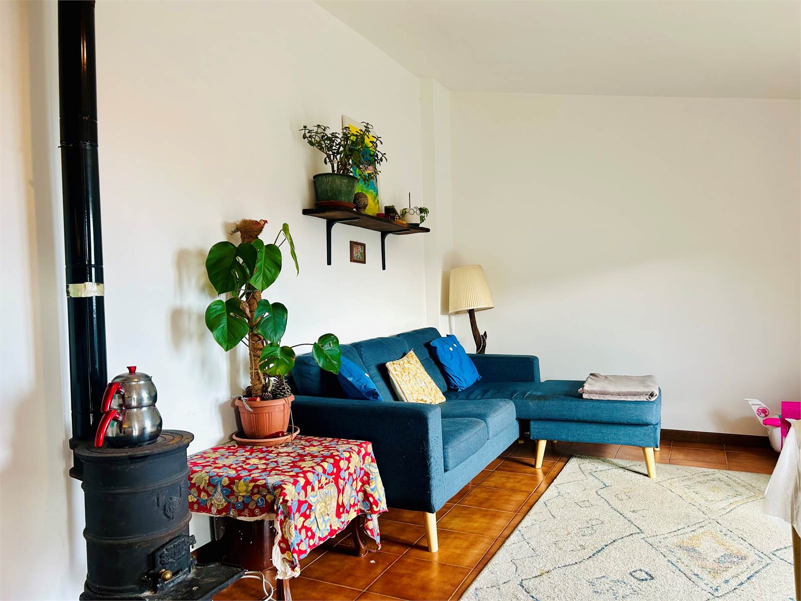 A characteristic wrought-iron spiral staircase leads to the upper floor, where a spacious living room with a kitchenette and a wood-burning stove creates a warm and welcoming atmosphere.