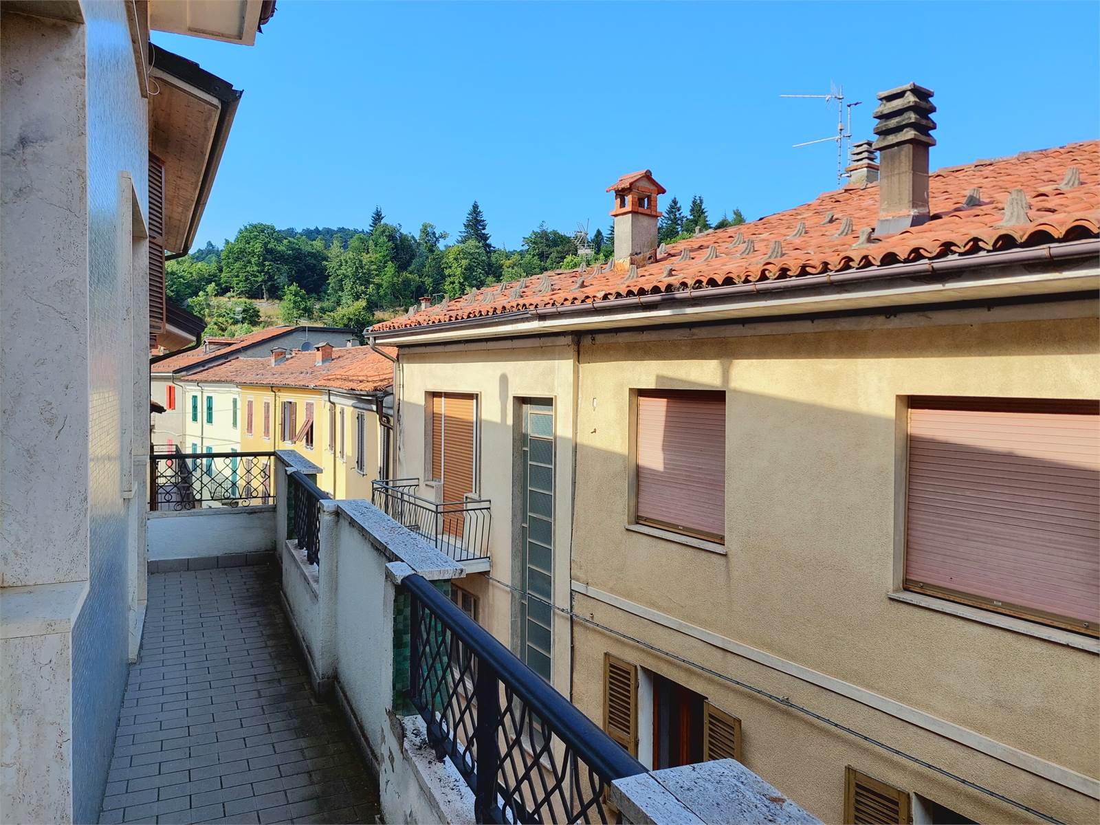 The living area consists of a kitchenette, recently furnished, opening onto the living room. French windows lead to a balcony overlooking the village's cobblestone main street.