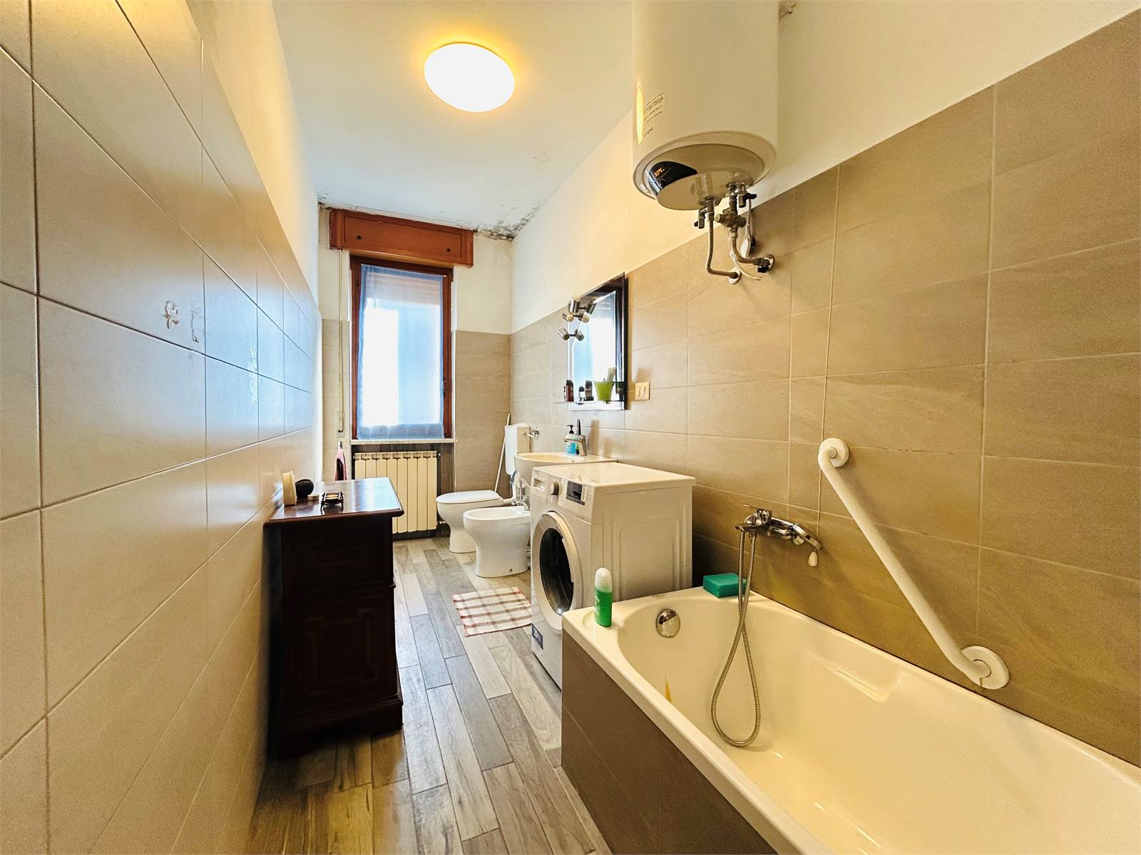 The recently renovated master bathroom has a window and contains a bathtub, washing machine, and electric hot water boiler.