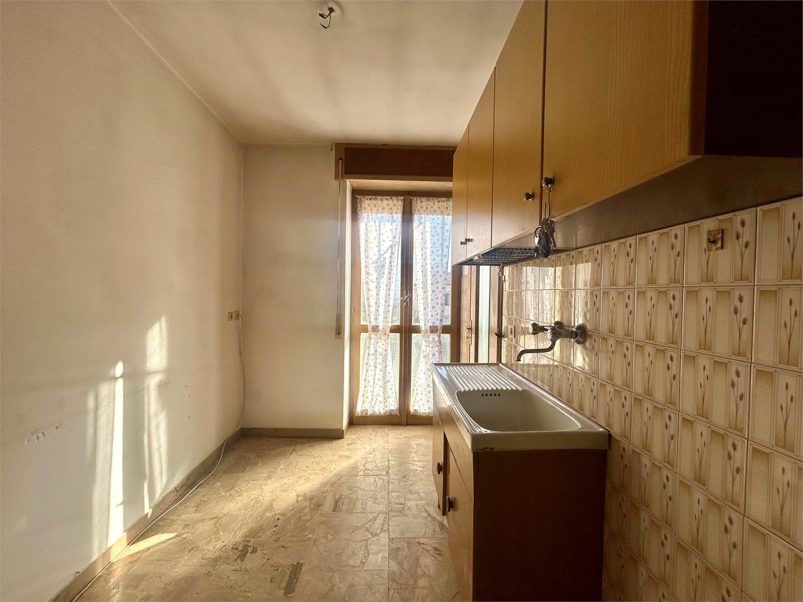 The kitchenette is furnished with a wall unit and table and is directly connected to the living room. The French window in the kitchen provides access to the balcony that extends across the entire width of the facade.