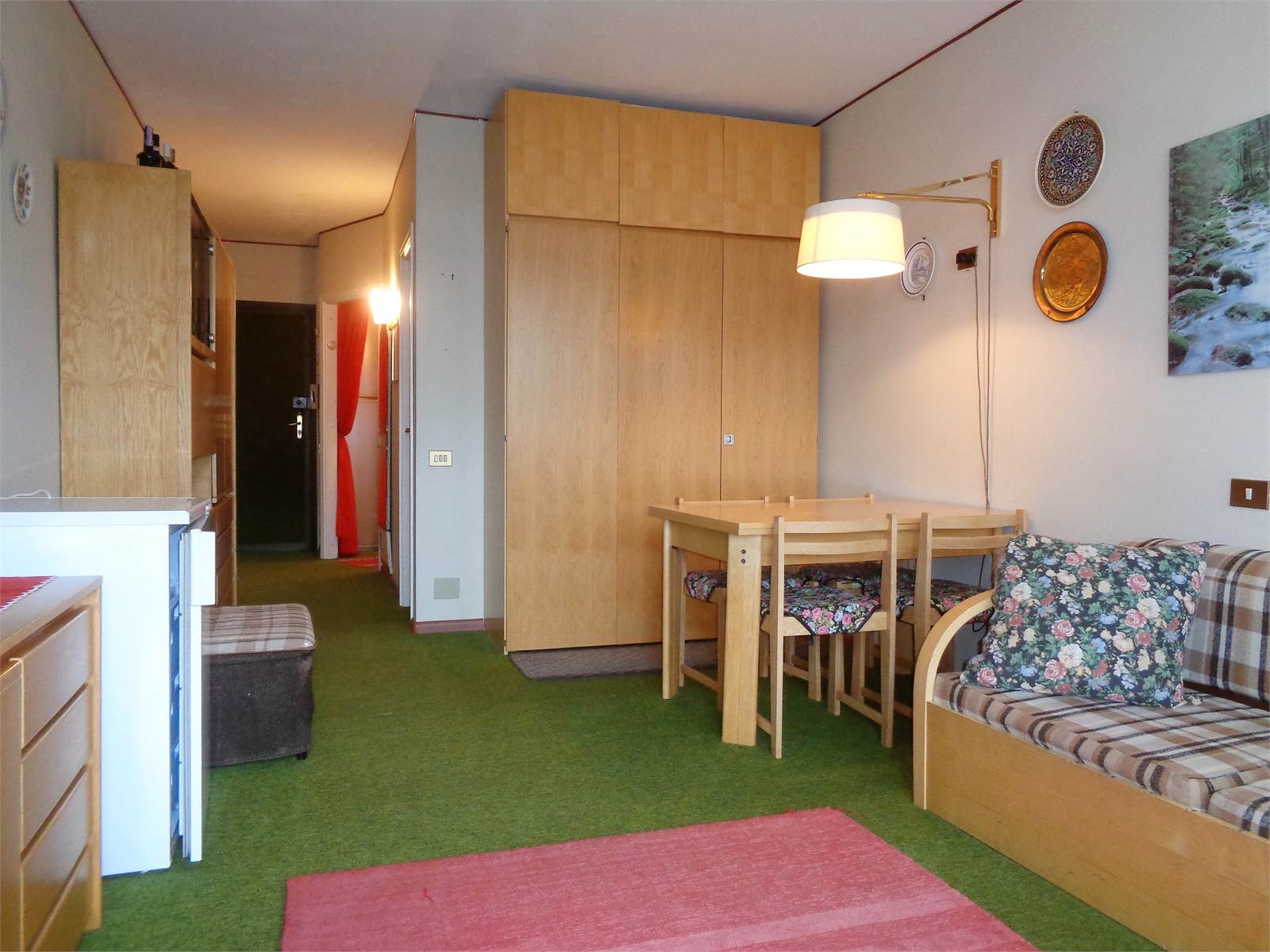 The entrance leads to a windowless bedroom with a bunk bed and a wardrobe, a windowless bathroom with a bathtub, and finally to a large room containing the living room with a double sofa bed and a kitchenette.