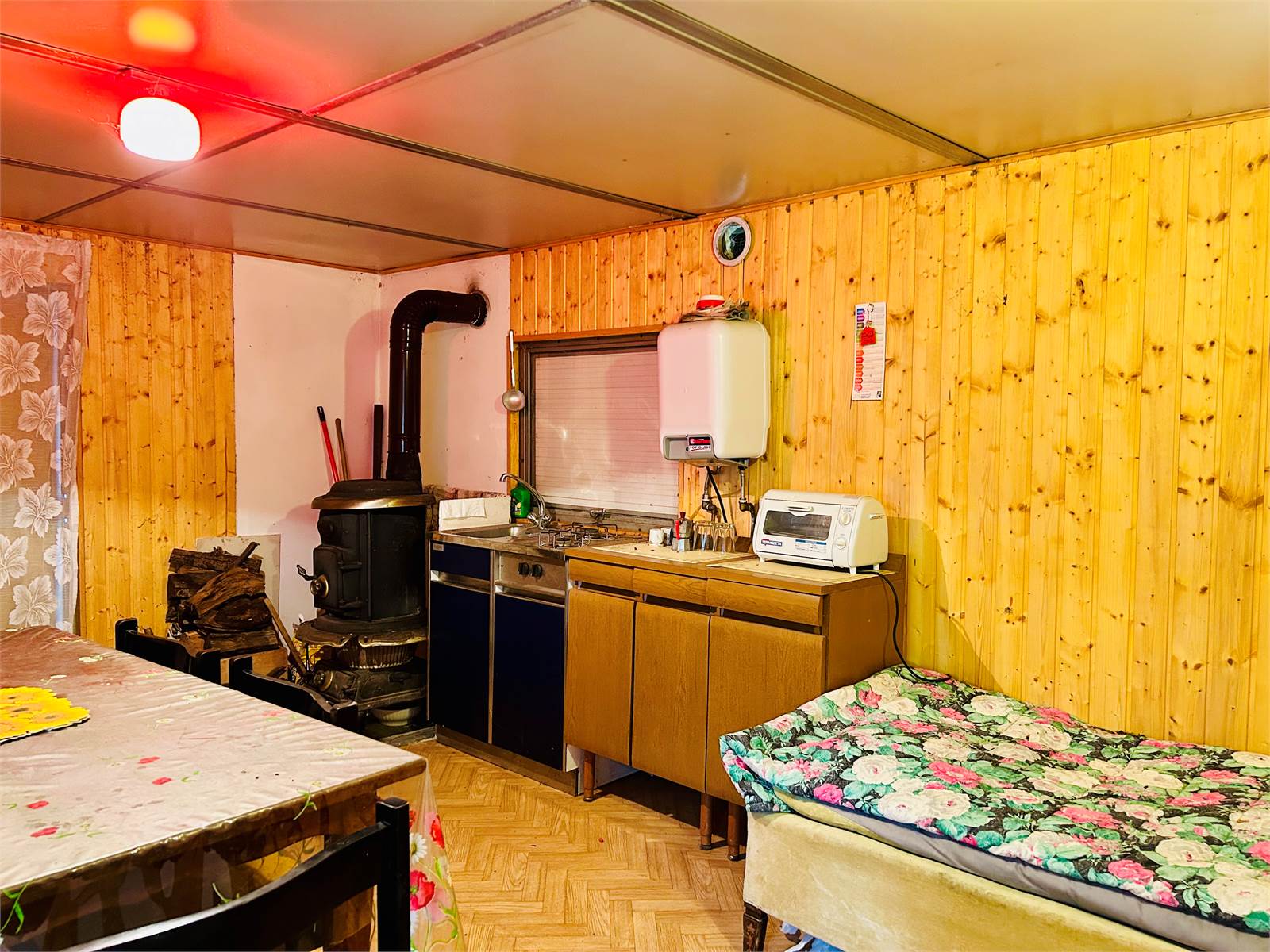 The first room you enter is the living area, lined with exposed wood paneling and measuring approximately 16 meters. Thanks to three windows, it is bright and features a kitchenette with a wood-burning stove and a dining table. It also includes an electric boiler for domestic hot water. The kitchen is powered by gas from an external tank.
