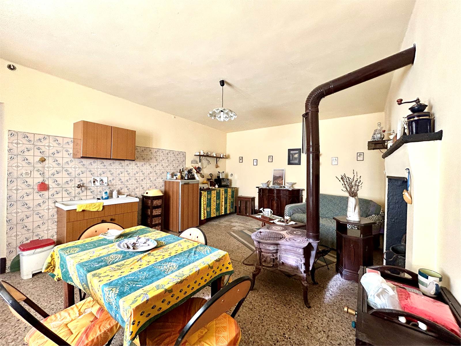 The living room is equipped with an open kitchenette and a wood stove. It is the only habitable room in the house.
