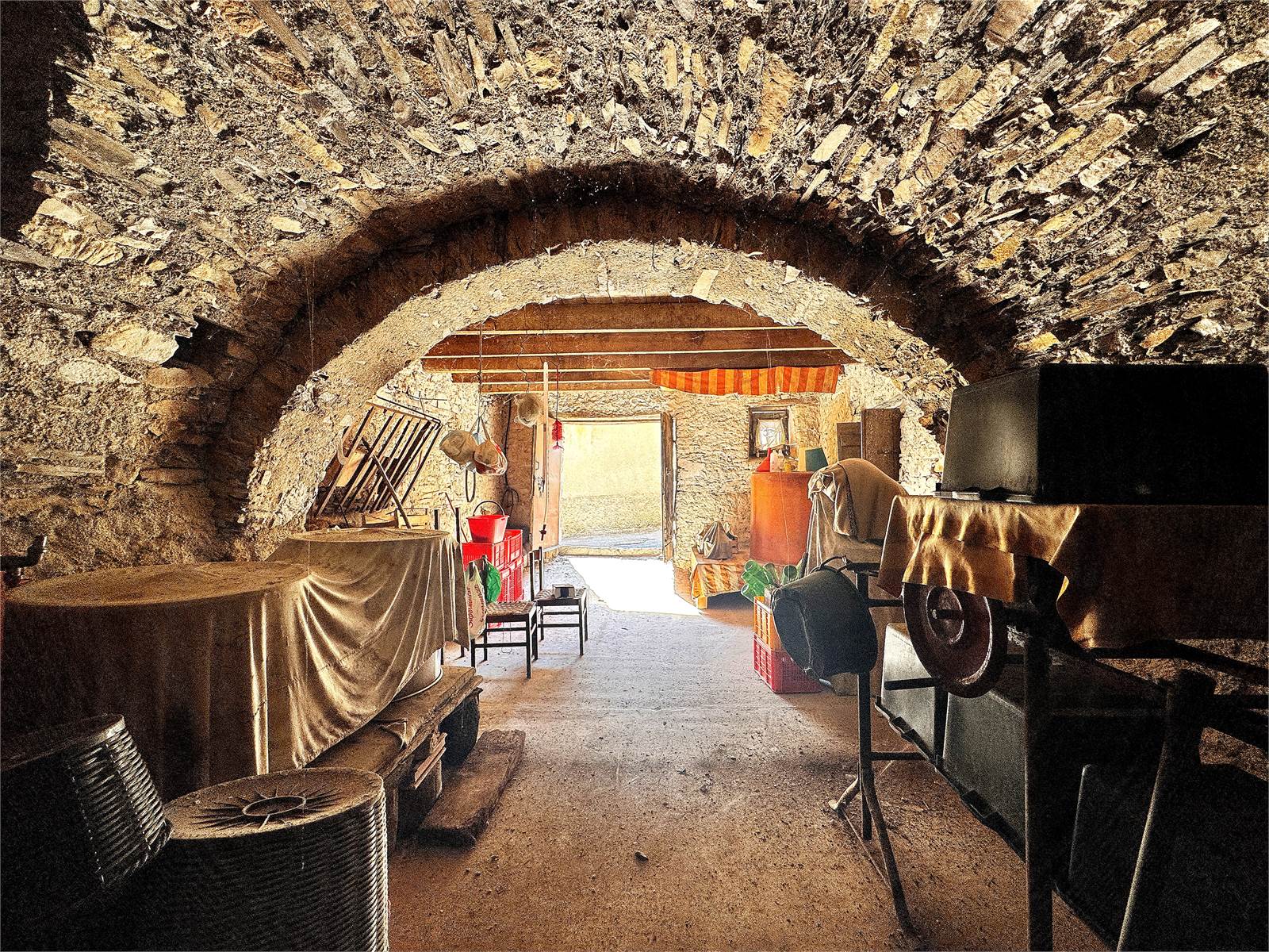 The electrical, plumbing, and drainage systems all need to be installed. The connection to the water supply is available in the storage area located on the ground floor. This storage space is included in the property and measures approximately 35 square meters, with vaulted ceilings and divided into two rooms.