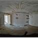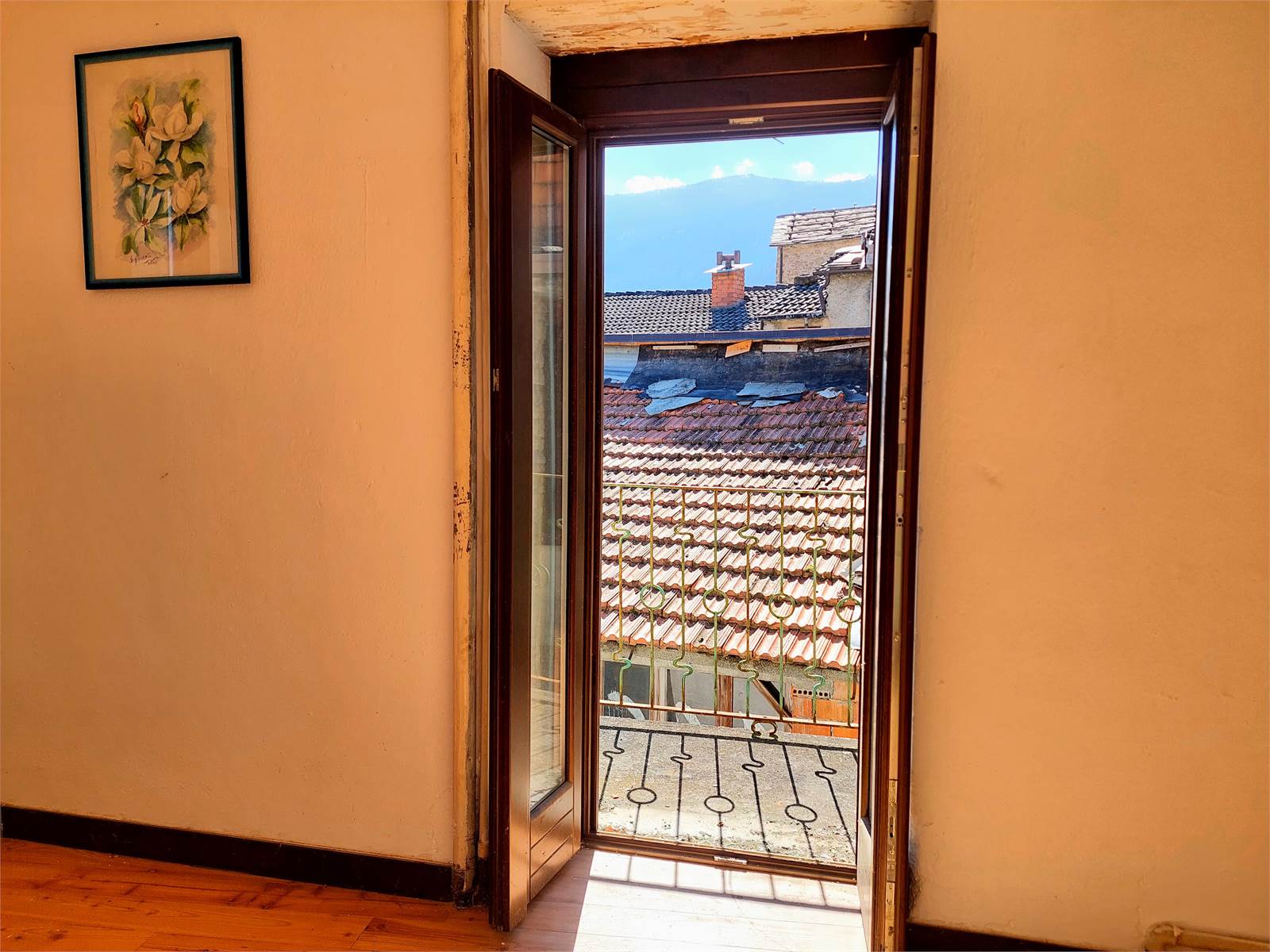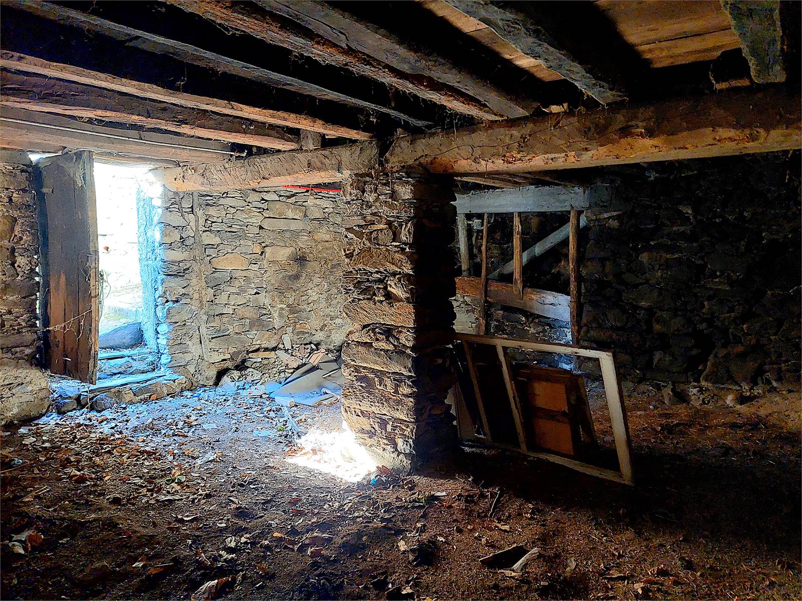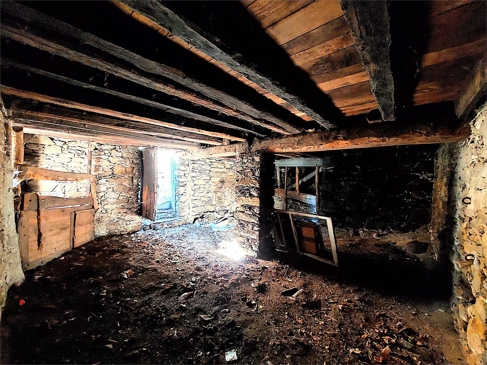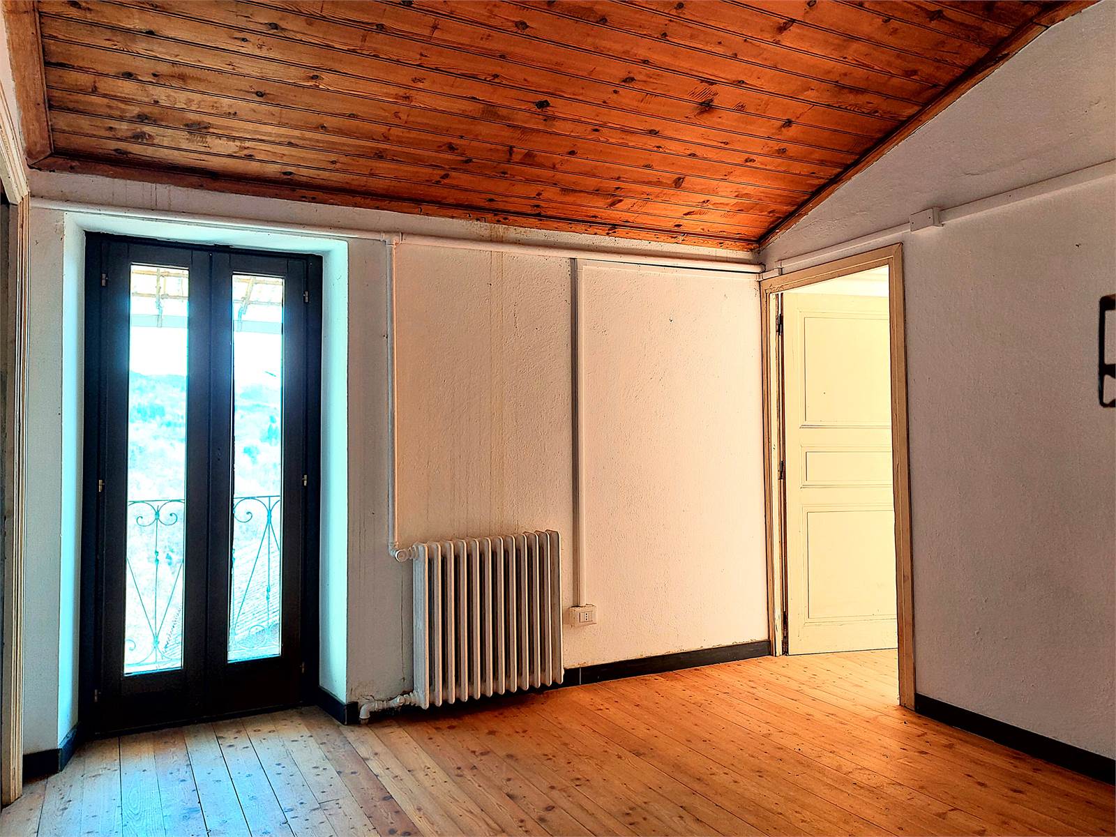The internal stairs in the entrance hall lead to the first and last floor of the house, which is also registered as a separate unit. A small corridor divides the various rooms on this floor. The kitchen is bright thanks to its southern exposure and features a built-in wood-burning oven. The living room has French doors leading to a balcony with panoramic views of the valley. There are two bedrooms, both furnished with a double bed and wardrobe, while one has a French door leading to a balcony. Finally, on the first floor, there is a windowless room used for storage.