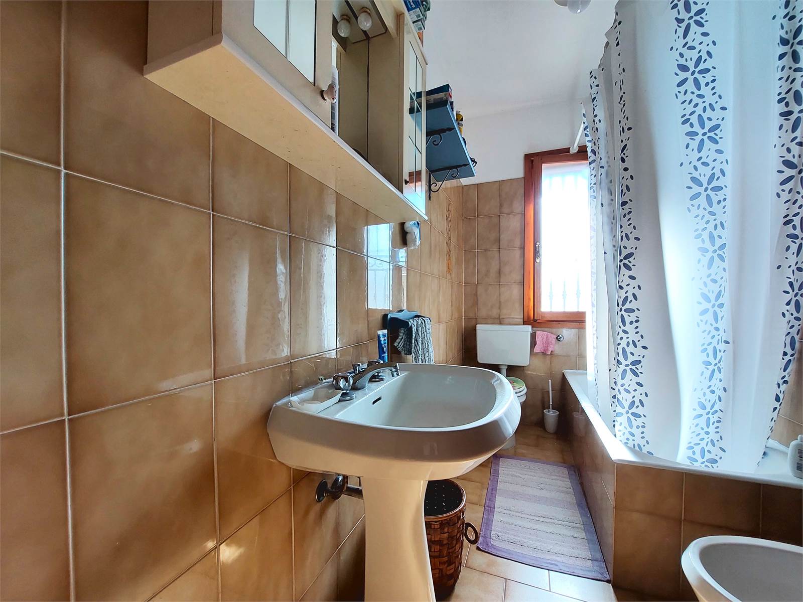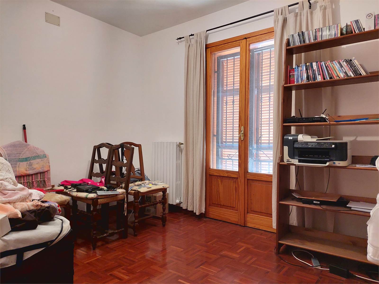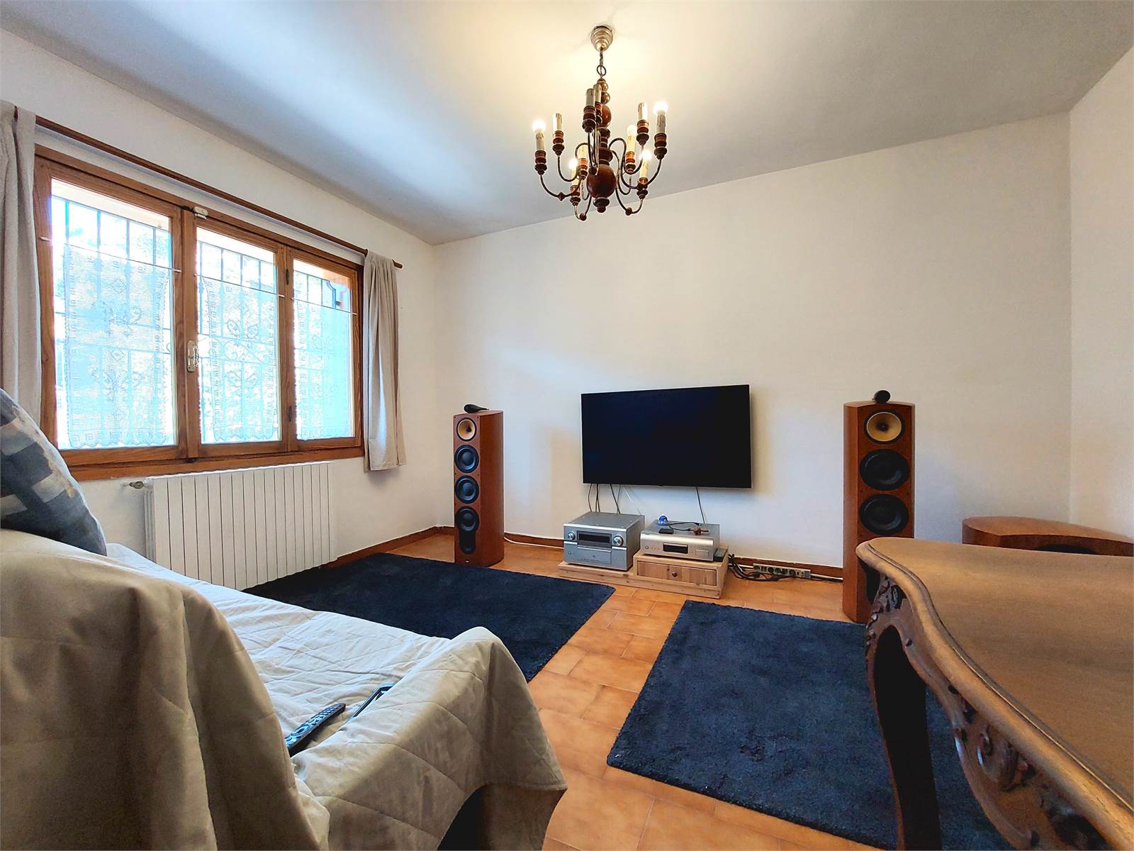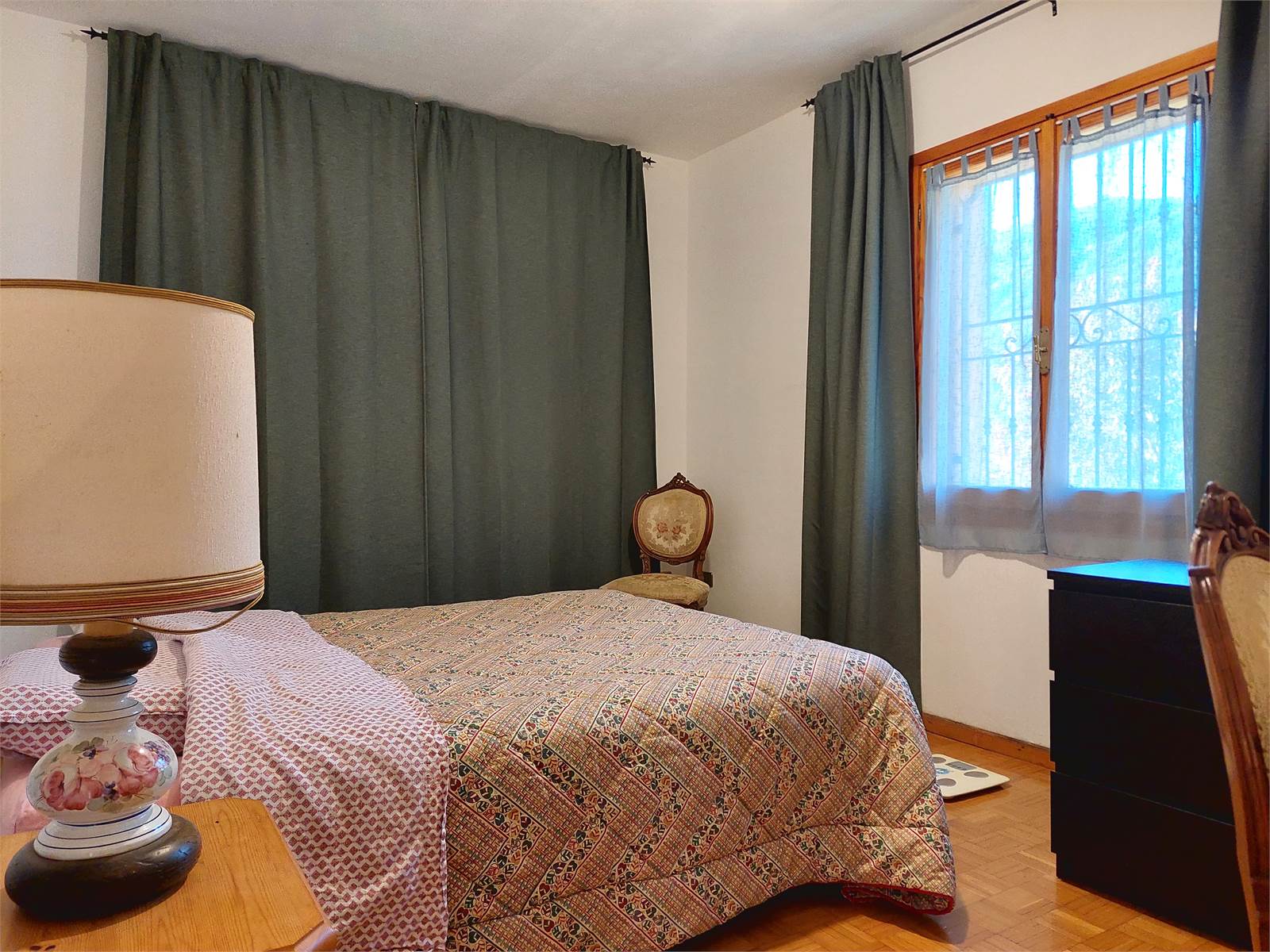 The ground-floor unit has a small entrance hall with a coat rack that leads to the living area. The living room is brightly lit by a triple-pane window and the glass entrance hall, and a sliding door inside of it leads directly to the kitchenette with window. A small corridor separates the living area from the sleeping area. There are three bedrooms: one is a single, and the other two are large enough to accommodate a double bedroom. The largest bedroom, in addition to having parquet flooring, has a French door that opens to the terrace. The bathroom has a window and a bathtub. All ground-floor windows are protected by bars.