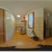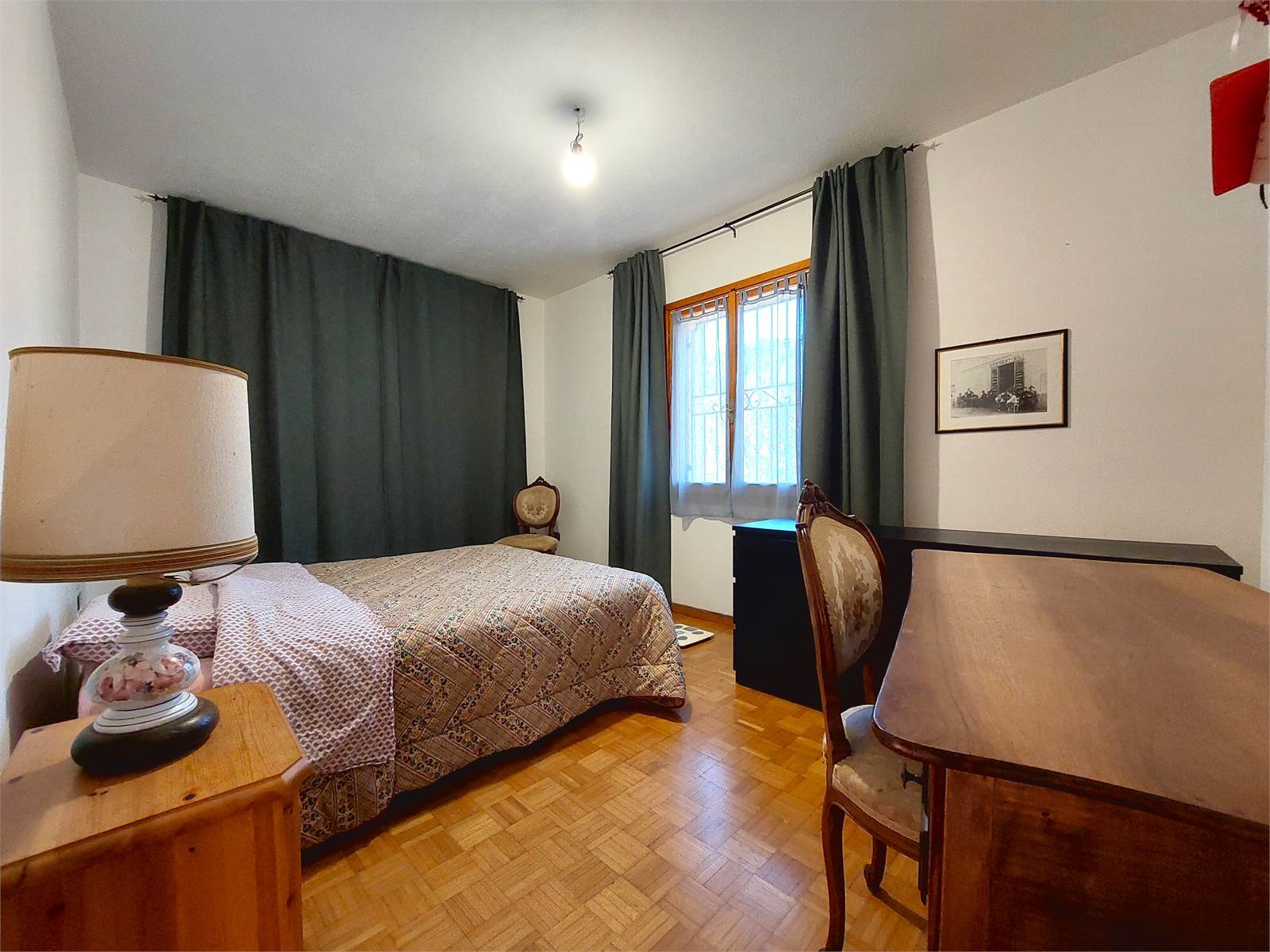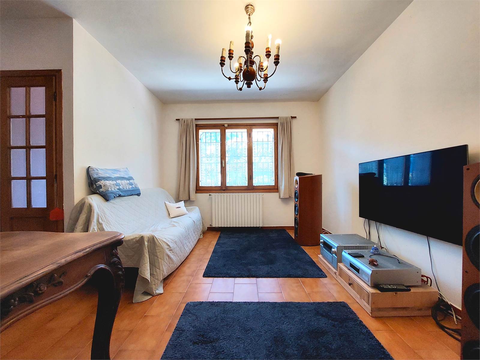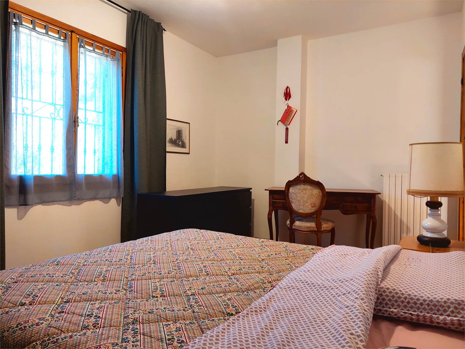 The ground-floor unit has a small entrance hall with a coat rack that leads to the living area. The living room is brightly lit by a triple-pane window and the glass entrance hall, and a sliding door inside of it leads directly to the kitchenette with window. A small corridor separates the living area from the sleeping area. There are three bedrooms: one is a single, and the other two are large enough to accommodate a double bedroom. The largest bedroom, in addition to having parquet flooring, has a French door that opens to the terrace. The bathroom has a window and a bathtub. All ground-floor windows are protected by bars.
