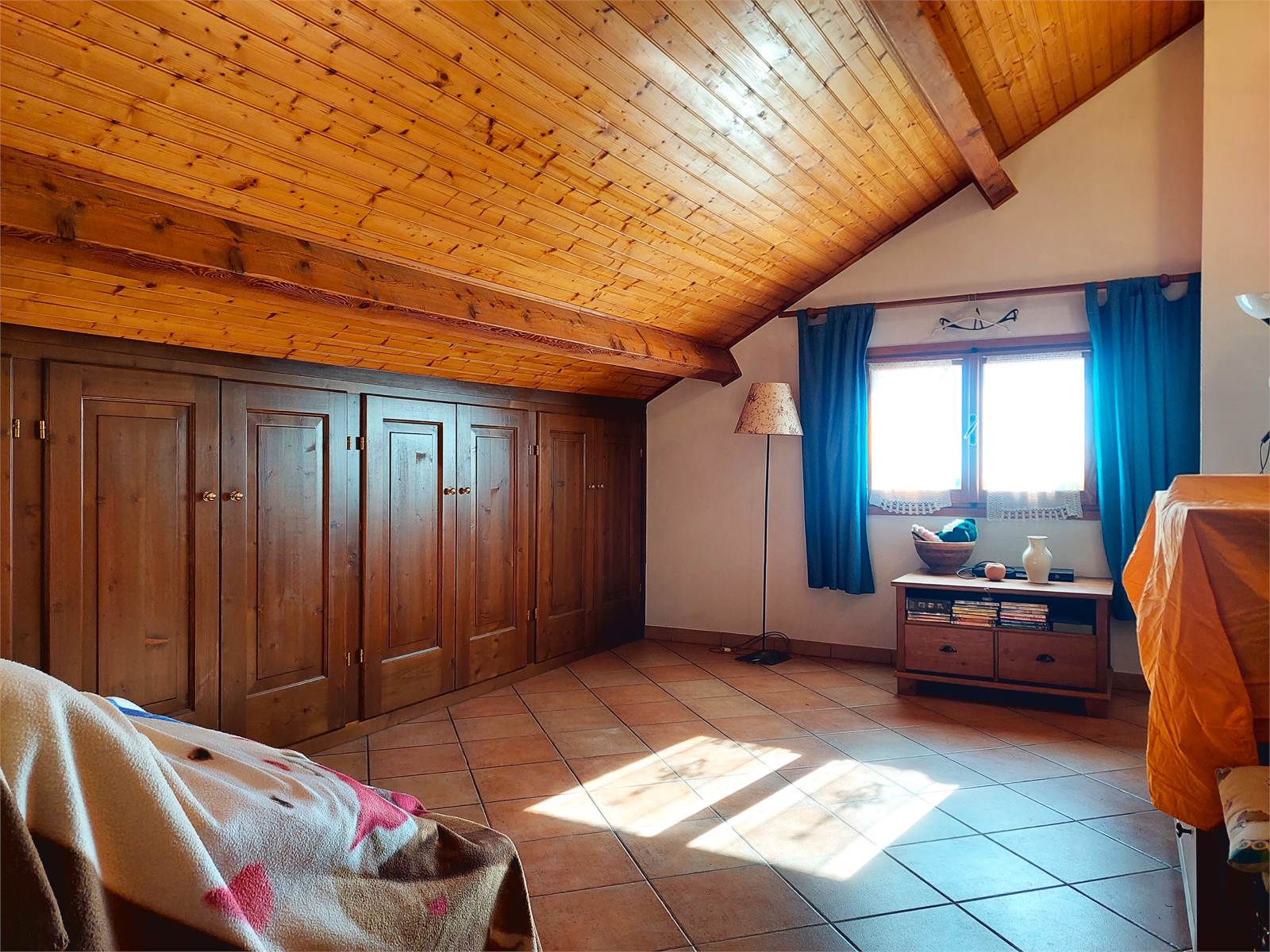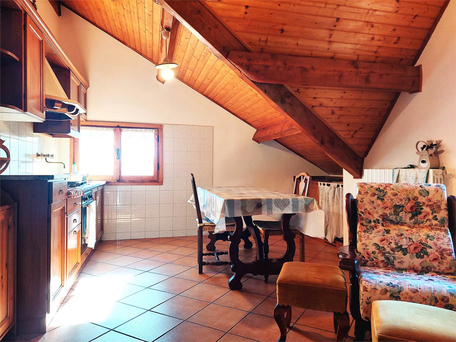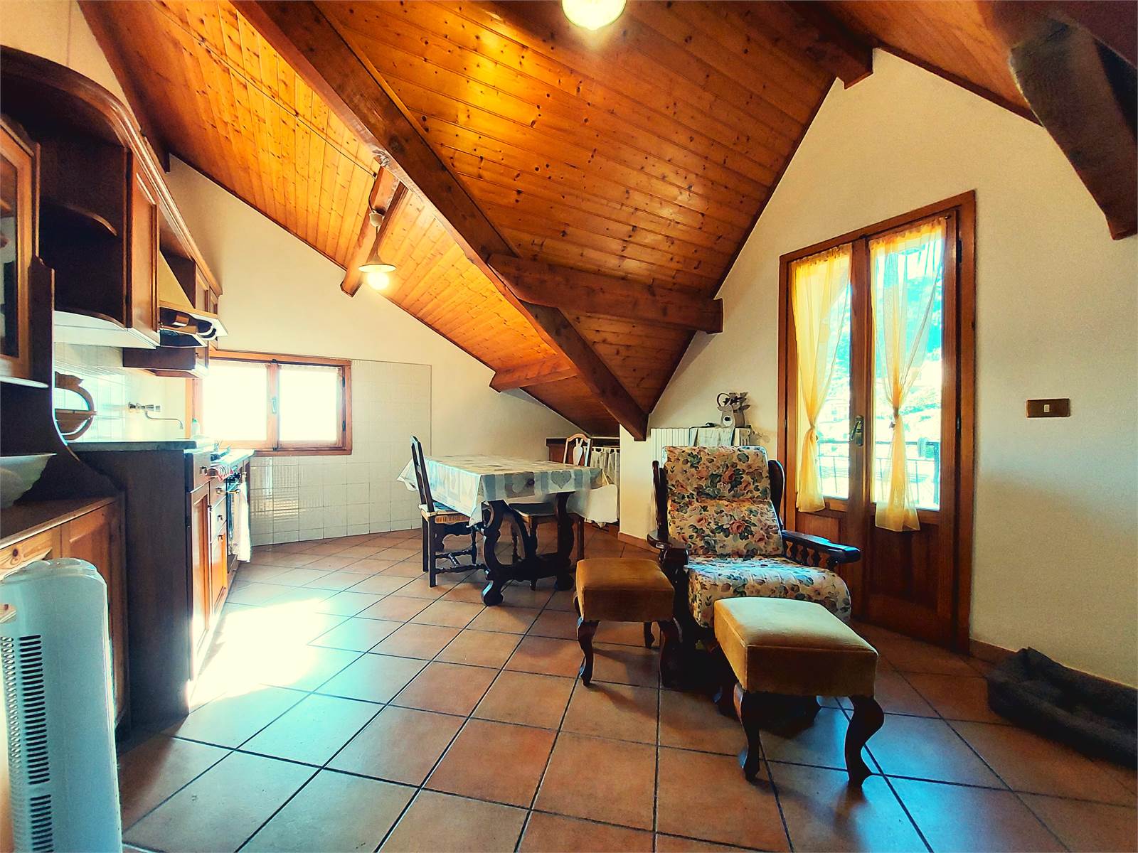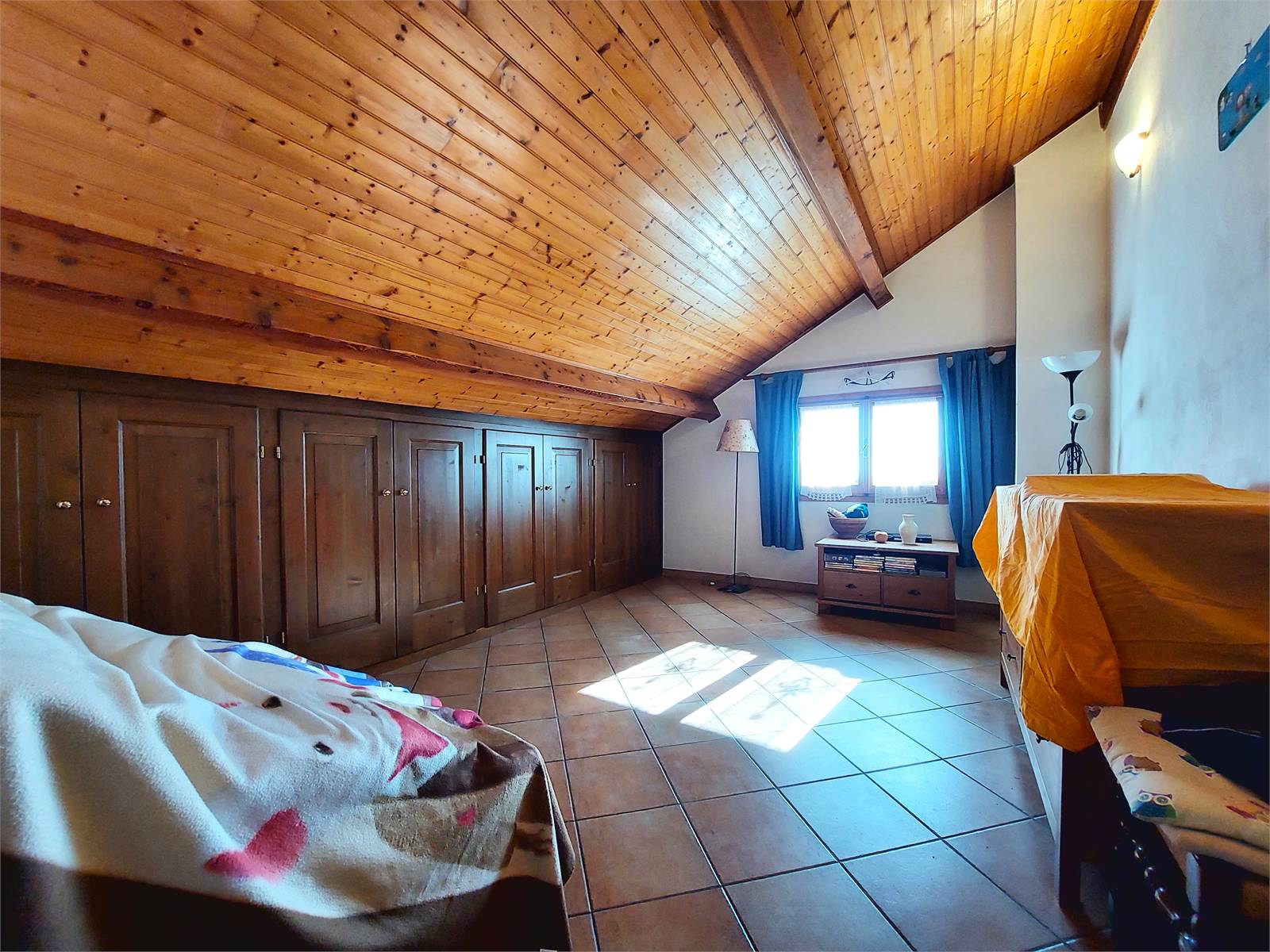 The entrance corridor divides the various rooms of the flat. The living area consists of a spacious room, equipped with a kitchen that extends along the entire long wall and a covered balcony offering panoramic views of the village and the mountains above. The apartment has two additional rooms, both of which can be furnished with a double bedroom. The bathroom has a bathtub and a transom window in the ceiling. The apartment also includes a storage room.