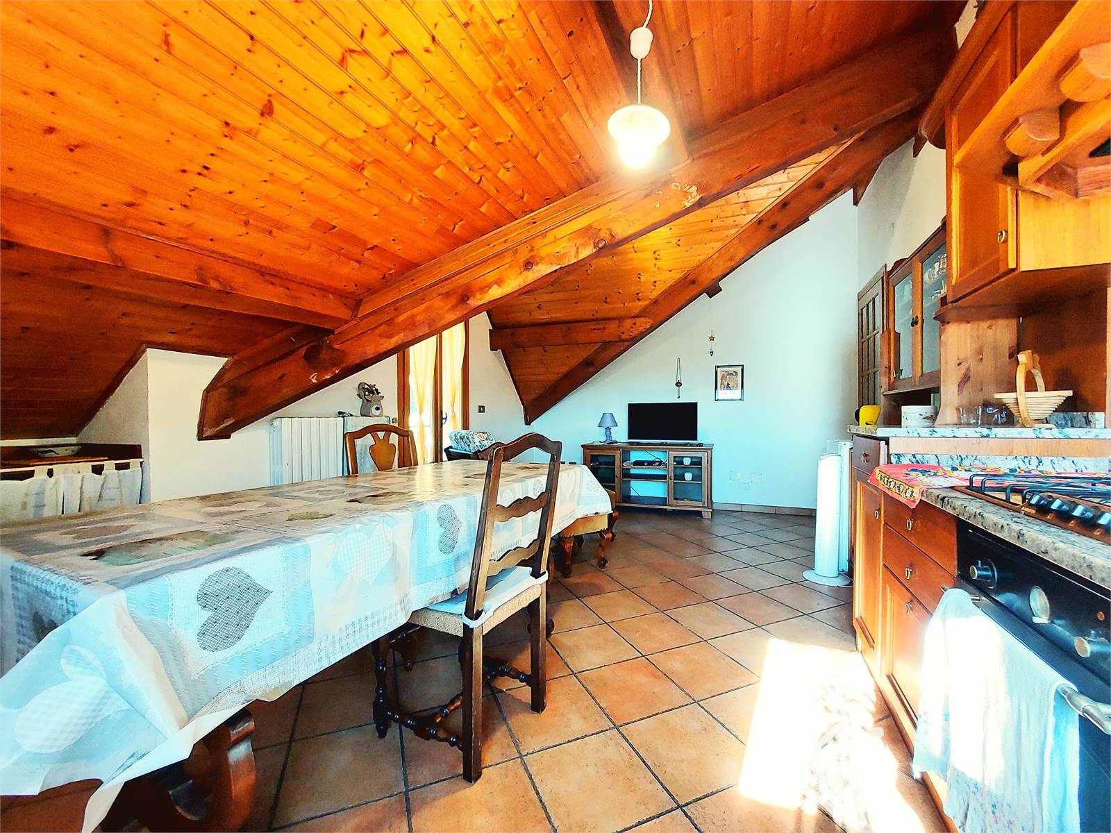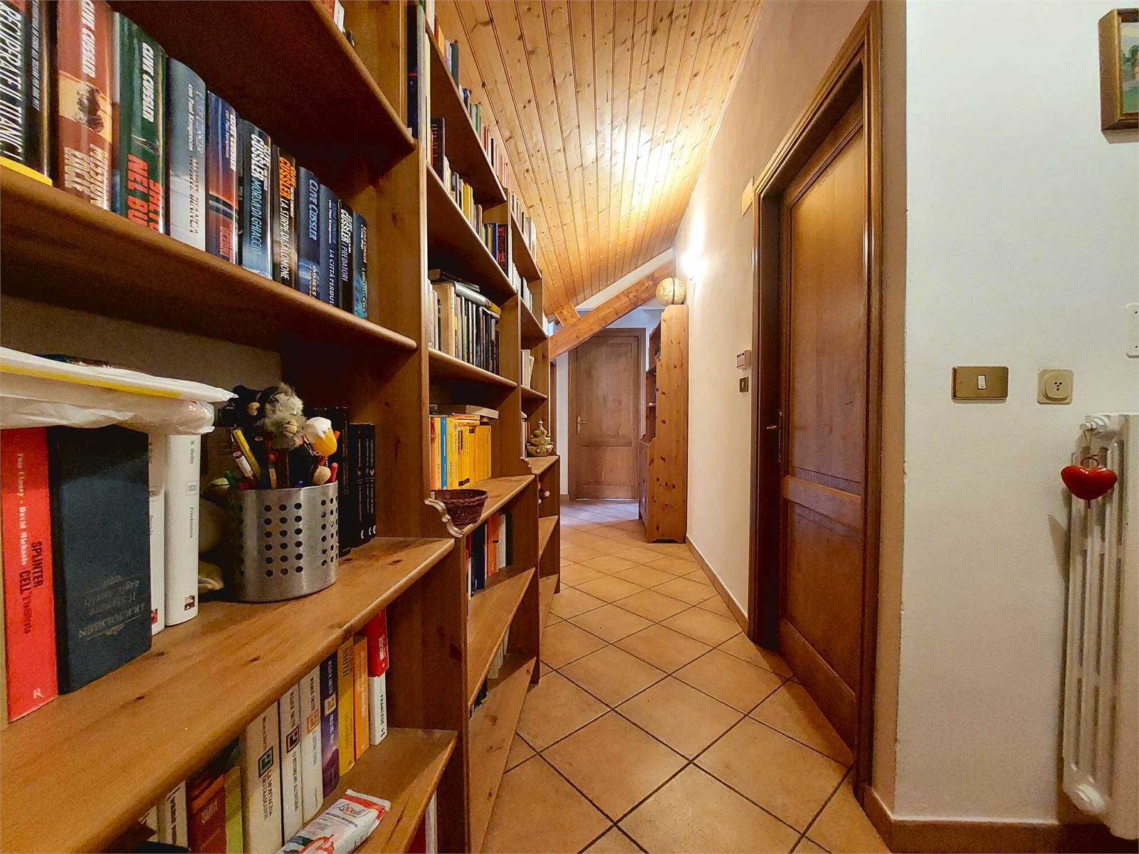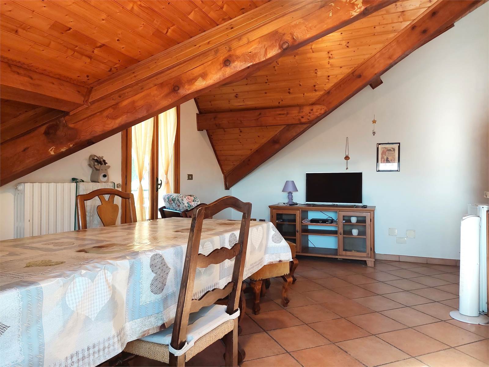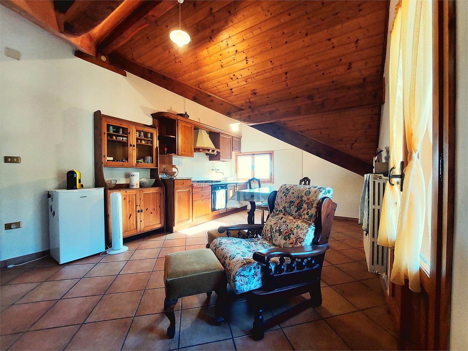The entrance corridor divides the various rooms of the flat. The living area consists of a spacious room, equipped with a kitchen that extends along the entire long wall and a covered balcony offering panoramic views of the village and the mountains above. The apartment has two additional rooms, both of which can be furnished with a double bedroom. The bathroom has a bathtub and a transom window in the ceiling. The apartment also includes a storage room.