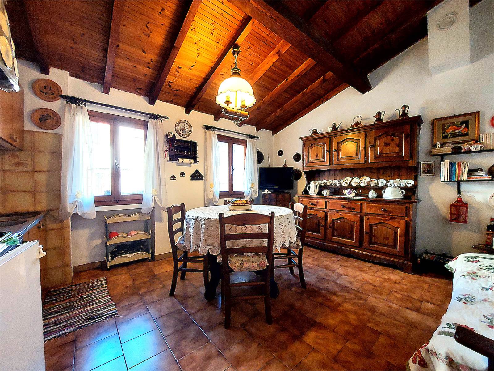 The internal stairwell leads from the first to the second floor where the second accommodation is located. The entrance divides the various rooms of the apartment. The living room and kitchen form a single space characterized by the exposed wooden roof. There are two bedrooms, one single and one double, also with wooden ceilings. The bathroom has a window and a shower. The accommodation has wooden windows with single glazing and is heated with a wood stove.