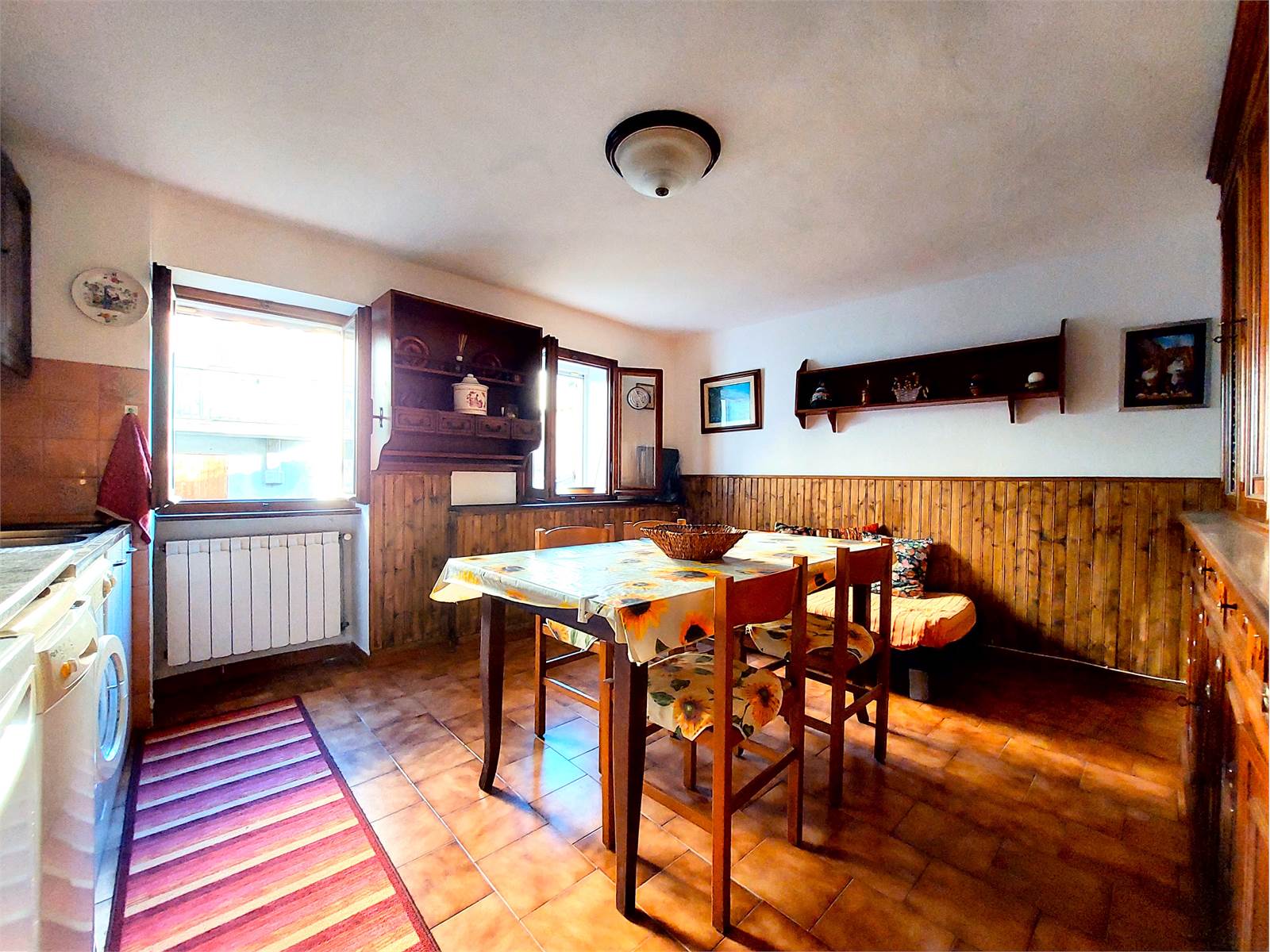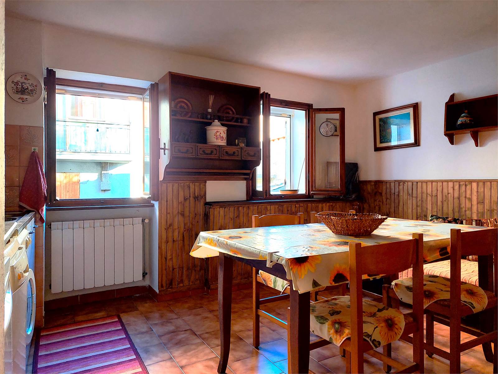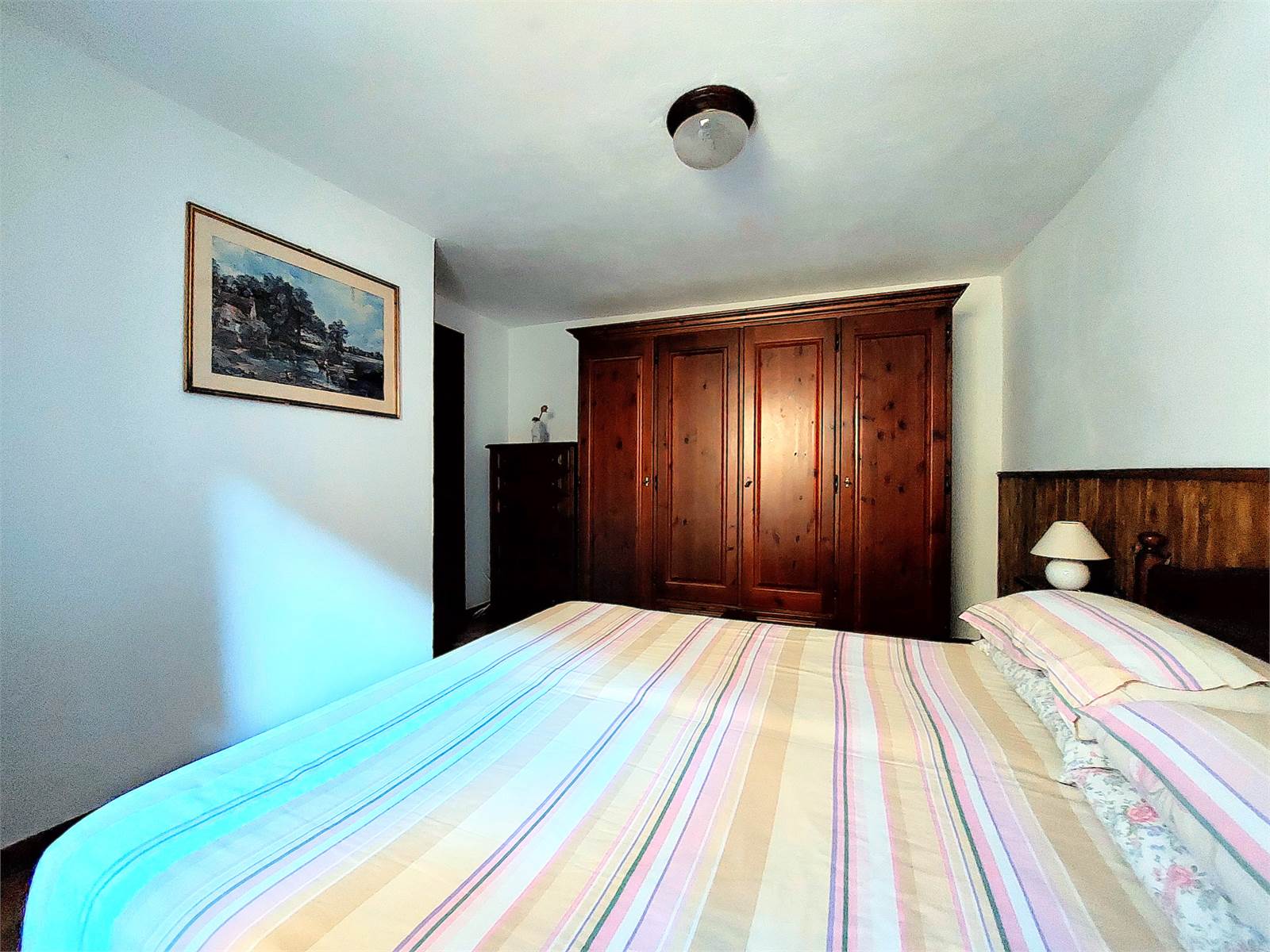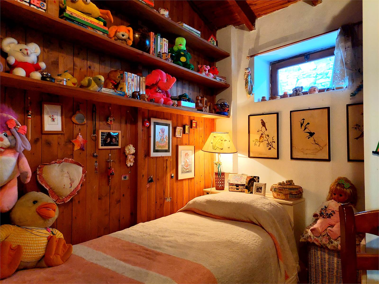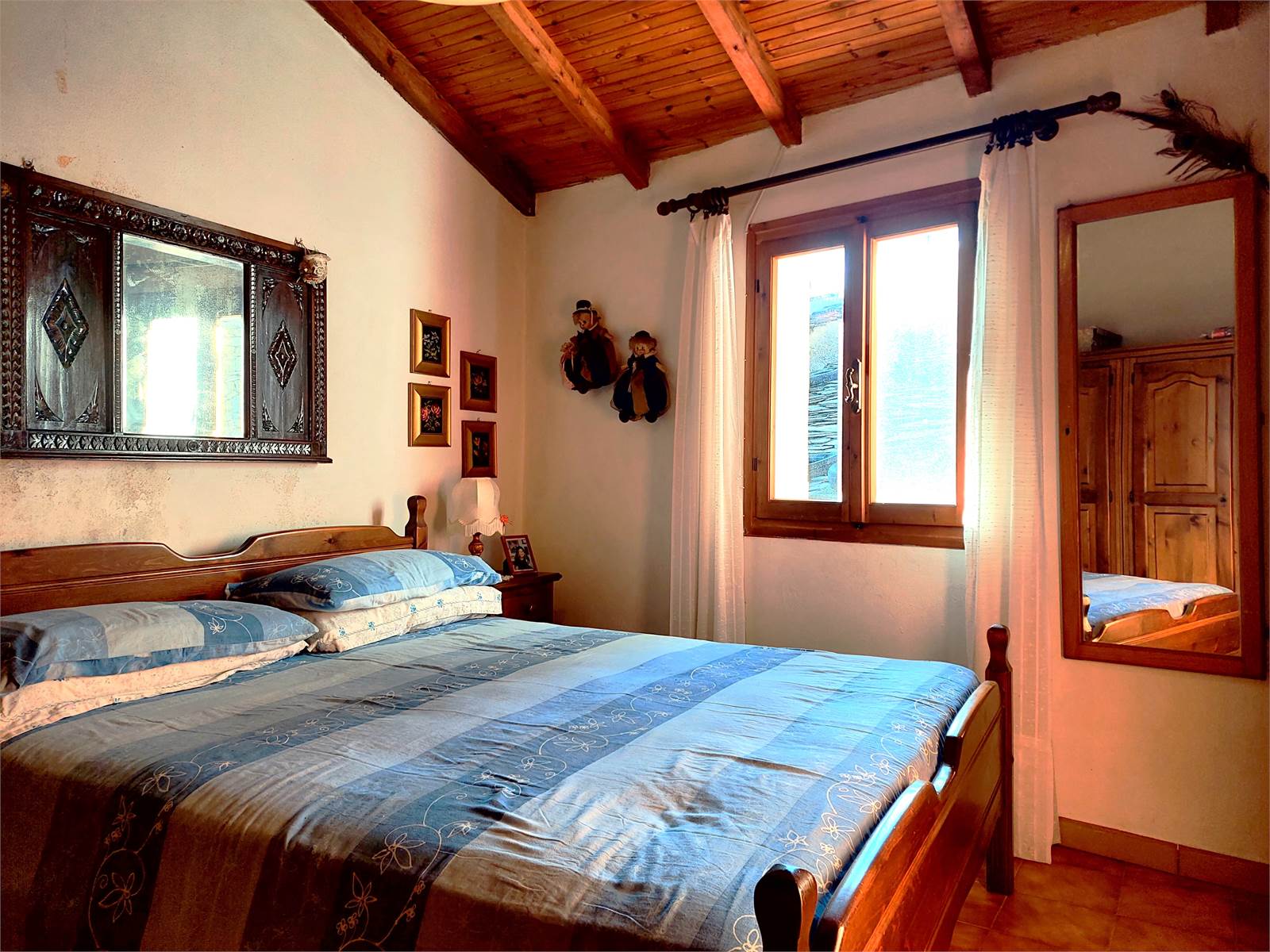 The internal stairwell leads from the first to the second floor where the second accommodation is located. The entrance divides the various rooms of the apartment. The living room and kitchen form a single space characterized by the exposed wooden roof. There are two bedrooms, one single and one double, also with wooden ceilings. The bathroom has a window and a shower. The accommodation has wooden windows with single glazing and is heated with a wood stove.