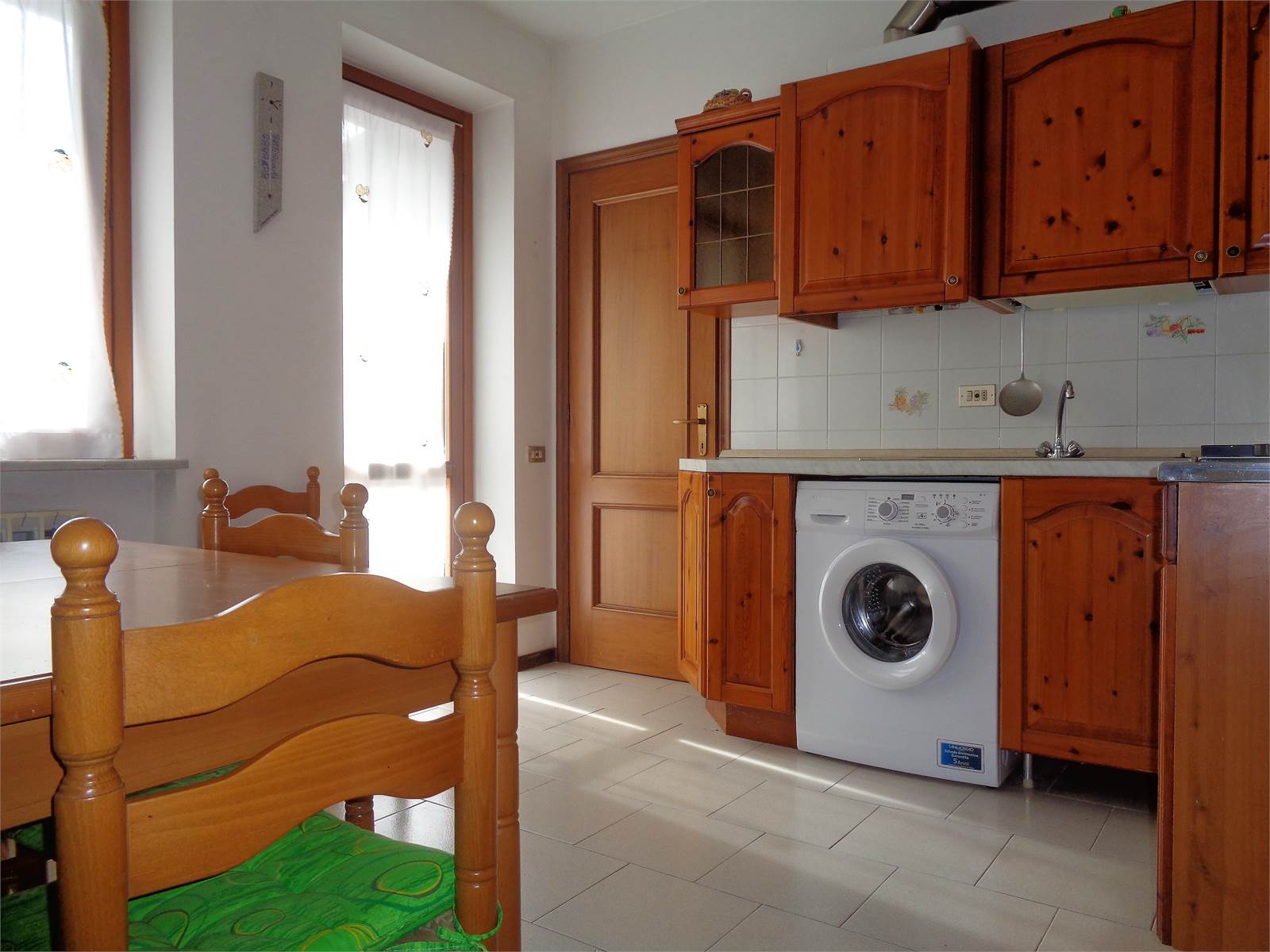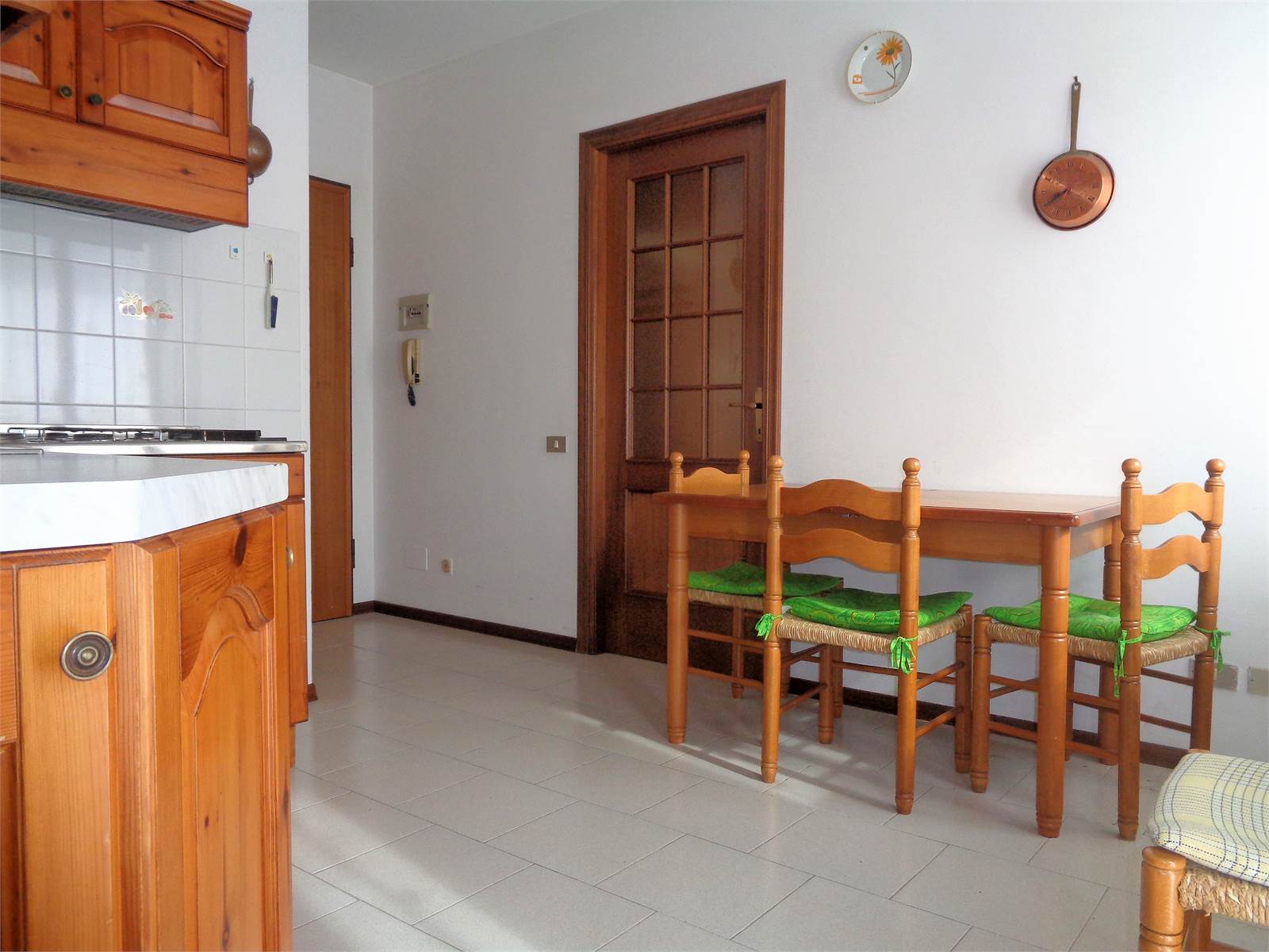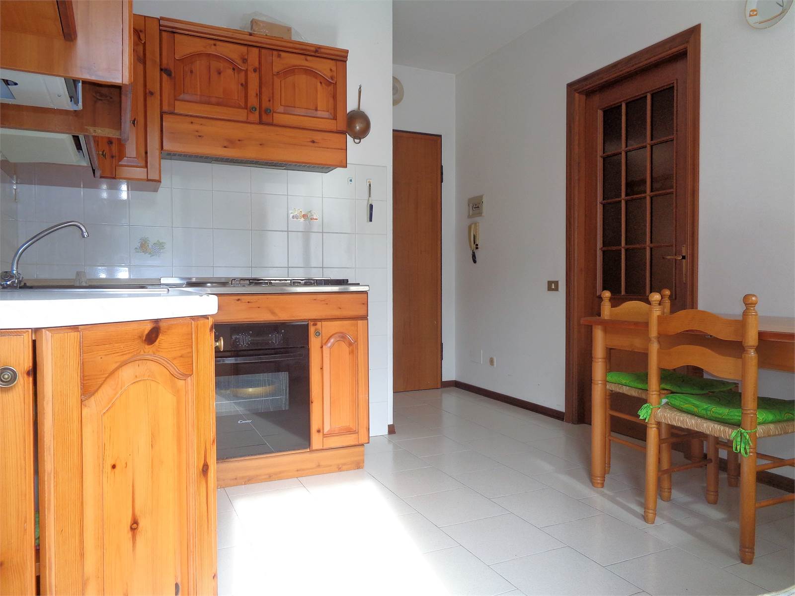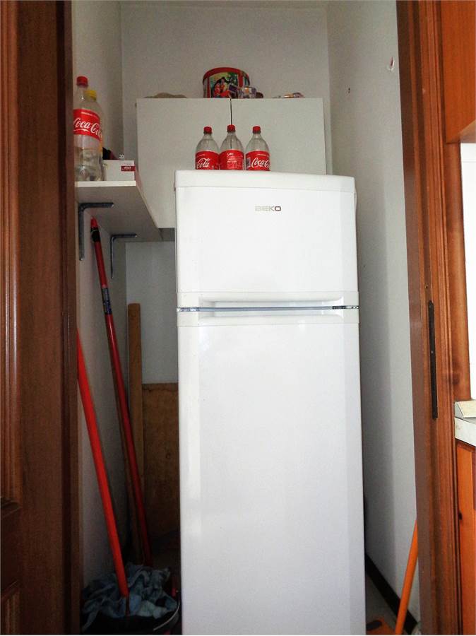 The entrance is a small room with an intercom and space for a coat rack that opens directly onto the kitchen. The room also has a storage room, now used as a pantry, where the refrigerator is located. A French door also provides access to the private terrace.