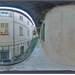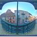 The balcony, accessible from both the stairwell and one of the bedrooms, extends across the entire front of the apartment and serves as an external entrance to the bathroom, which has a bathtub and a window.