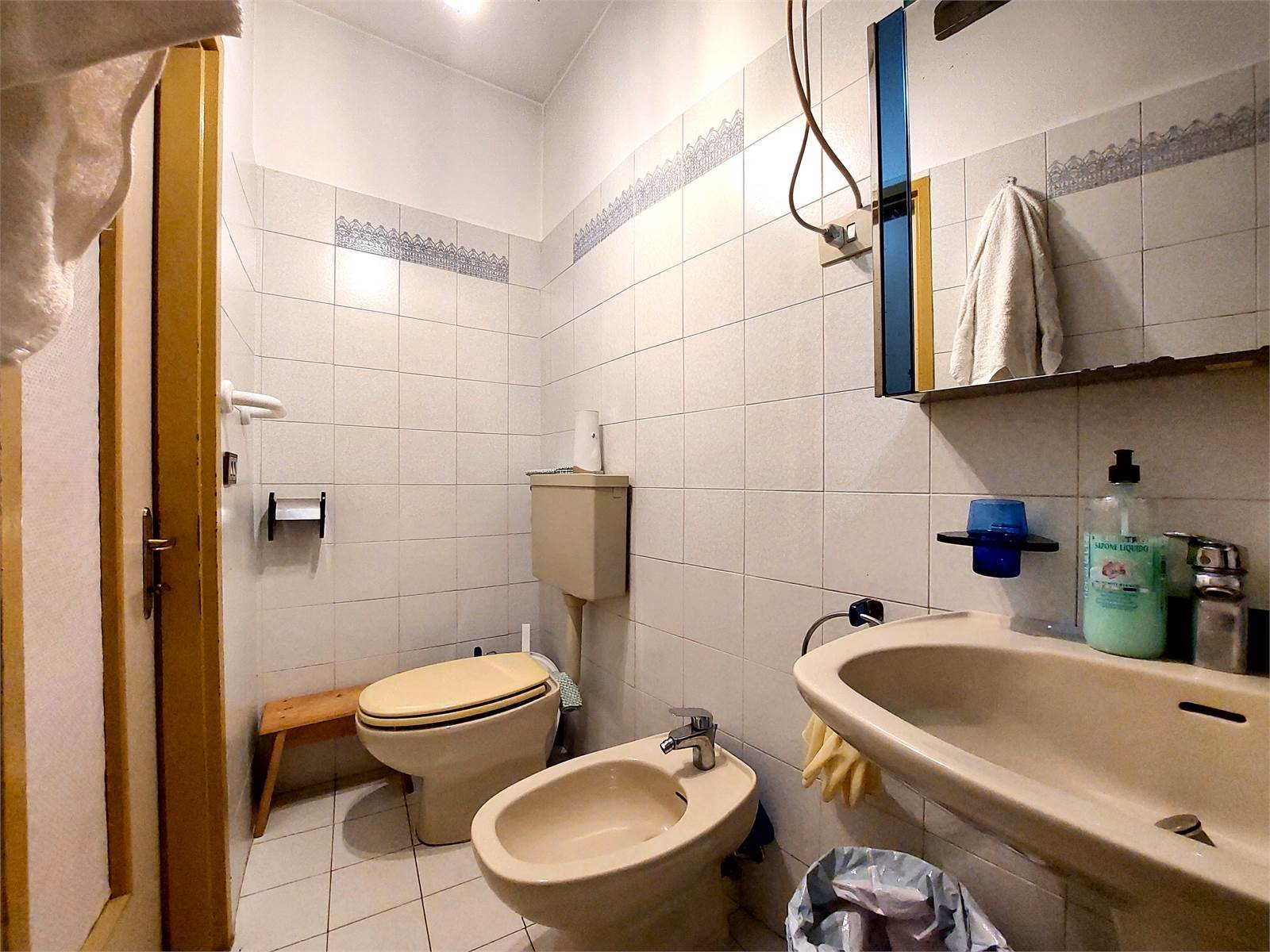 The apartment's bathroom is located next to the entrance hall, between the bedrooms and the kitchen. It has no window, but it has forced ventilation and a bathtub.
