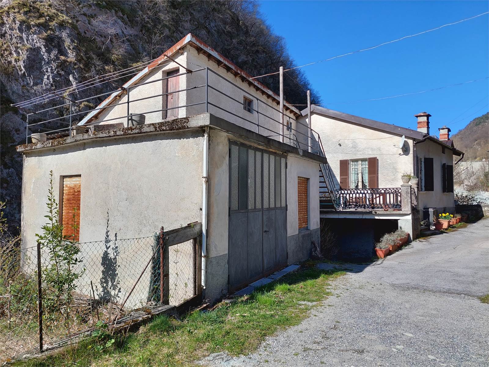 A large asphalt courtyard delimited by a bar allows access to the property even by car, as well as being used as an uncovered parking lot. There are also two private garages located inside the buildings, one per home.