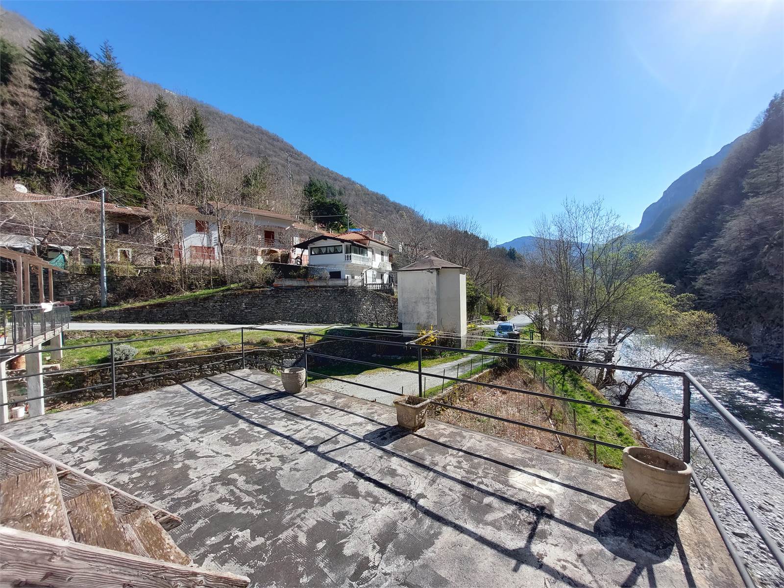 At the back and partly on the sides of the buildings there is flat private land with lawn and fruit trees that extends for about 1,100 square meters, as well as a small beach along the river, accessible from a small road that starts from the courtyard of the village.