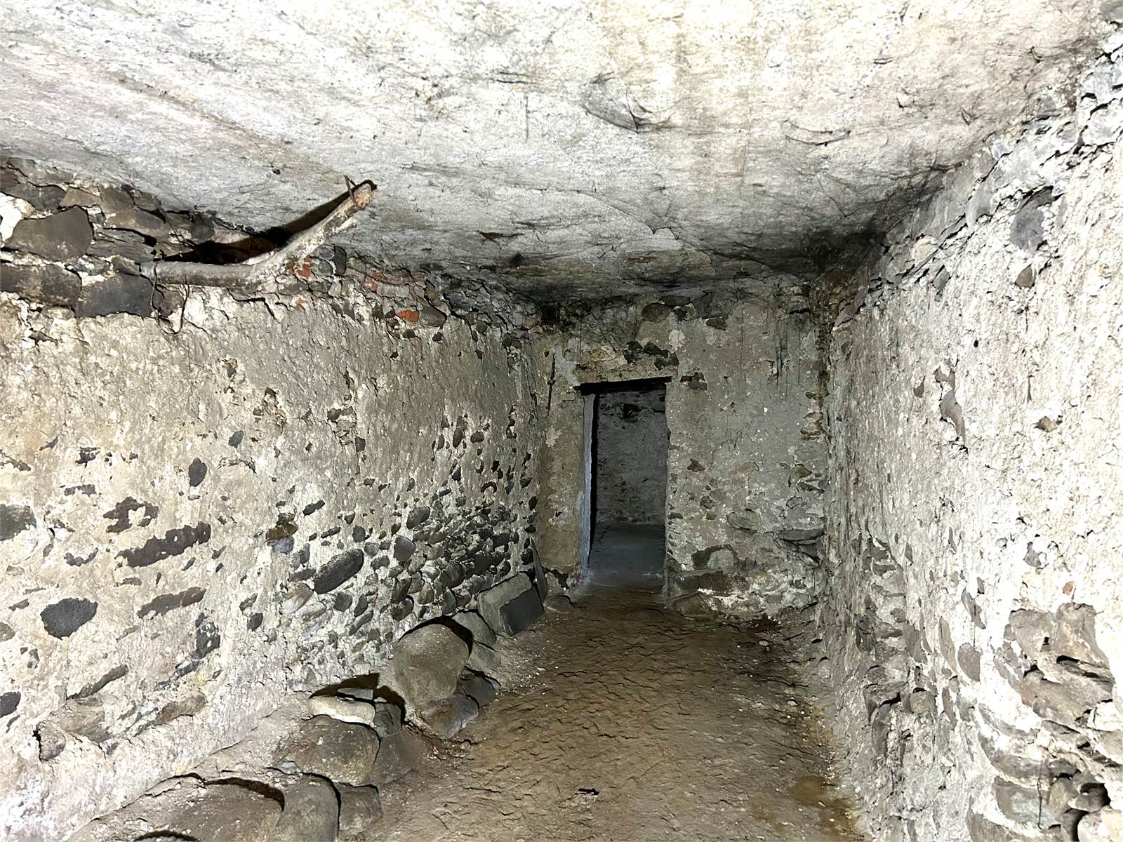On the ground floor, with an independent entrance from the square, a wooden door leads to a large warehouse with a vaulted ceiling and two cellars, one of which is semi-basement and one underground.