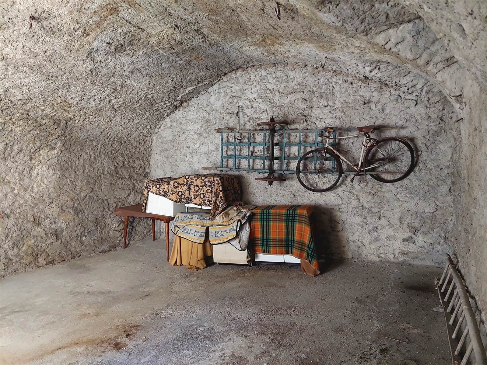 The garage is dry and immediately usable, the vaulted ceiling and perimeter walls are solid, even though the rest of the building requires complete renovation starting from the roof.