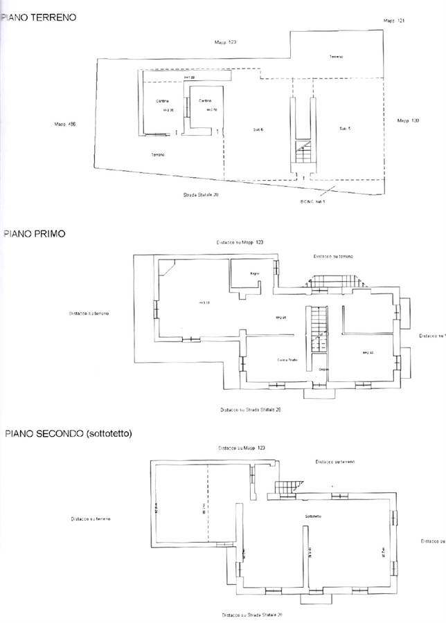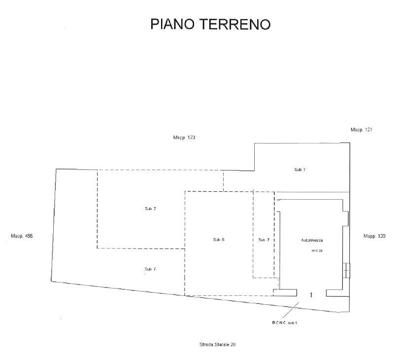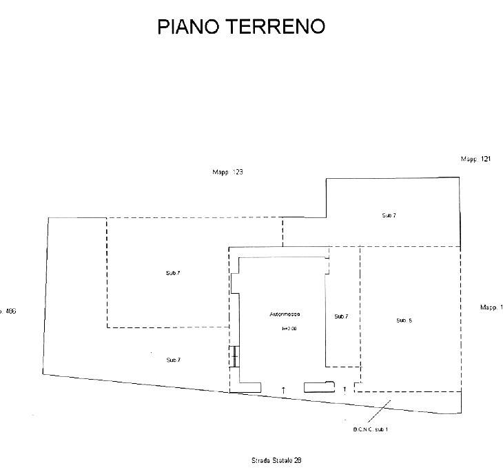 The house is spread over three floors, internally connected. The ground floor is divided into two garages and two cellars. The first floor houses the living quarters, which consist of an entrance hall, a living room, two bedrooms, and a bathroom, served by four balconies. The top floor of the house is structured into three large unfinished attic rooms, two of which can be converted into two additional habitable bedrooms. The house has a large adjacent garden measuring approximately 1,100 square meters, directly accessible from it.