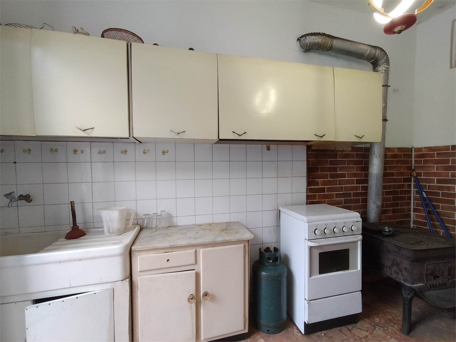 The second floor of the building consists of an apartment divided into a living room, a kitchen with a wood-burning stove, two connecting double bedrooms, and a bathroom with a window that can be accessed directly from the sleeping area.