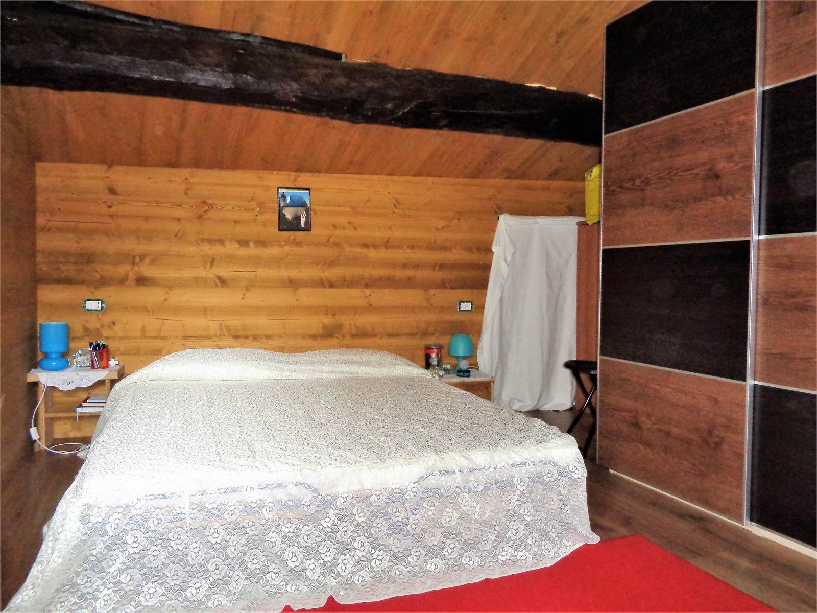 The internal staircase, which was rebuilt from scratch, leads to the second floor. The bedroom is tiled in porcelain stoneware and has exposed wood-paneled walls.