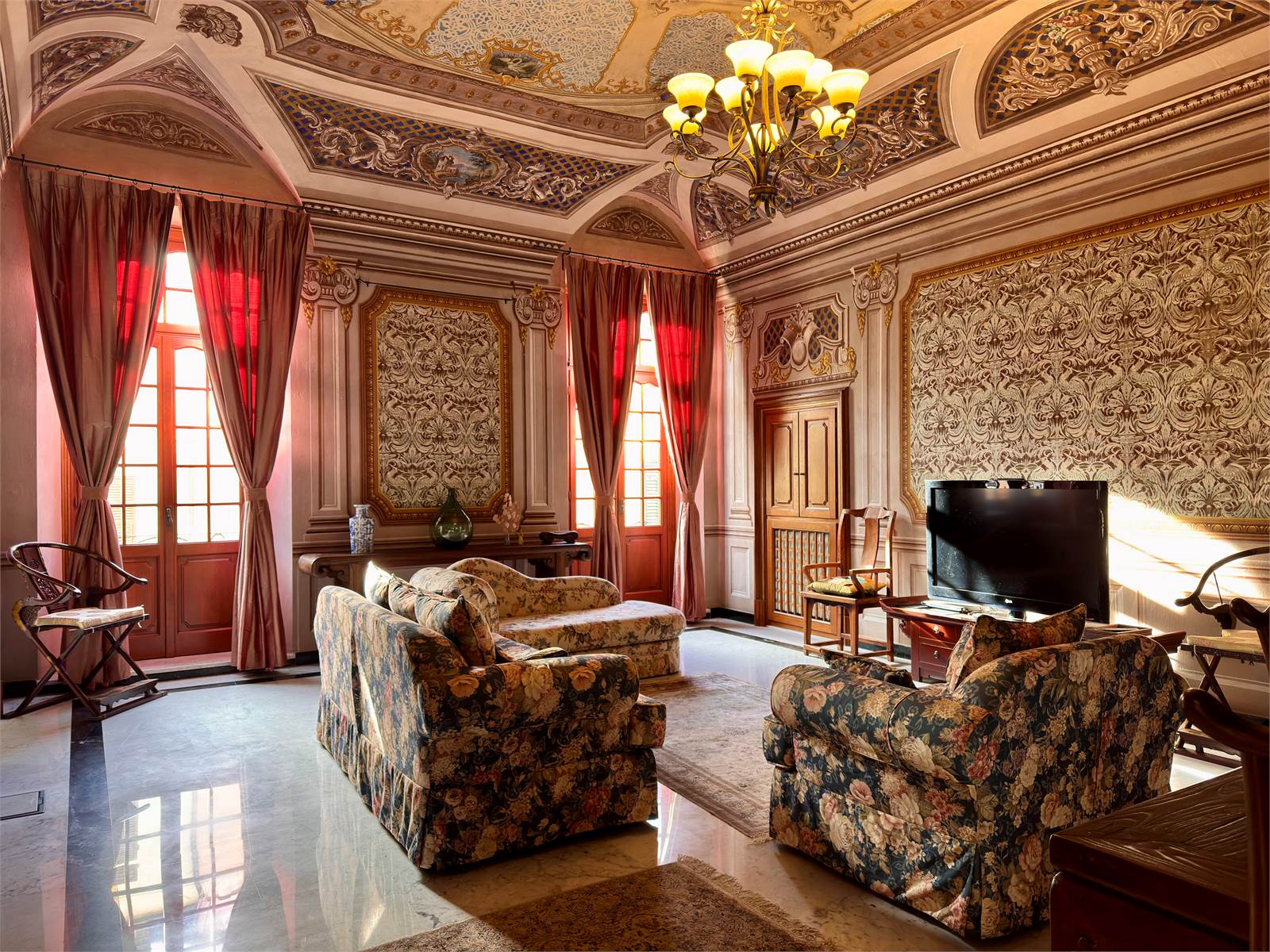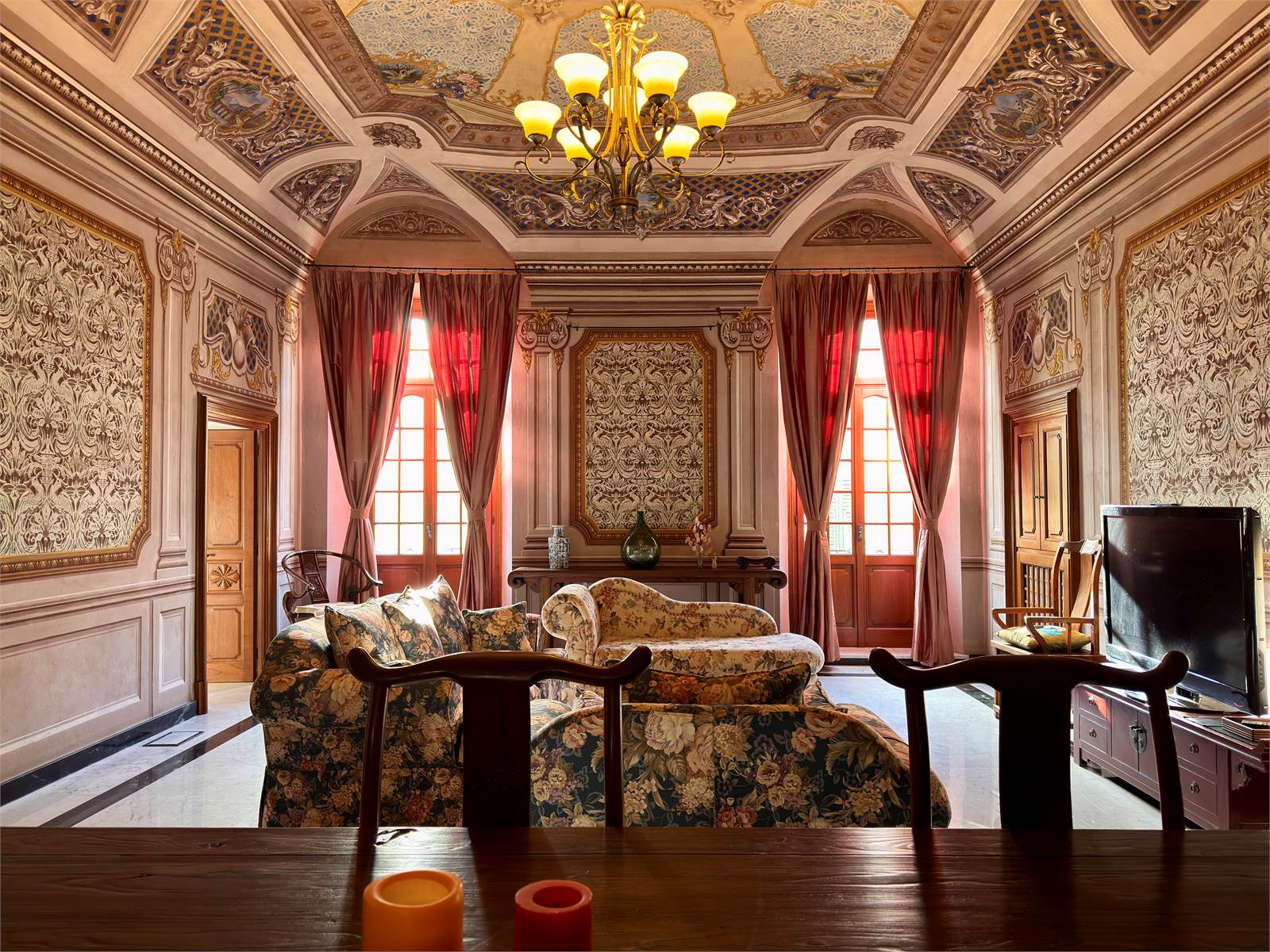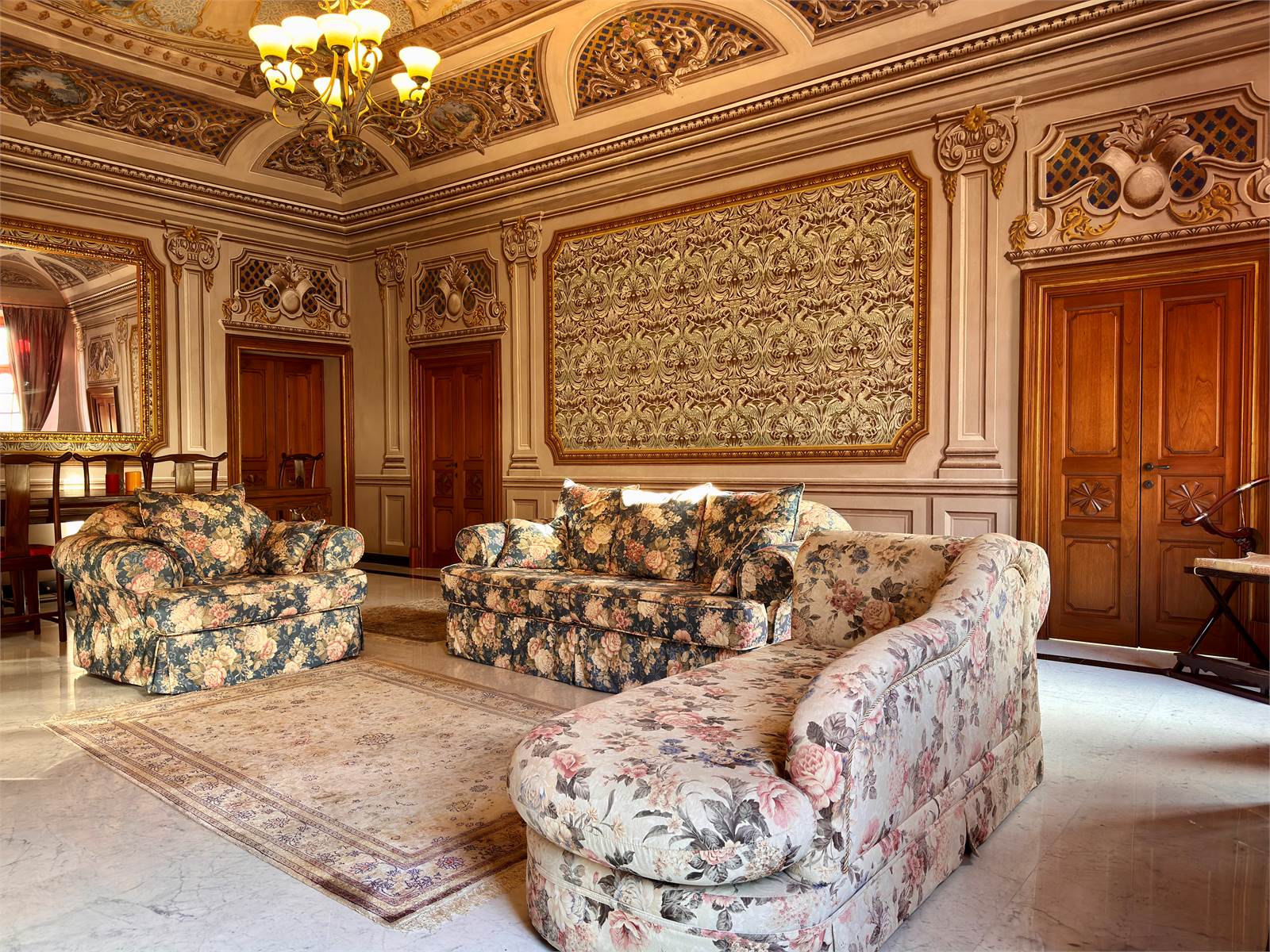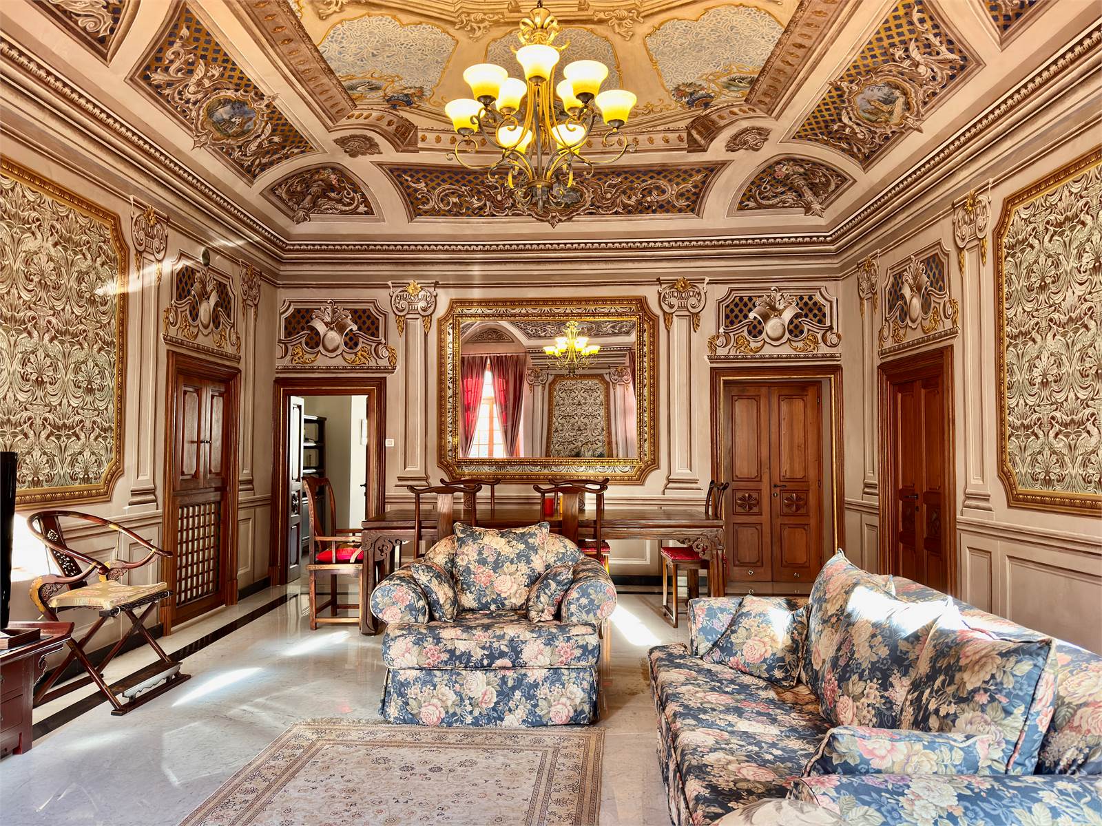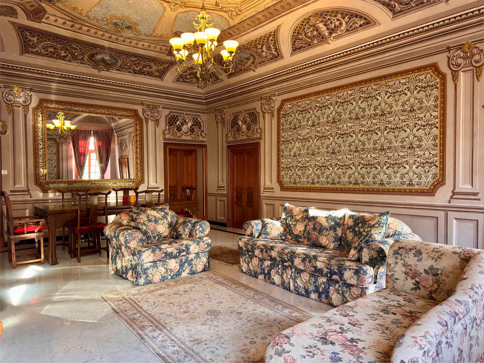 The corridors provide an orderly distribution of the various areas of the apartment, including a generously sized walk-in wardrobe. Carrara marble flooring, together with carpets, Chinese silk curtains, decorative elements and original Oriental furnishings, contribute to defining the spaces, making them suitable both for residential use and for representative purposes.