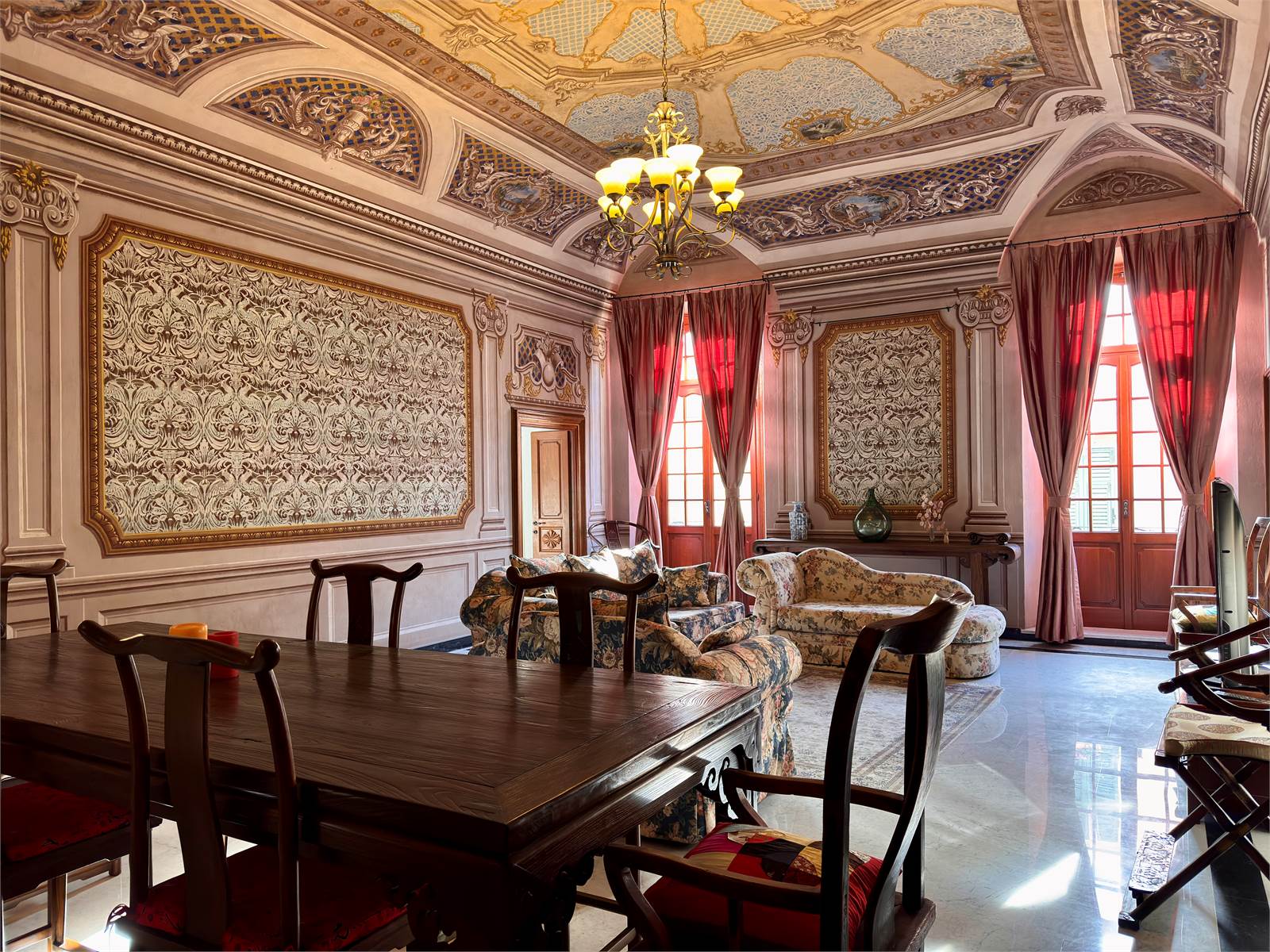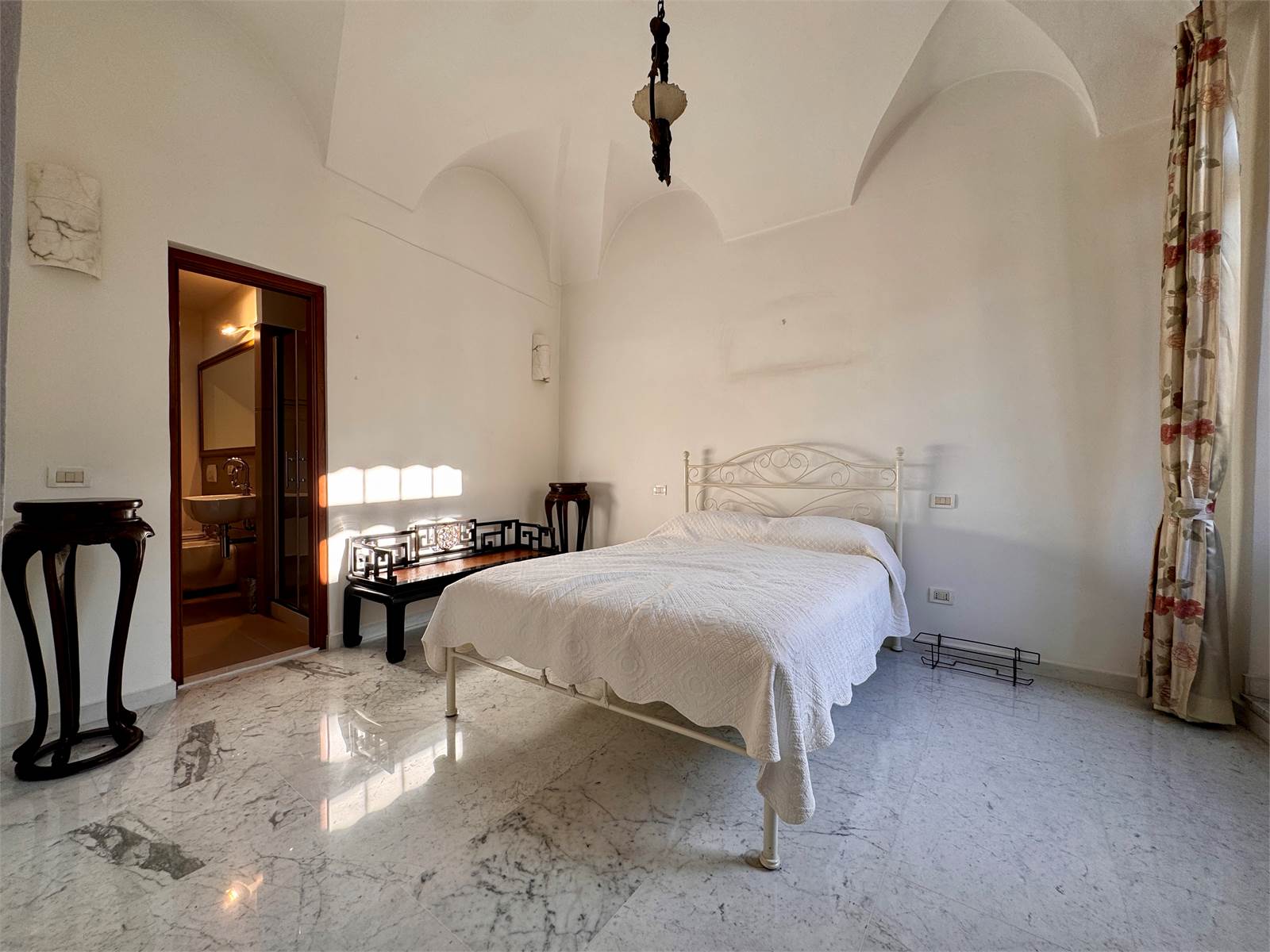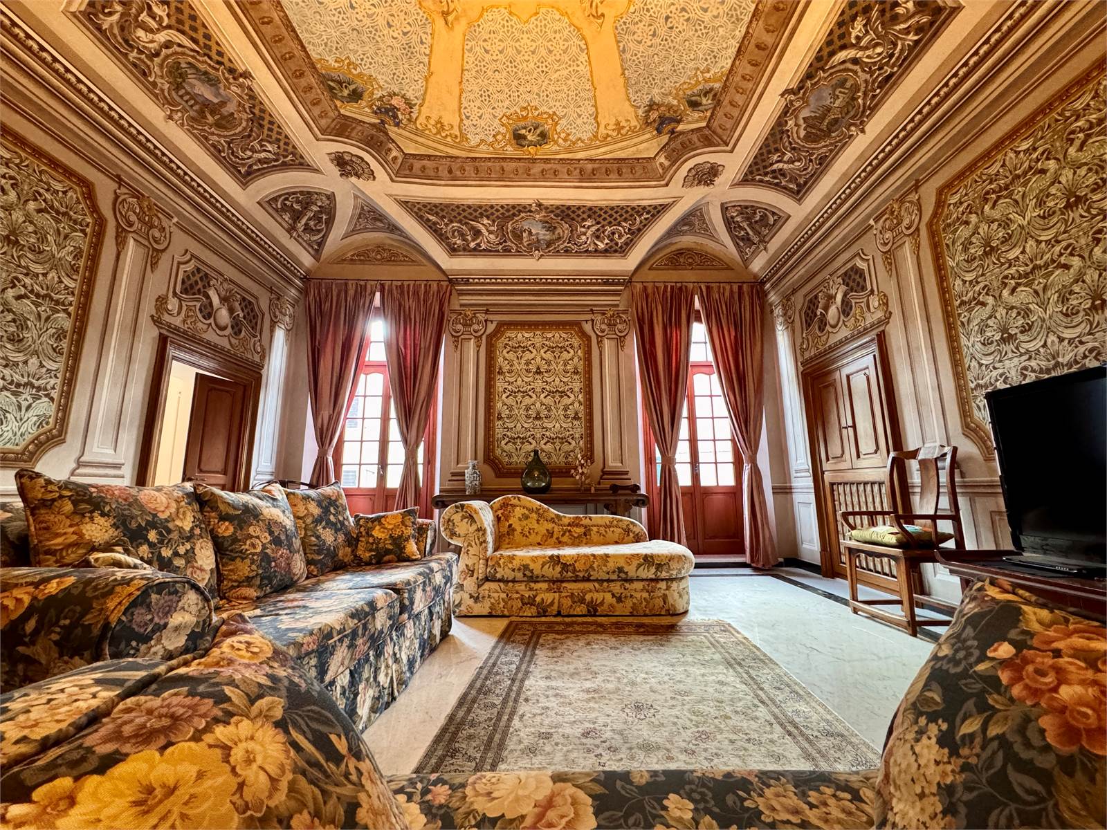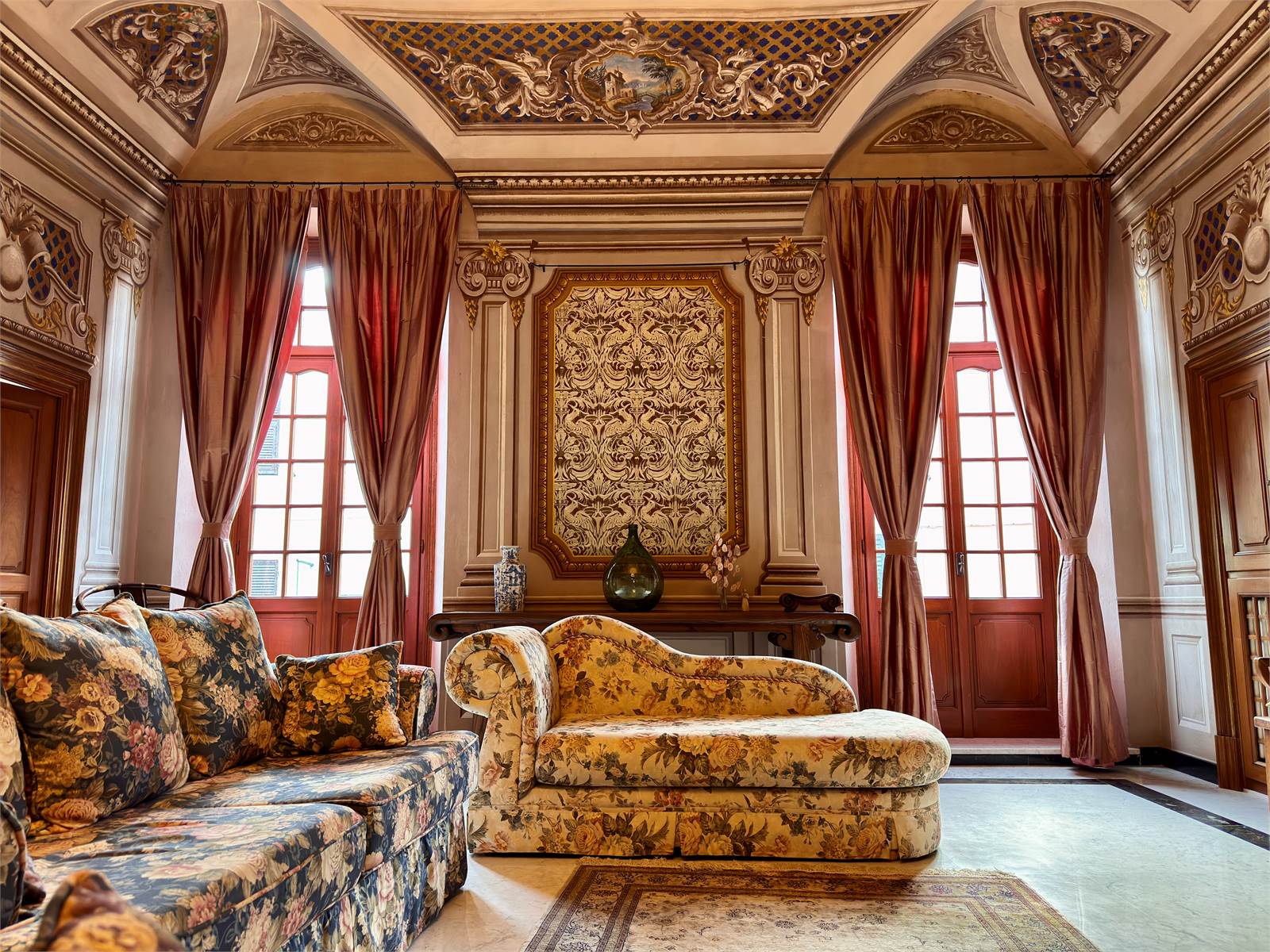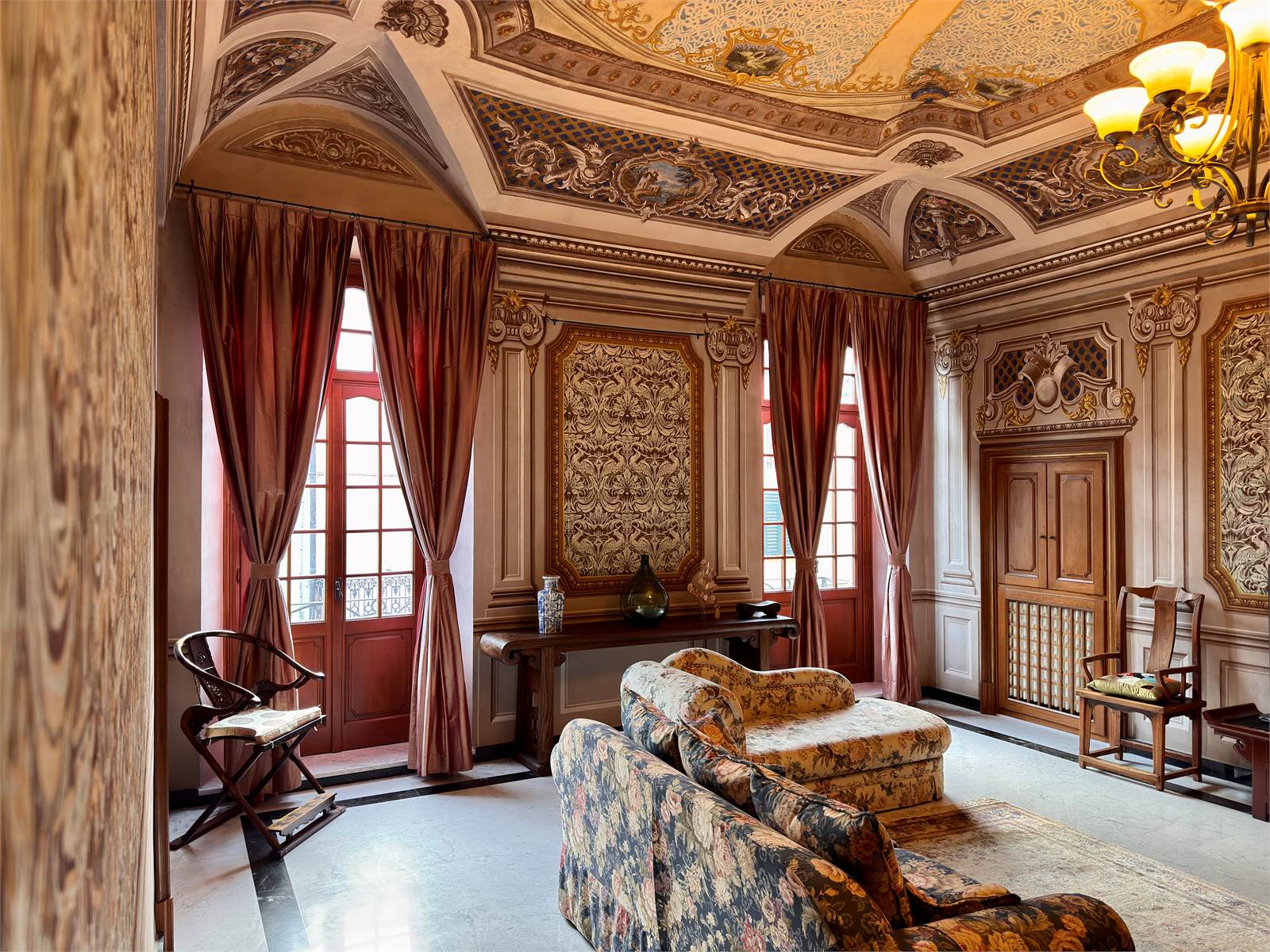 The property overlooks the arcades and features original architectural elements that define its character. The entrance opens onto a spacious living room with high ceilings, decorated with frescoes on walls and vaults executed by specialized craftsmen. The double exposure ensures good natural light through clerestory windows with access to small balconies overlooking the historic arcades.