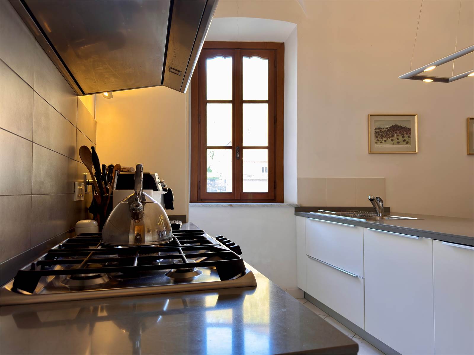 The sleeping area consists of two double bedrooms, each with its own en-suite bathroom, providing functionality and privacy. The kitchen is habitable and arranged with a central island; it is equipped with a dishwasher, refrigerator, washing machine and a wooden dining table. The room is served by a balcony overlooking the surrounding hillside and also benefits from an independent access from the stairwell, without passing through the main living room.