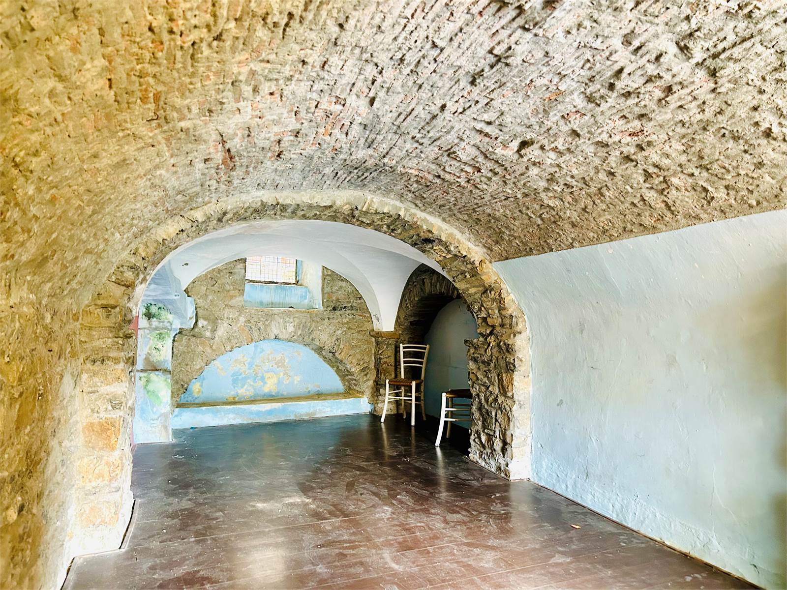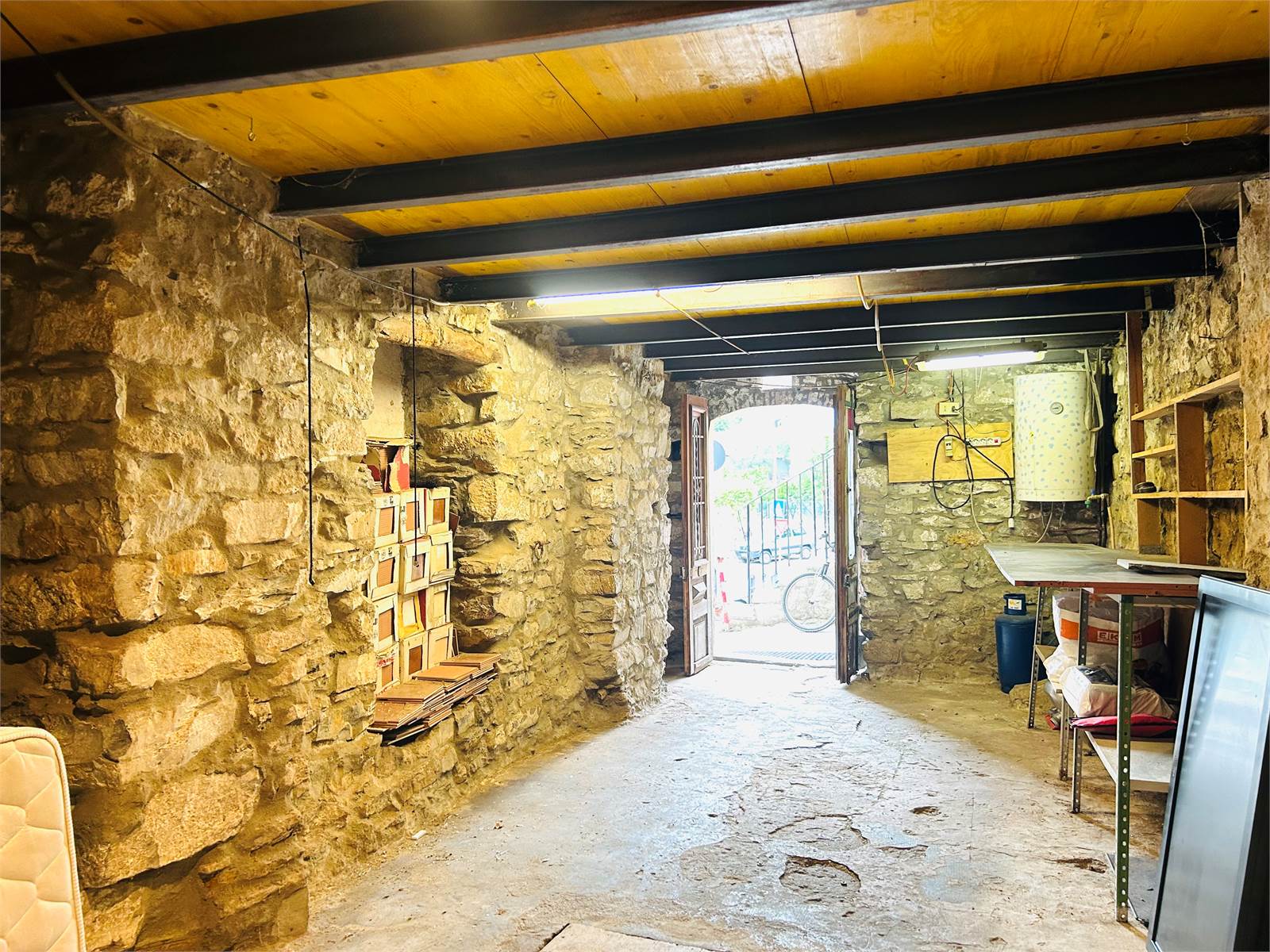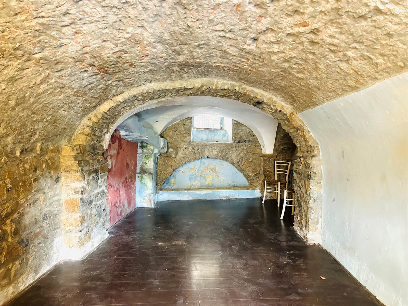 The shared entrance from the main street leads to the first floor, where there is a spacious room featuring a vaulted exposed stone ceiling and wooden flooring.