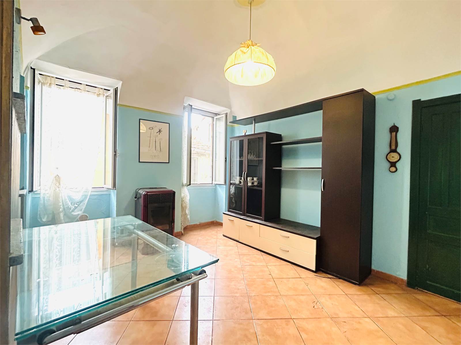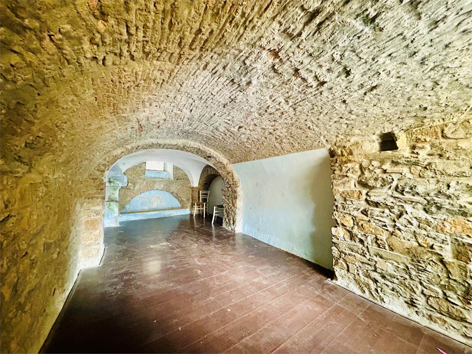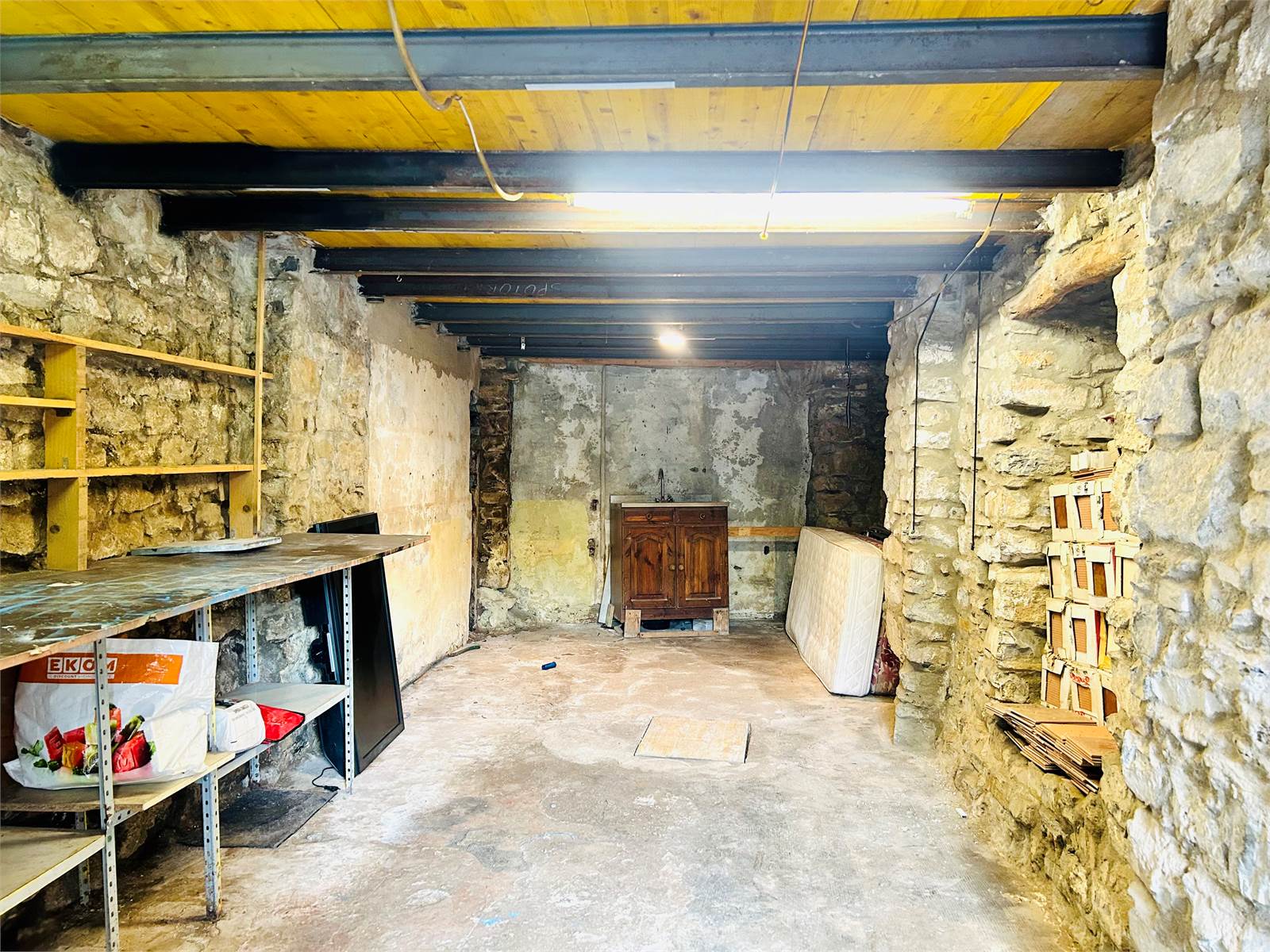 The shared entrance from the main street leads to the first floor, where there is a spacious room featuring a vaulted exposed stone ceiling and wooden flooring.