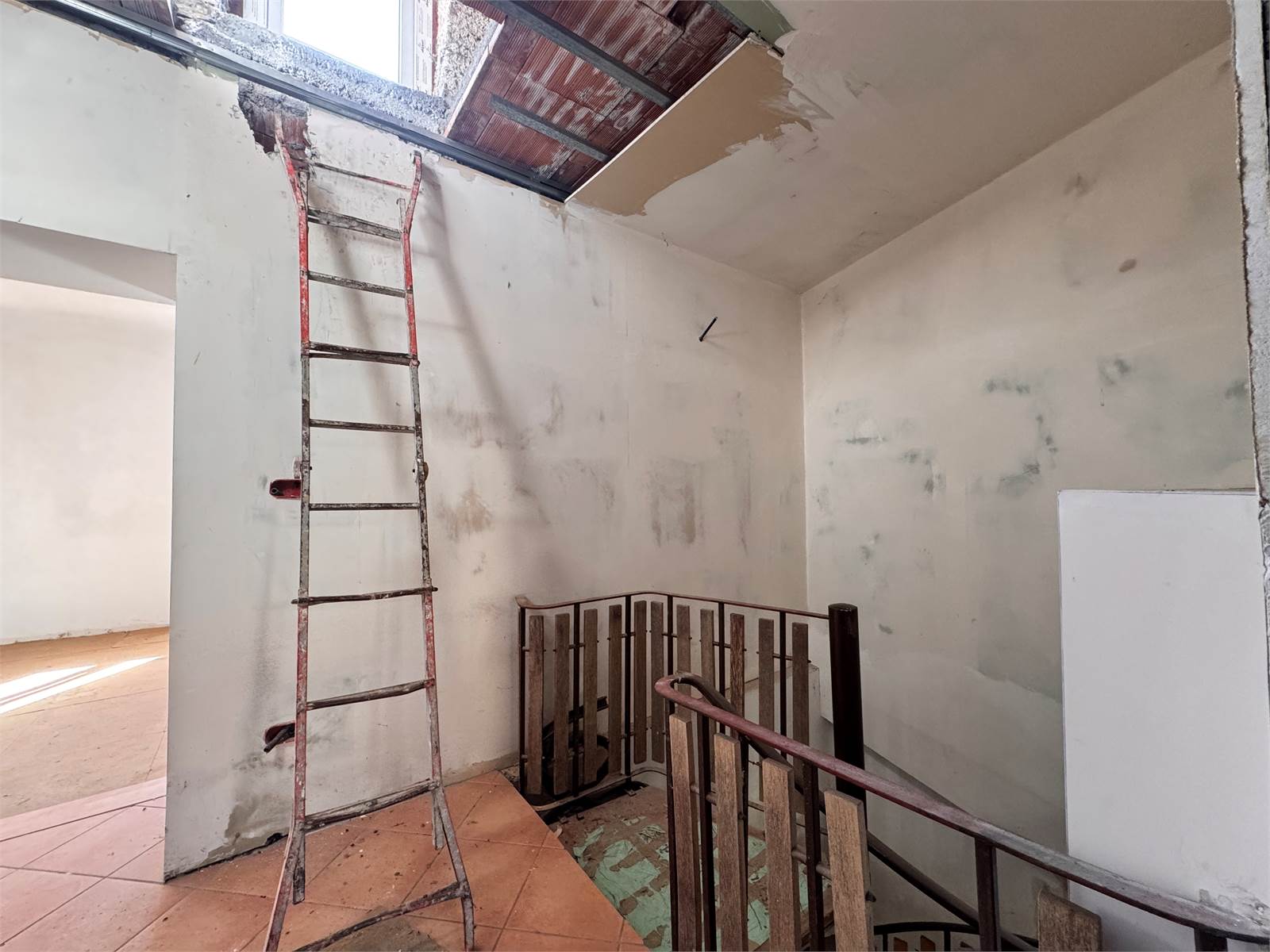 The property is divided into multiple levels, connected internally by a well-maintained wooden staircase, which acts as a hallway providing access to the various areas of the house. On the first floor, there is a small entrance lounge, a bathroom, and a bedroom.