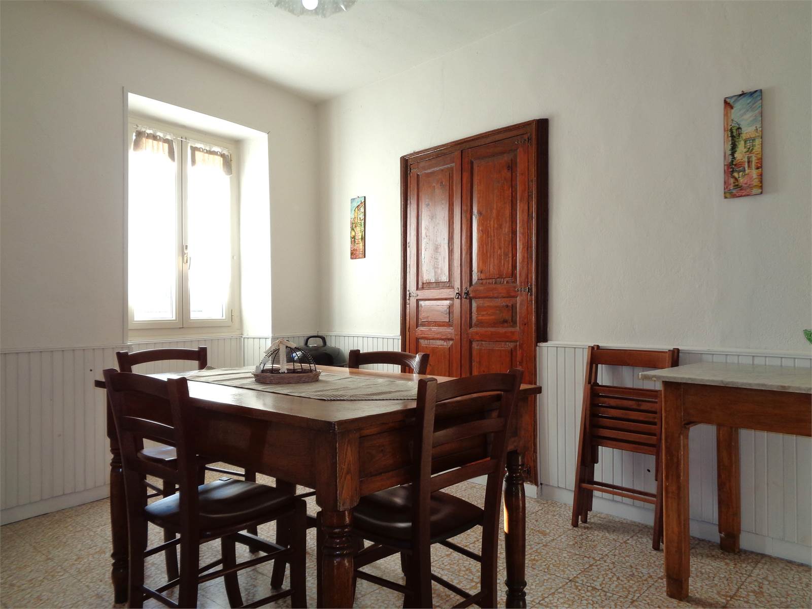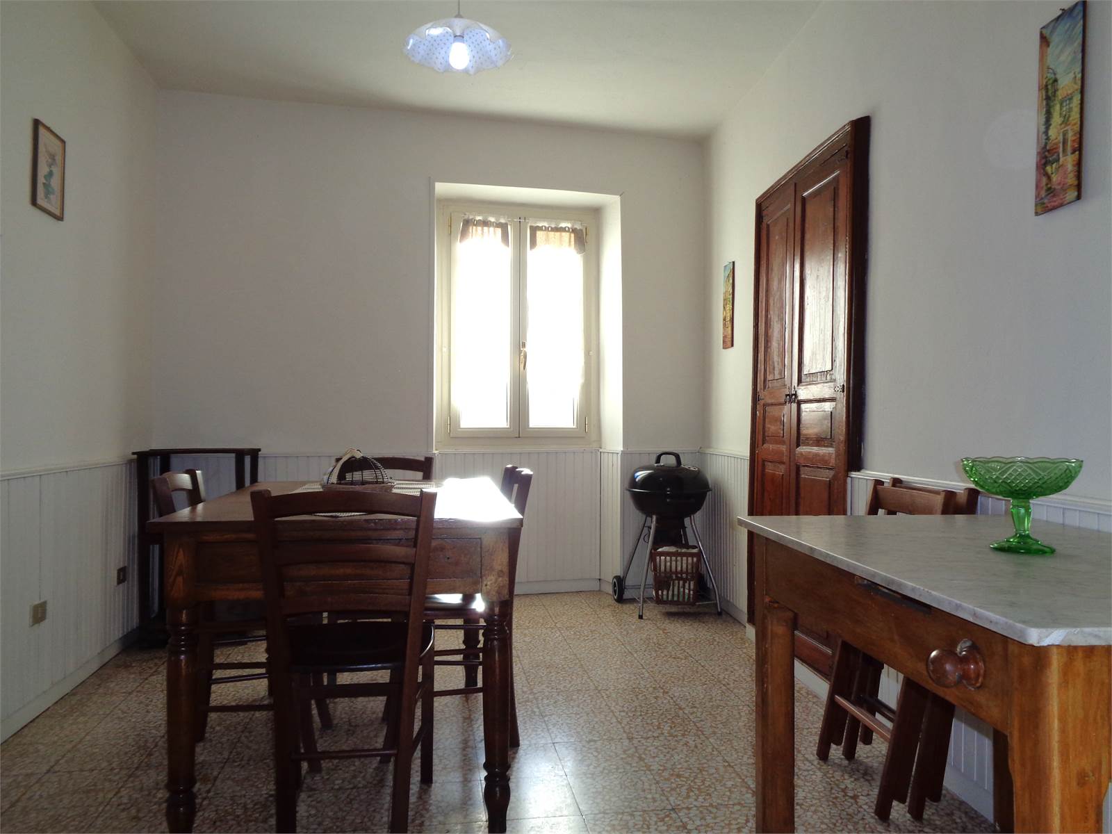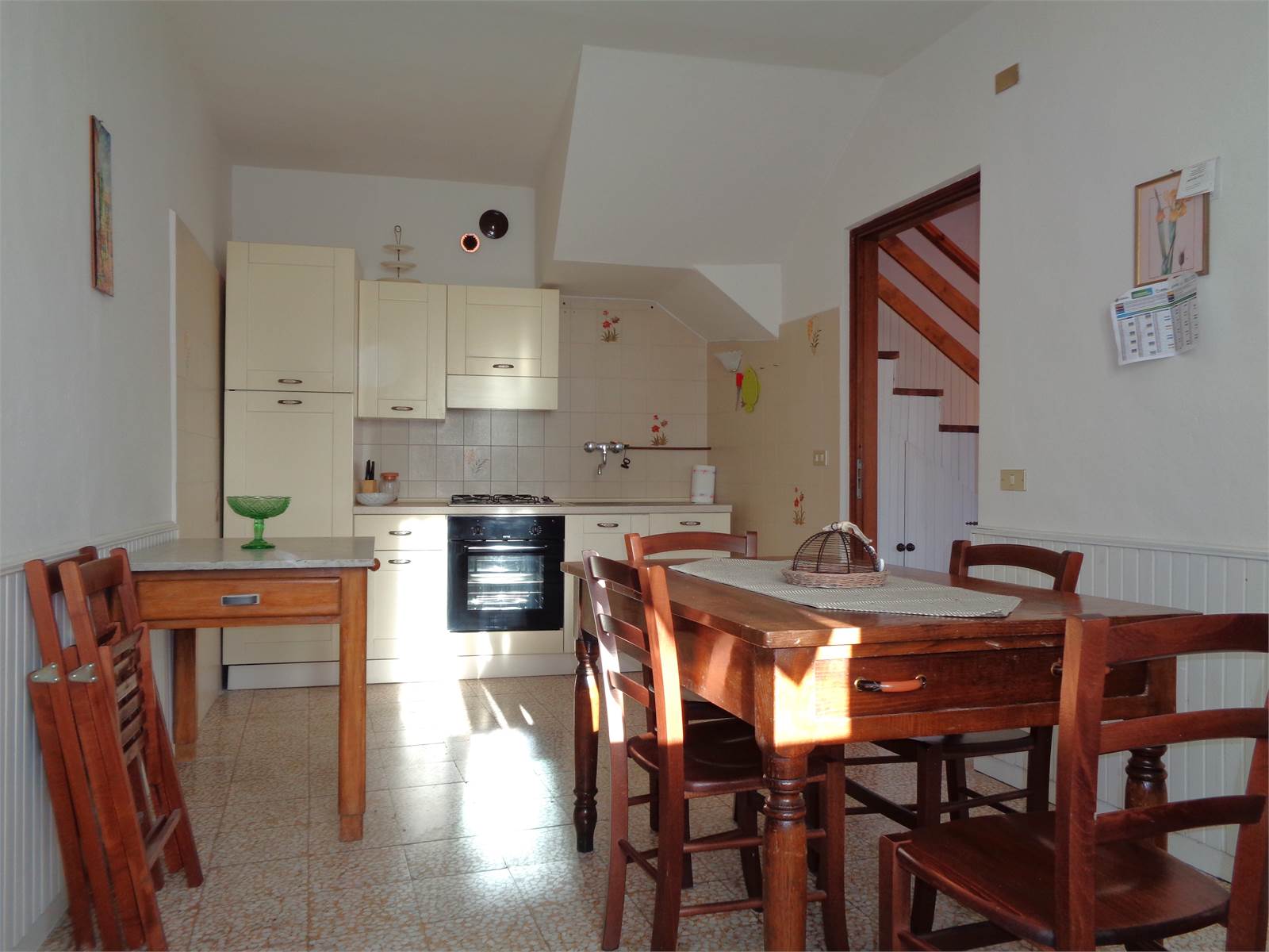 The entrance is on the mezzanine floor of the house and leads directly into the living area. The living room is made bright by the two windows on the two free sides of the house and is equipped with a connection and drain for the washing machine that was created in the adjacent understairs. The kitchen is directly connected to the living room and has space to contain a table and the equipped wall, as well as having a small pantry created in the built-in wardrobe with an antique wooden door.