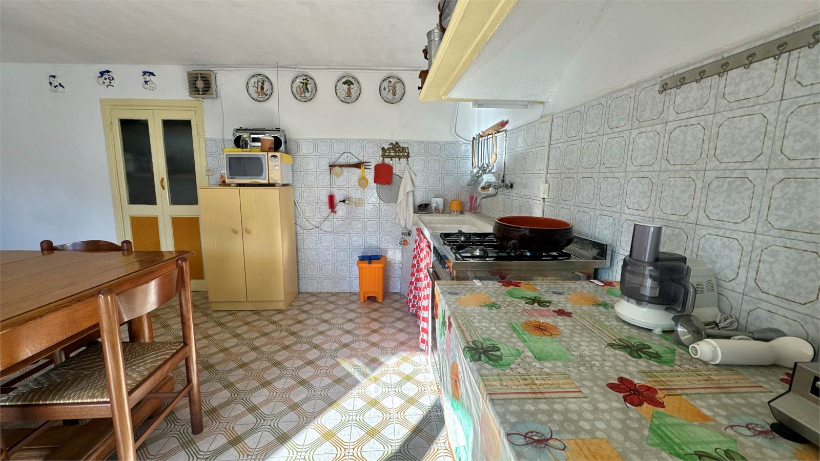 The house was renovated in the 1970s; the finishes and systems are functional but date back to that period. A gas boiler for domestic hot water is installed in the attic, and the property has no heating system.