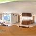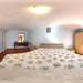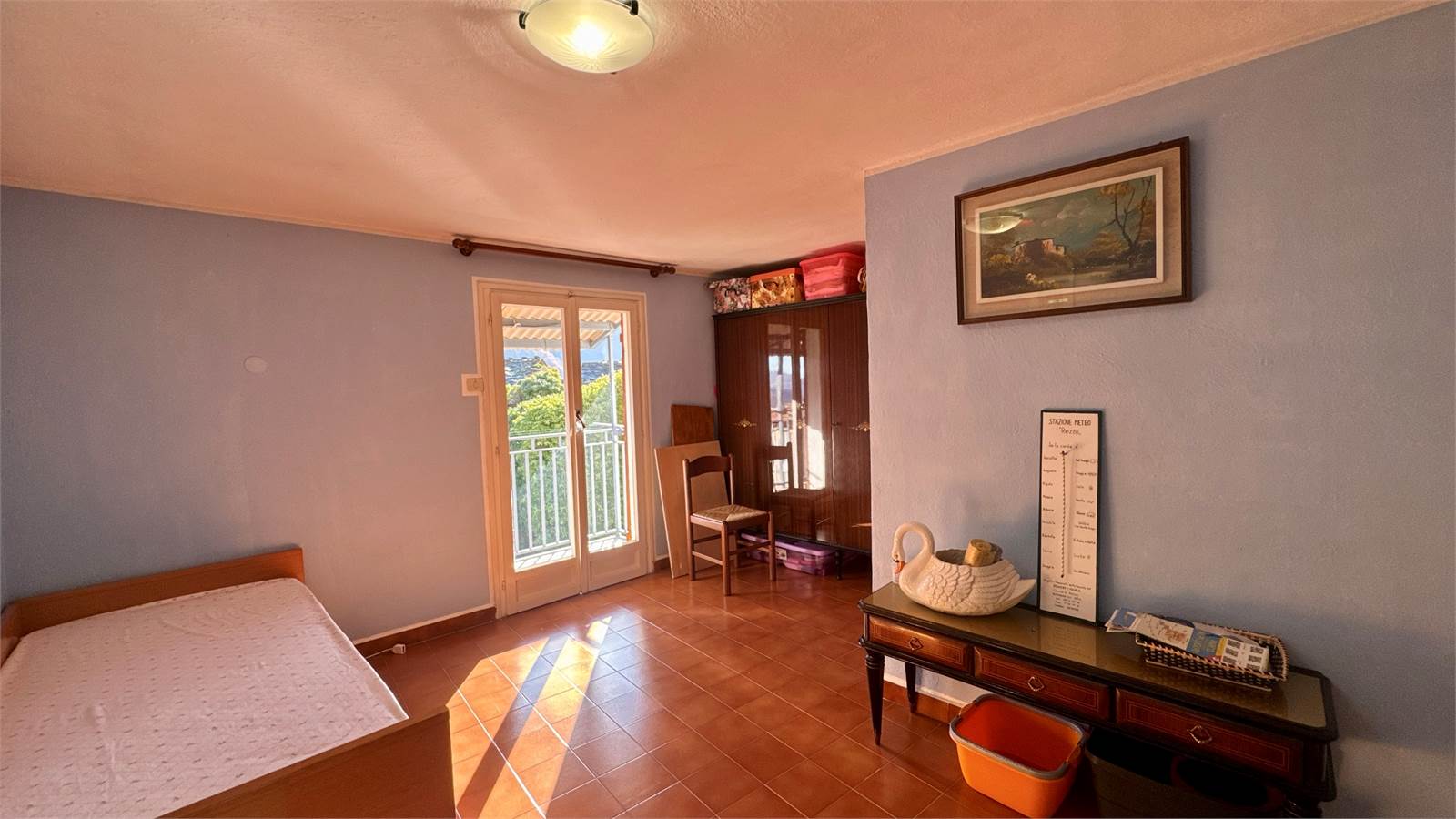 The upper floor hosts the sleeping area, consisting of a windowless bathroom equipped with a bathtub and two double bedrooms, both with access to the balcony overlooking the valley.