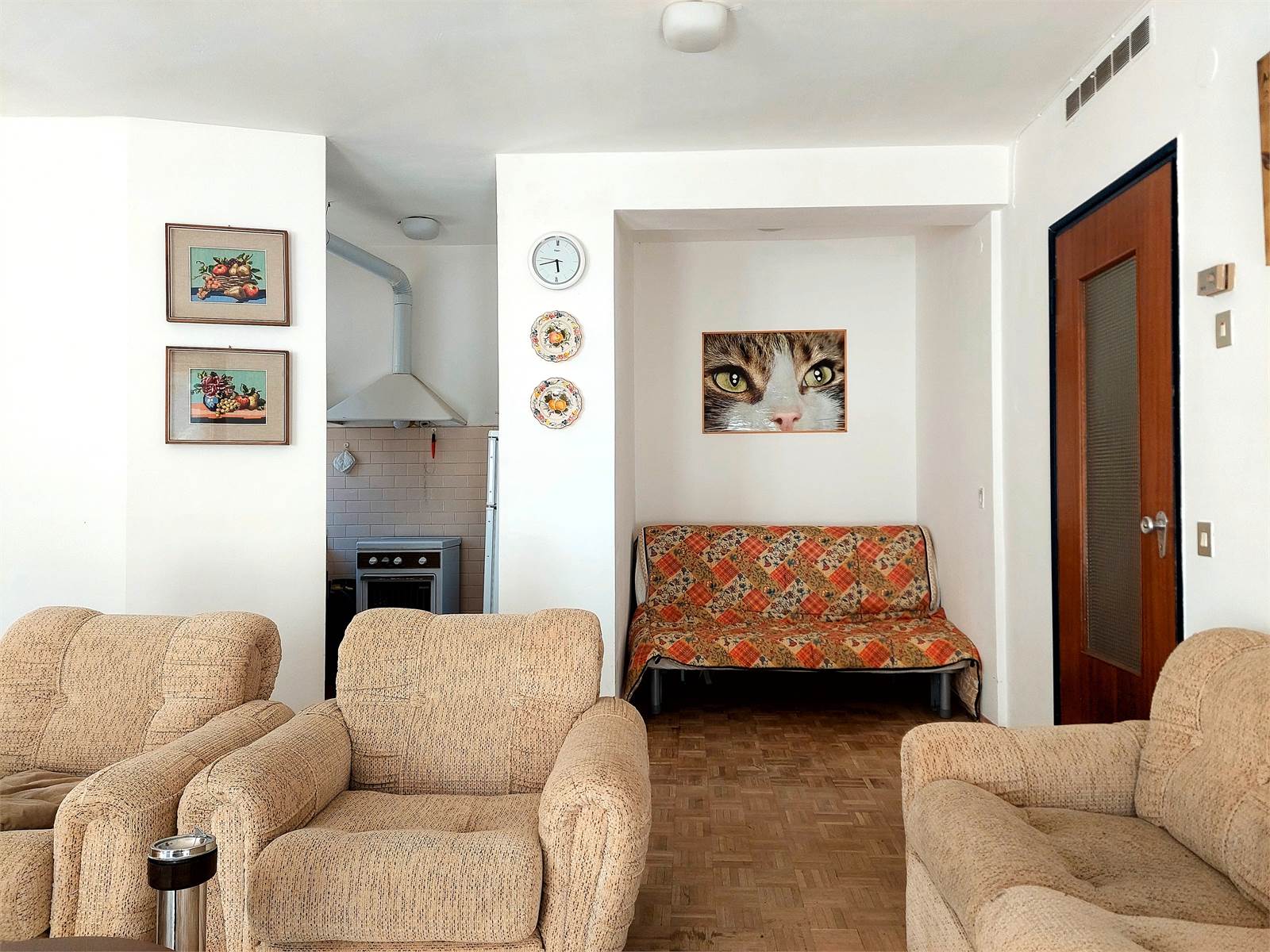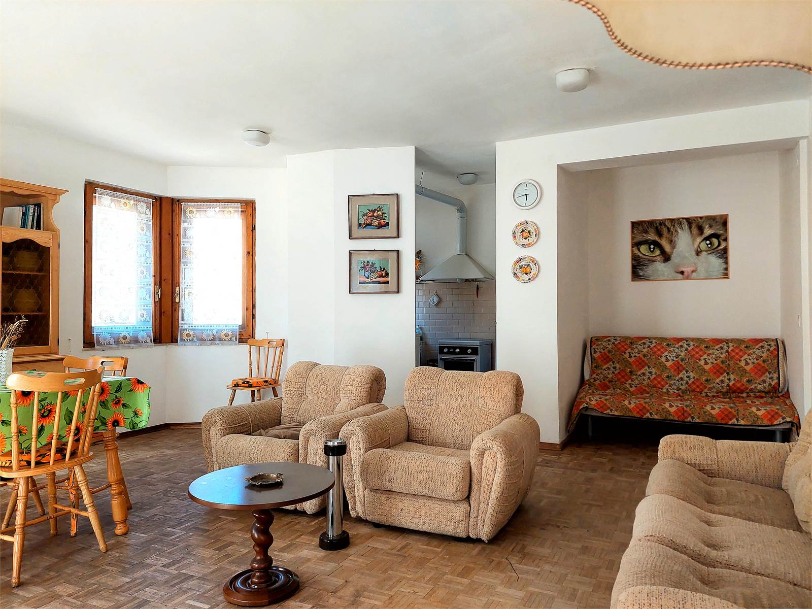 The apartment has double wooden windows and parquet flooring in the living and sleeping areas.