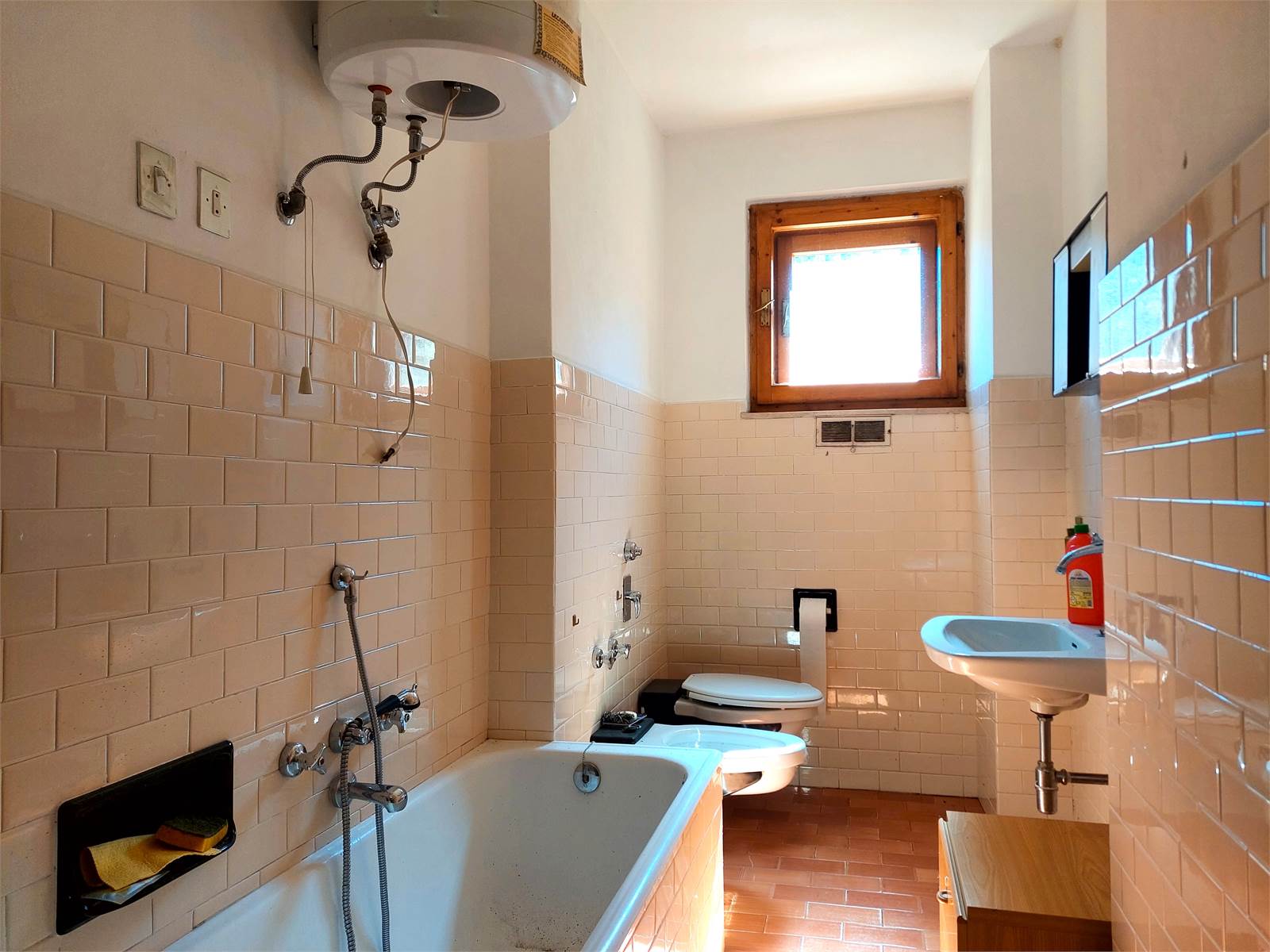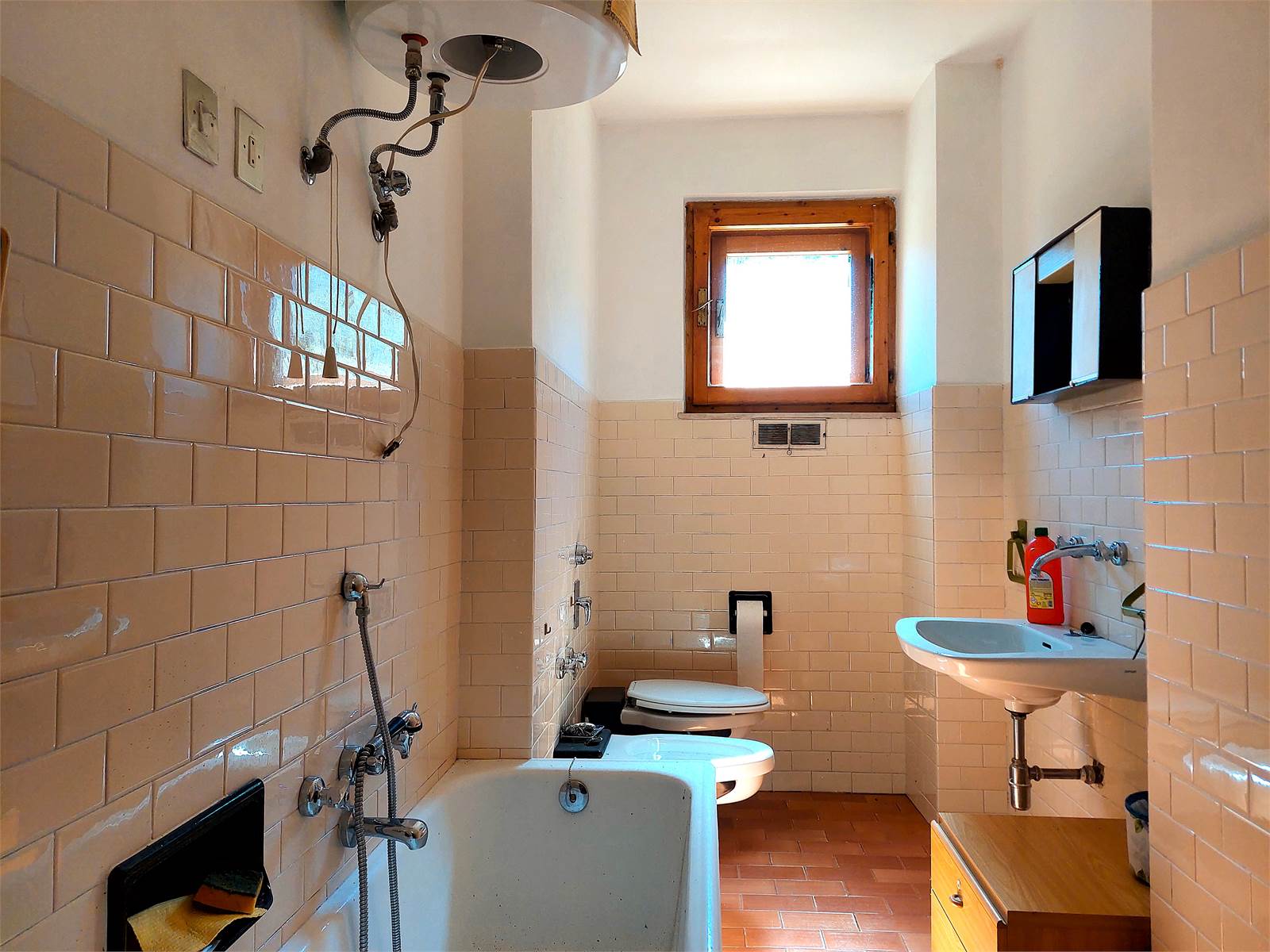 The bathroom has a window and a bathtub and it's in need of renovation.