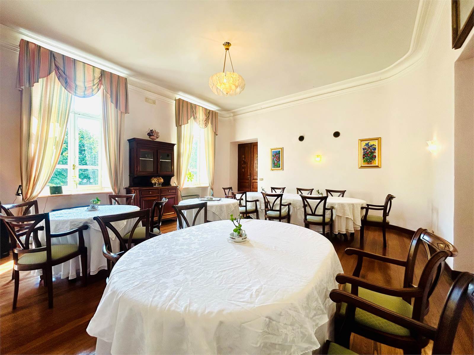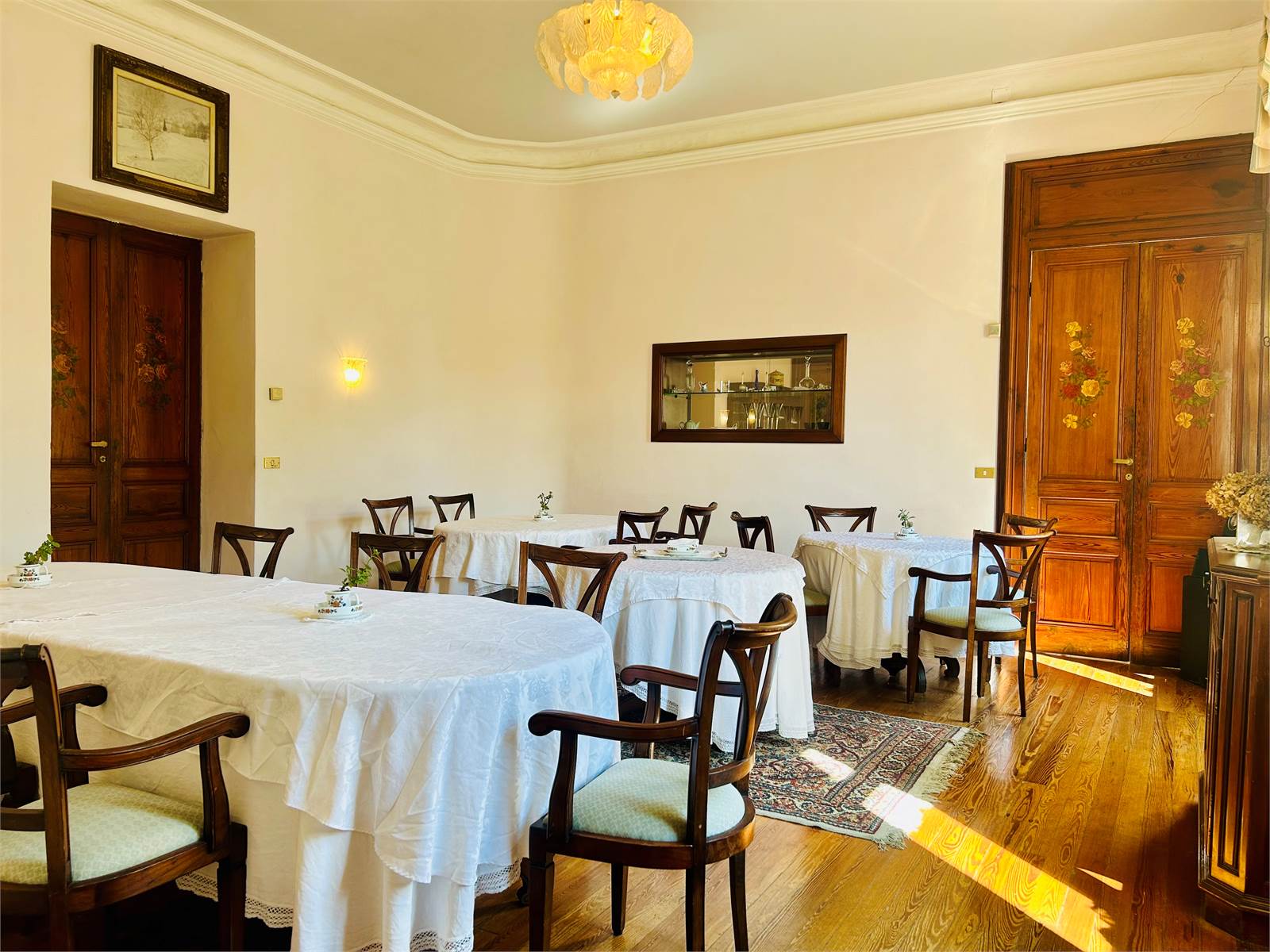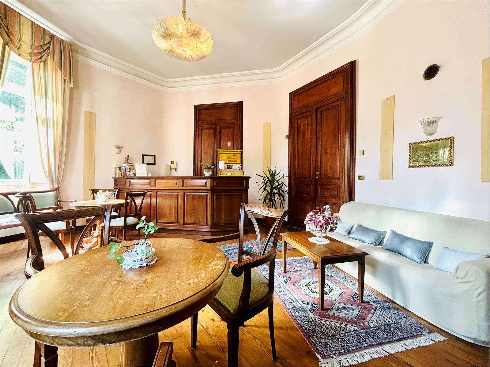 Il primo ambiente che ci accoglie è la reception finemente arredata, che introduce ai due ampi saloni da pranzo luminosi e caratterizzati dal parquet in legno, ideali per essere utilizzati per piccoli eventi, incontri o attività di gruppo.