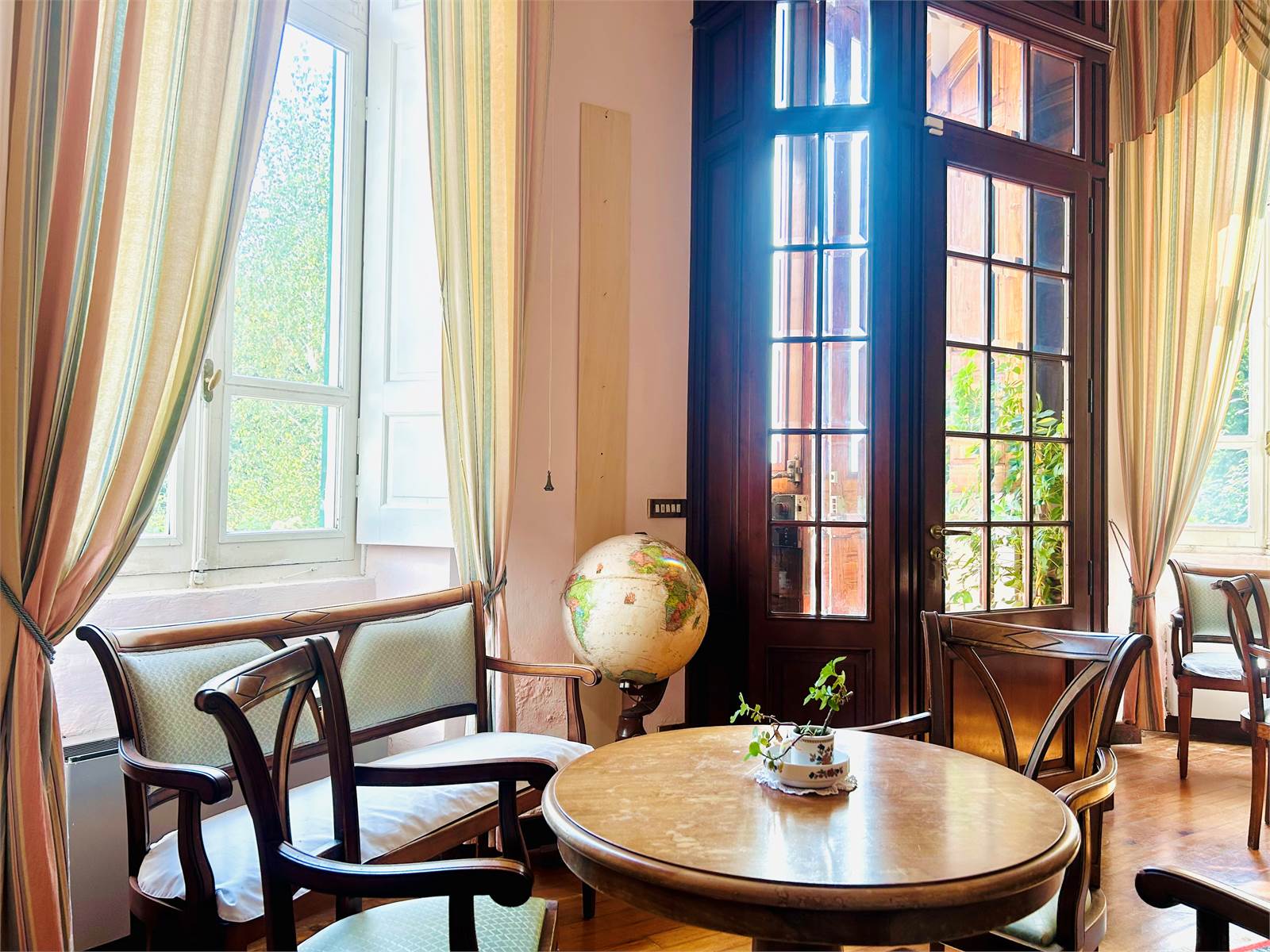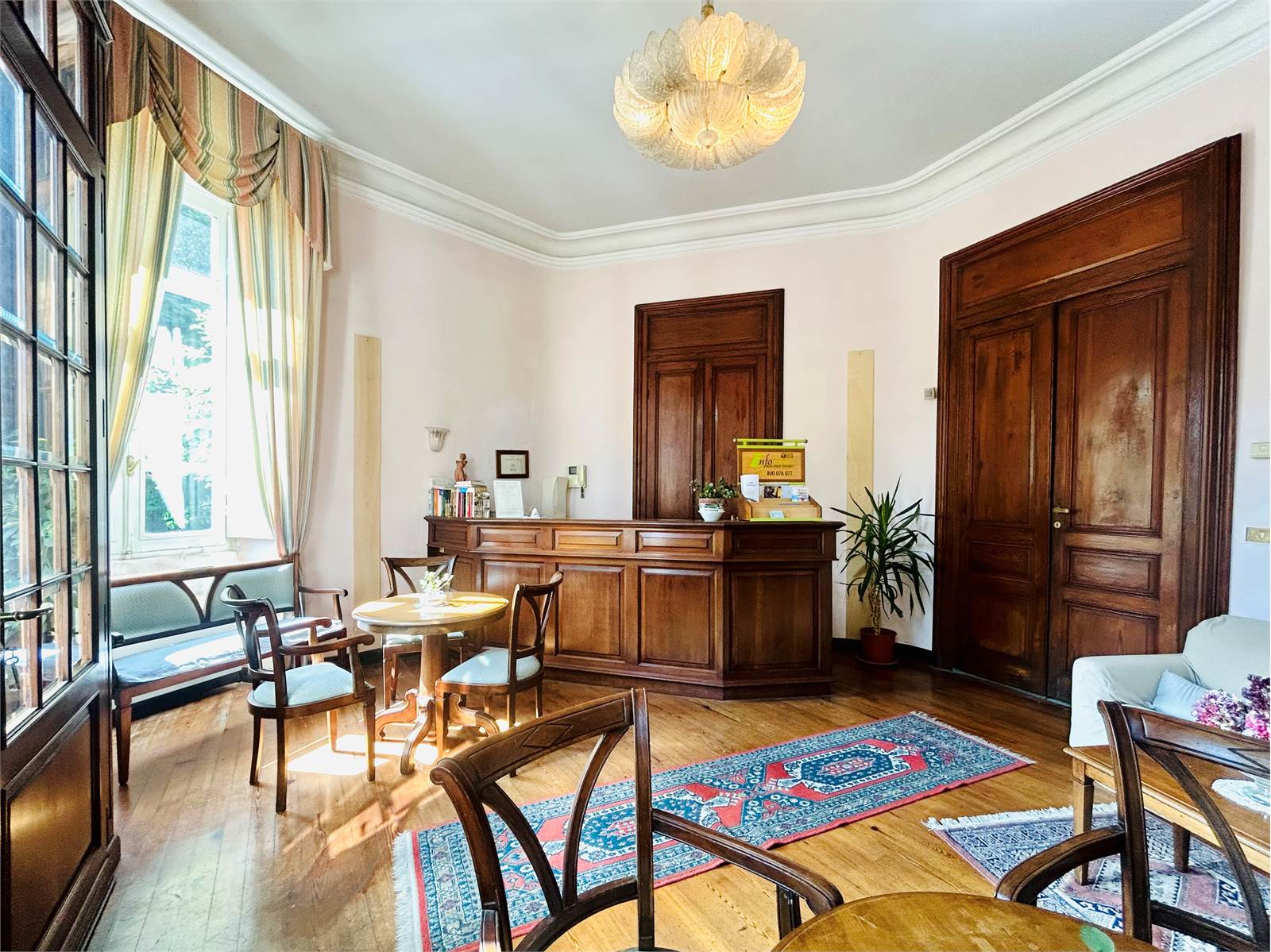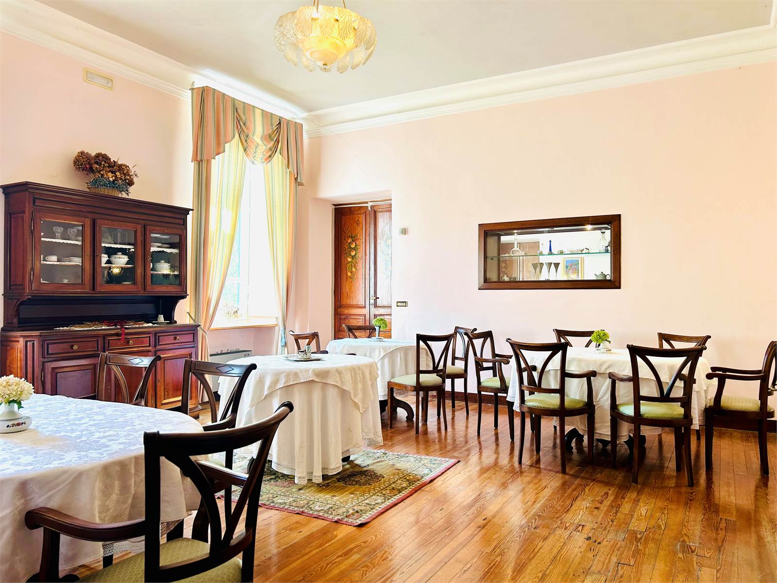 Il primo ambiente che ci accoglie è la reception finemente arredata, che introduce ai due ampi saloni da pranzo luminosi e caratterizzati dal parquet in legno, ideali per essere utilizzati per piccoli eventi, incontri o attività di gruppo.