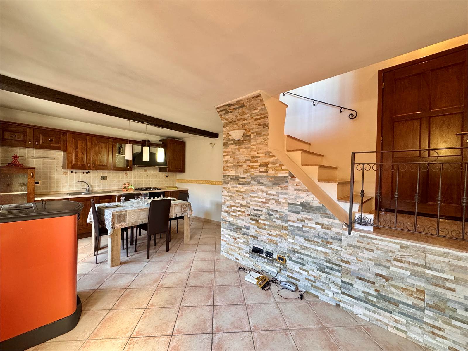 Al piano terra si trova un’ampia zona giorno con cucina a vista e il bagno principale, completo di box doccia e vasca. La cucina è accessoriata con tutti gli elettrodomestici (forno, lavastoviglie, frigorifero, ecc.).