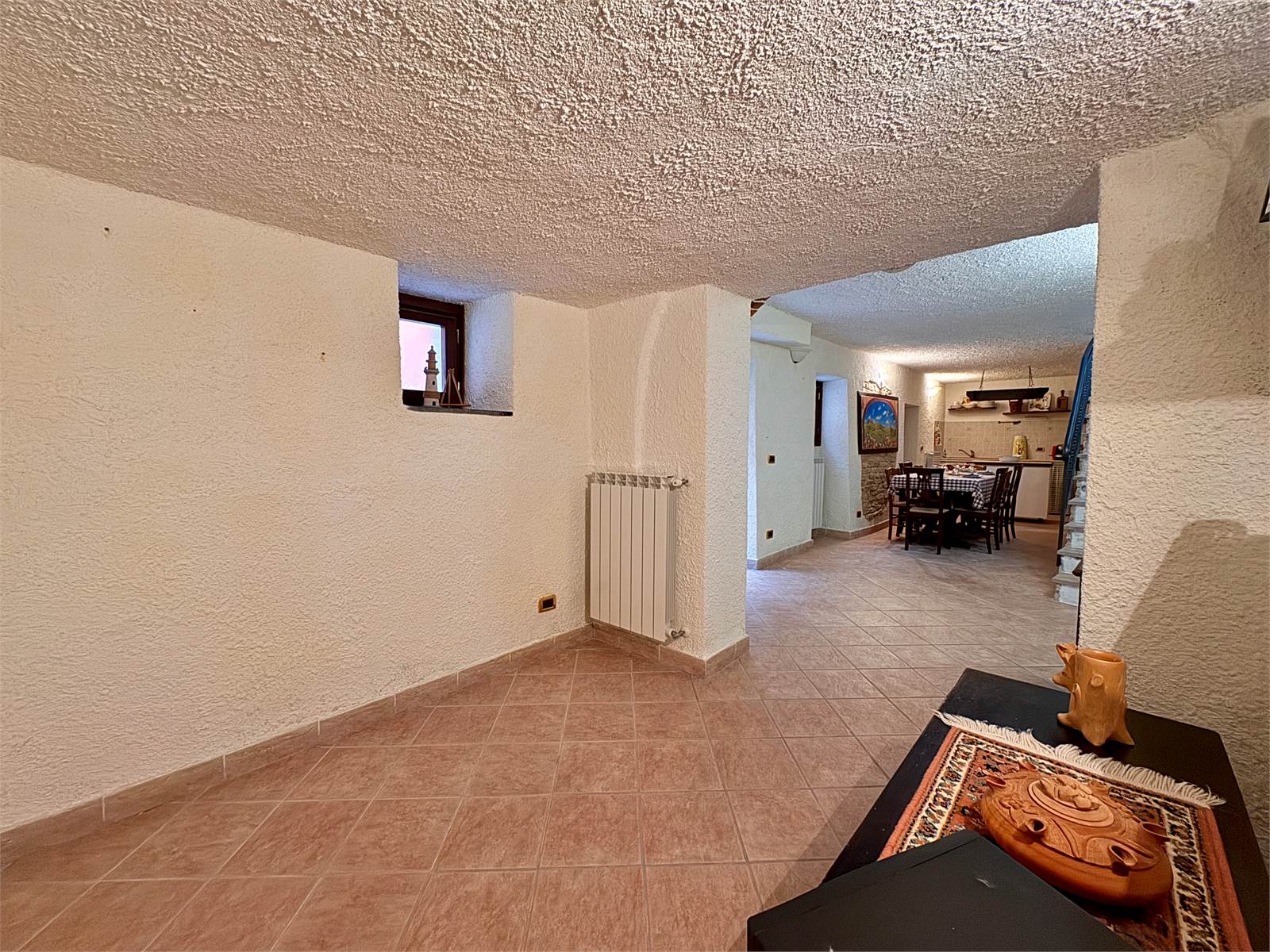 Al piano sottostrada, collegato internamente tramite scala in muratura, si trova la spaziosa taverna, completa di cucina, stufa a legna e un grande tavolo per circa 10 persone. Questo livello dispone di doppia porta finestra con accesso diretto al vicolo sotto la piazza, oltre a bagno con box doccia e ripostiglio.