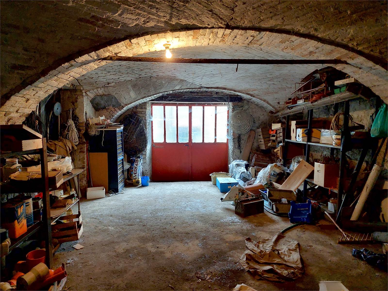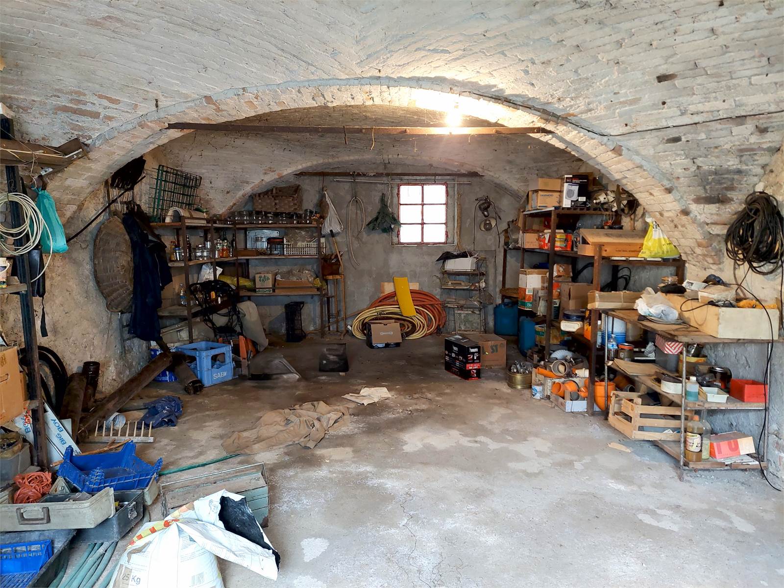 Il piano seminterrato del fabbricato è accessibile a piedi tramite una scala privata esterna e con dei mezzi attraverso il cortile comune che si trova sul retro della casa. Tre vani con un totale di 120 metri quadrati di superficie occupano il piano e, la loro metratura ed il fatto che ogni locale è dotato di un portone carrabile, permettono di utilizzare questo spazio come multi-garage, magazzino o laboratorio.