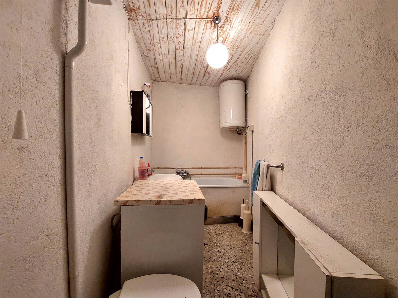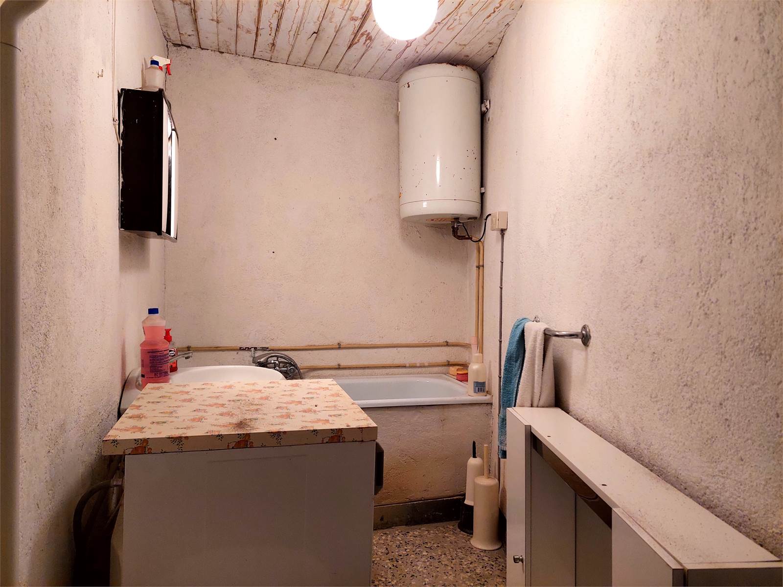 E' presente un solo bagno senza finestra e con vasca e lavatrice, che è stato ricavato nel vano scala.