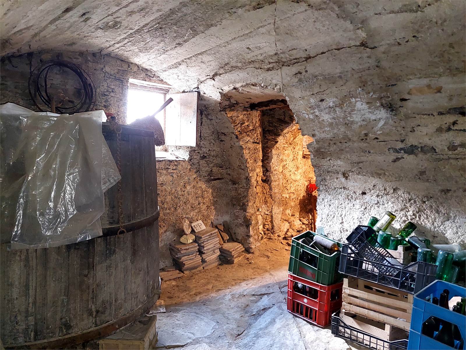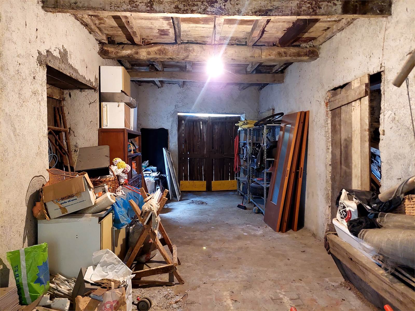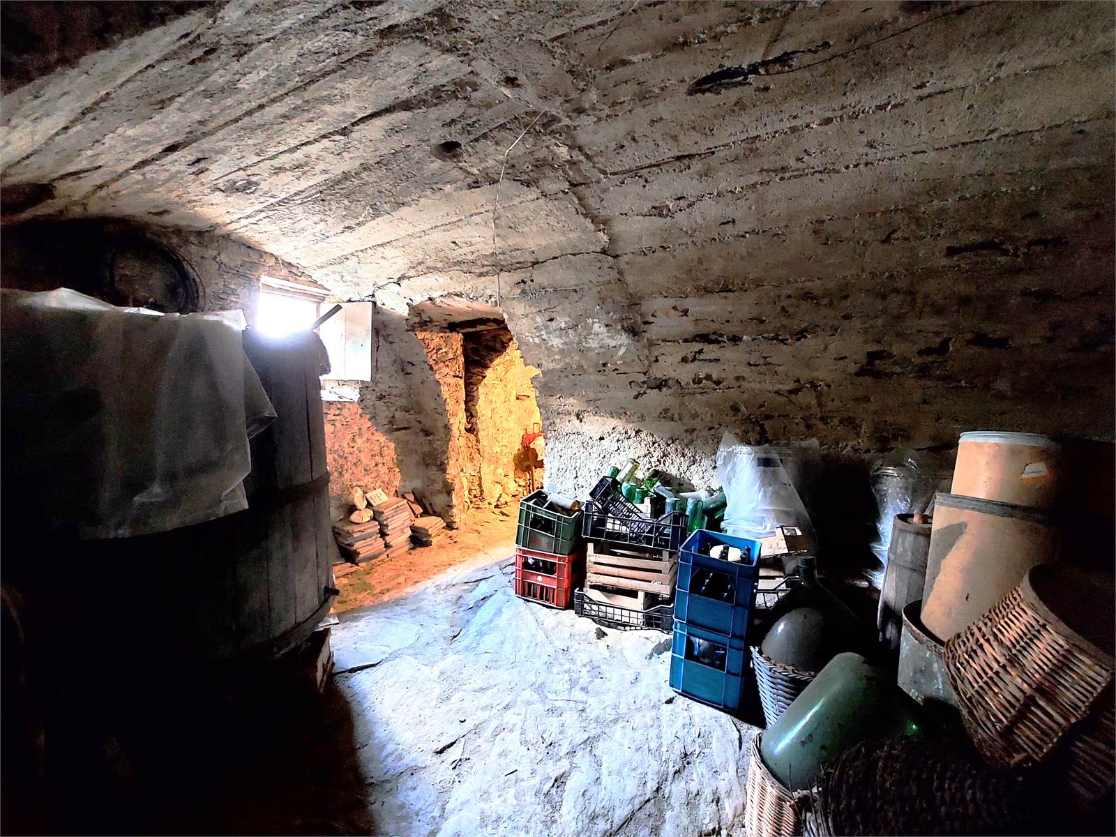 Il piano terra del fabbricato è suddiviso in quattro ambienti distinti utilizzati come cantina e deposito, il più grande dei quali ha il portone che si apre sulla piazza e può essere utilizzato come garage per due autovetture.