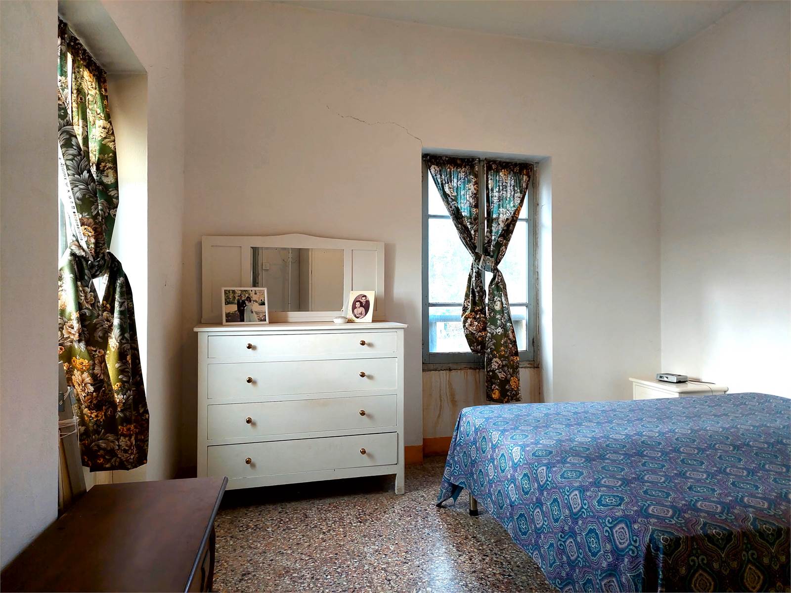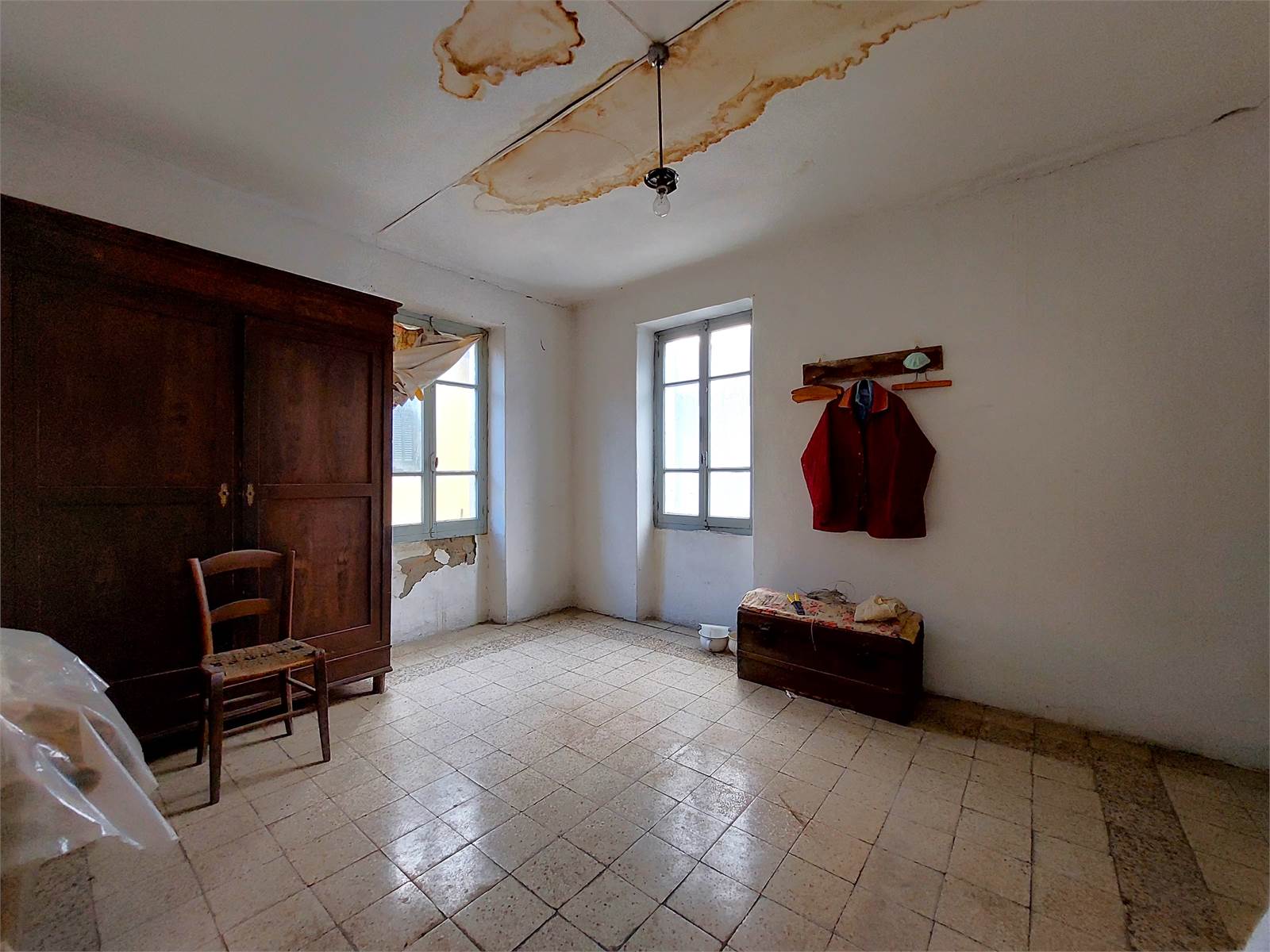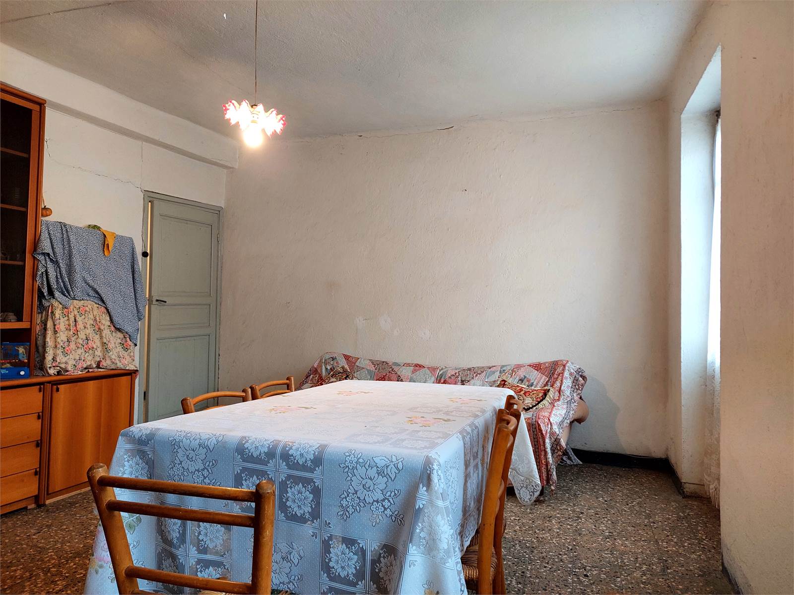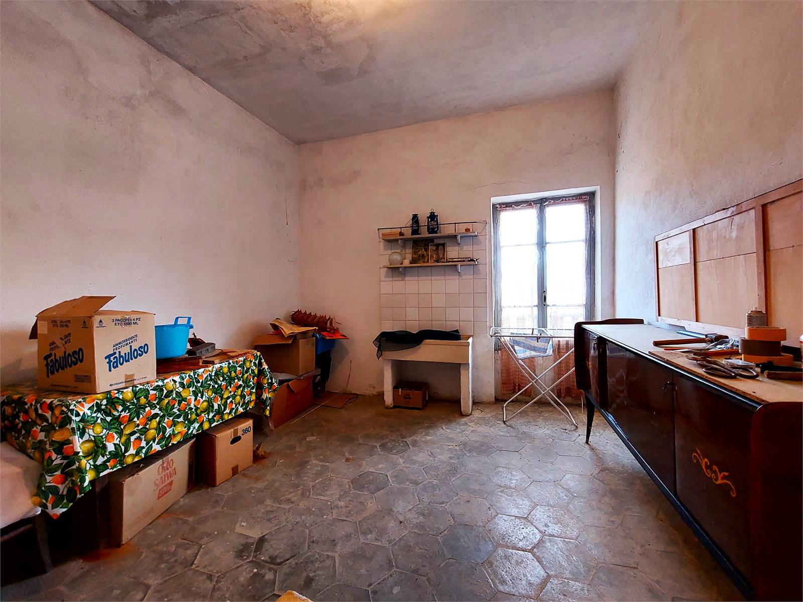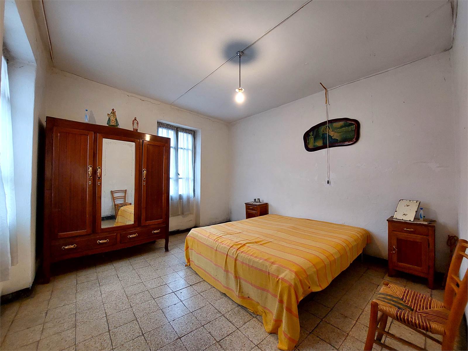Il primo piano della casa misura oltre 150 metri quadrati ed è suddiviso in due stanze grezze oltre ad un appartamento con corridoio, cucina, salone e due camere. L'alloggio è ben tenuto ma gli impianti tecnologici e i materiali risalgono ai primi anni Sessanta.